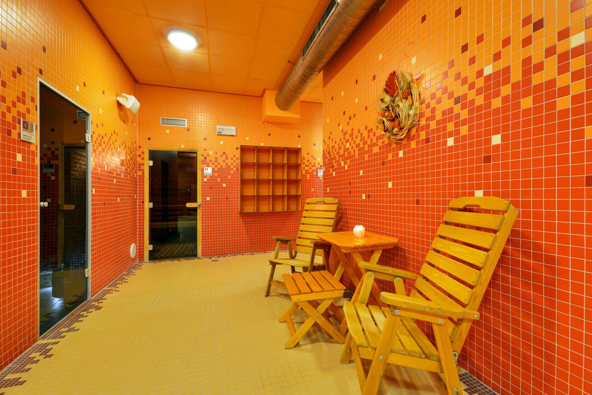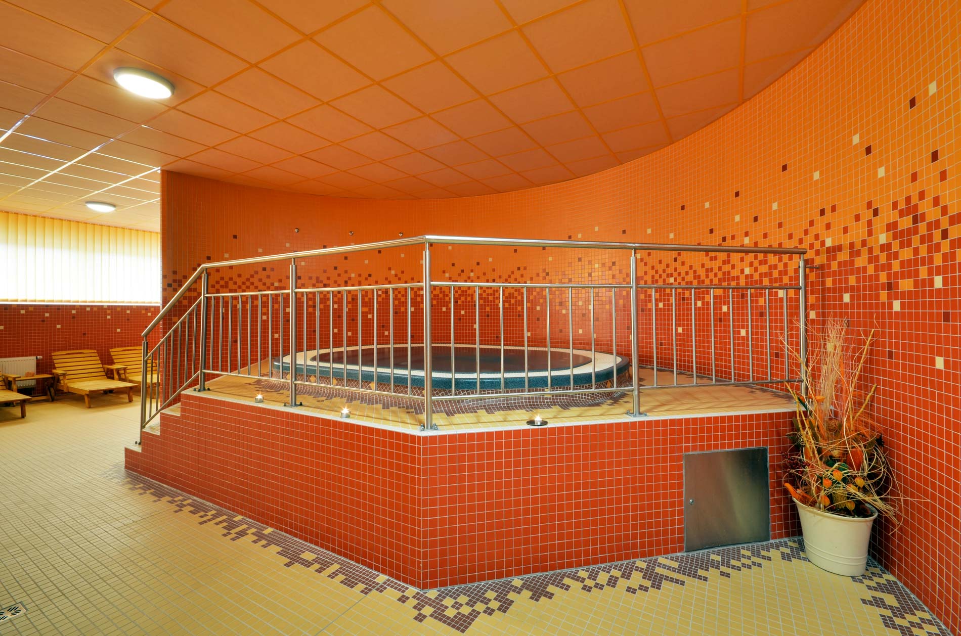 V 1. patře je wellness s pěti saunami a vířivým whirlpoolem. Vejdete do oázy klidu a harmonie s vůní květů a bylin. Můžete se zde nechat unést do světa masáží a zábalů pro dokonalou harmonii těla, mysli a duše.
