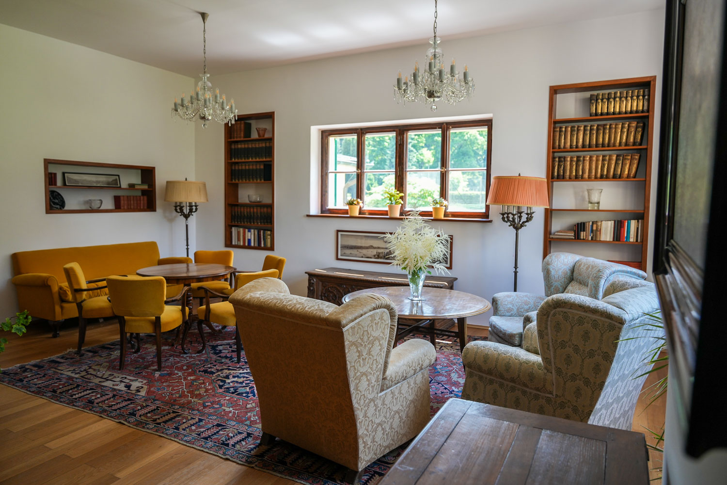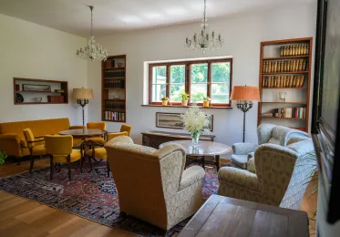 V přízemí se nachází prezidentova pracovna, navazující jídelna dodnes okouzlí dobovým porcelánem. V patře na vás čeká velká knihovna, oficiální pracovny i pokoj, v němž Edvard Beneš v roce 1948 zemřel. Jeho životní pouť připomíná i hrobka na nedalekém návrší zvaném Kazatelna, odkud podle pověsti kázal mistr Jan Hus. Hana Benešová měla ve vile své soukromé zázemí. Její pokoje v jihozápadním křídle jsou zrekonstruované podle historických fotografií a vystavené osobní předměty přibližují její osobnost.