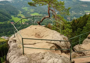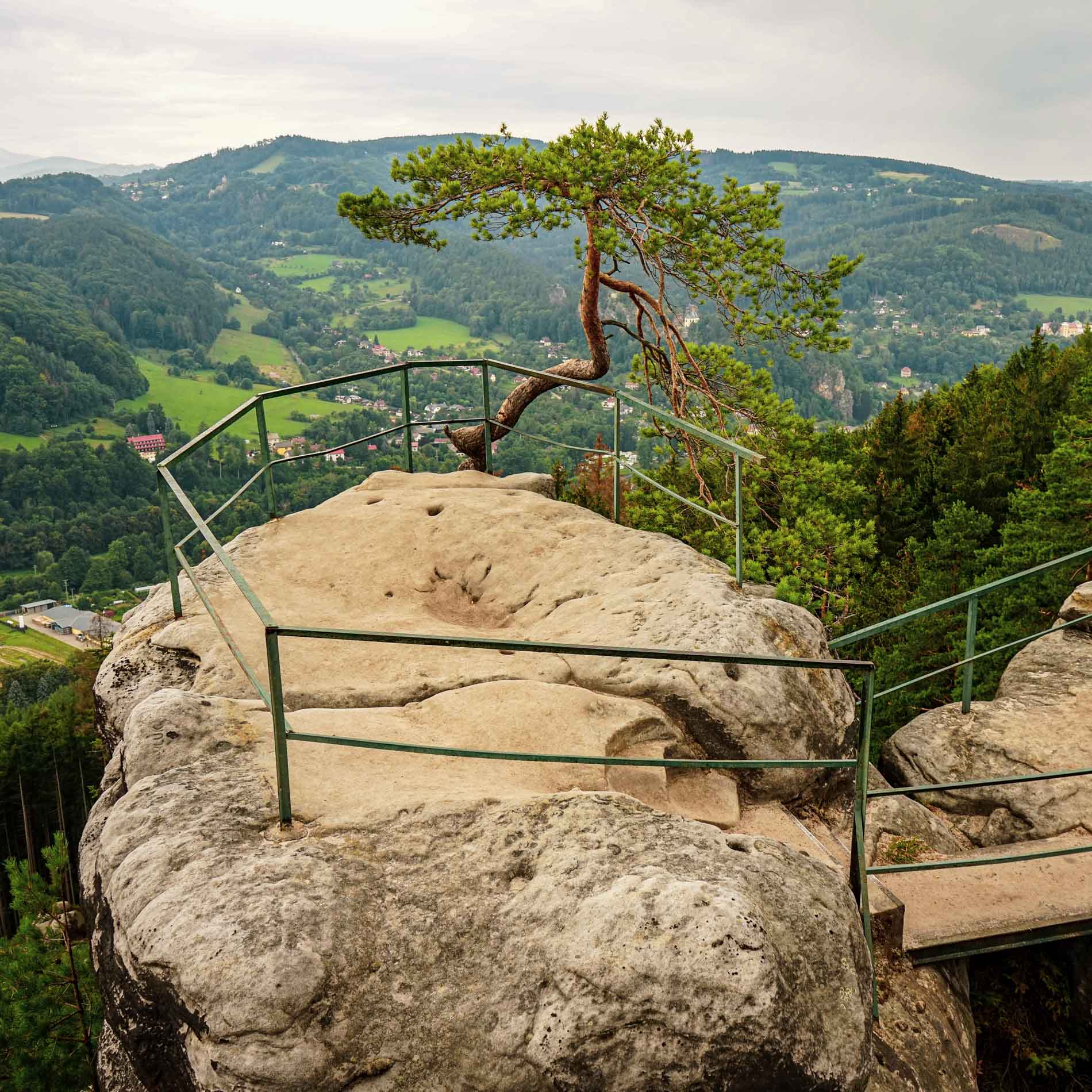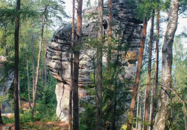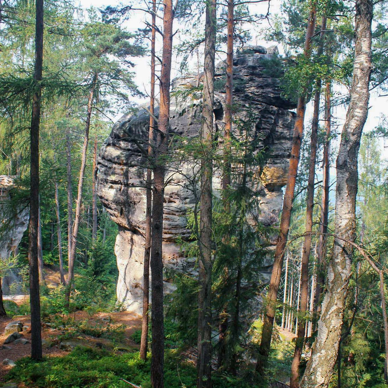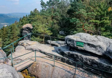 Ze skalního bludiště Chléviště půjdete na křižovatku s červenou značkou na Pánově poli. Vystoupáte kolem Tyršovy skály k nejvyššímu bodu okruhu. Tím je vyhlídka na vrchu Sokol. Z ní uvidíte na Suchá Skály.