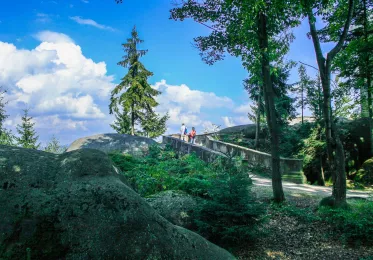 Určitě vás nadchnou skalní hřiby, které vznikly selektivním zvětráváním pískovcových skal. Objevíte je v lese nad Slavným. Z parkoviště Slavný půjdete po žluté turistické cestě k rozcestí a napojíte se na červenou. Od hřibů se podívejte k vyhlídce Na Čertovu tchýni.