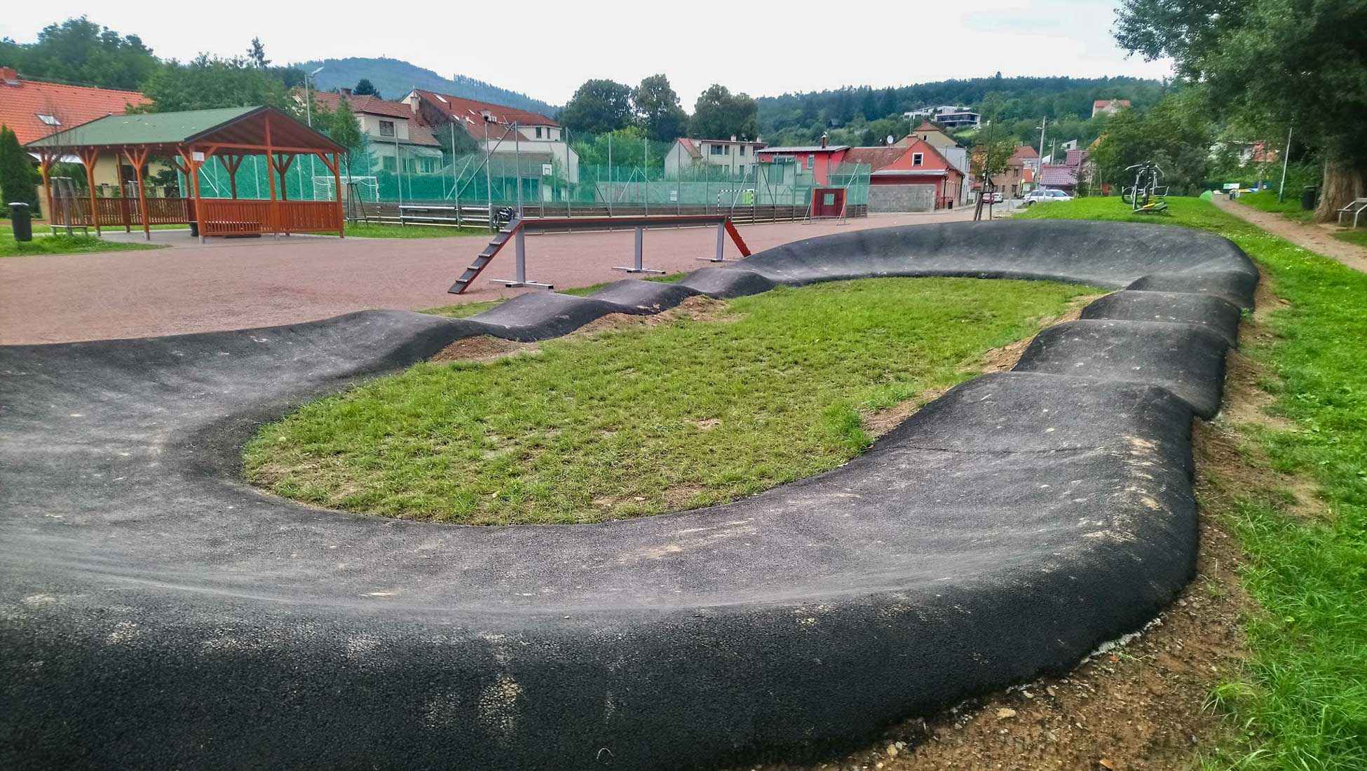 Na dětském hřišti je také velmi navštěvovaný dětský pumptrack s asfaltovým povrchem. Děti se vyřádí na okruhu, který moho projet bez nutnosti šlapání a v tom tkví kouzlo pumptracku.