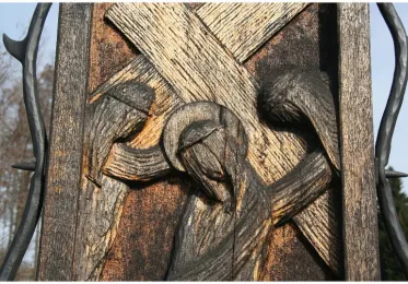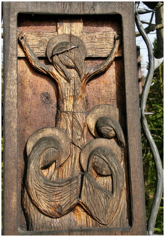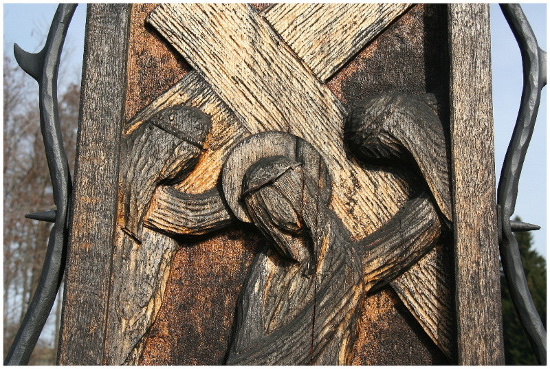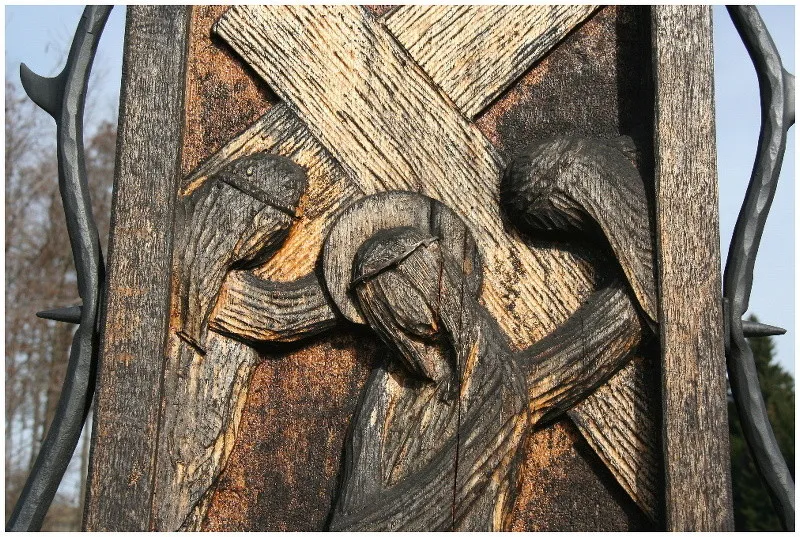 Každé zastavení tvoří dřevěná deska s vyřezaným pašijovým výjevem, upevněná v ozdobném kovovém držáku, který symbolizuje trnovou korunu. Jedná se o spojené dílo dvou umělců – řezbáře Michala Farka a uměleckého kováře Milana Michna.