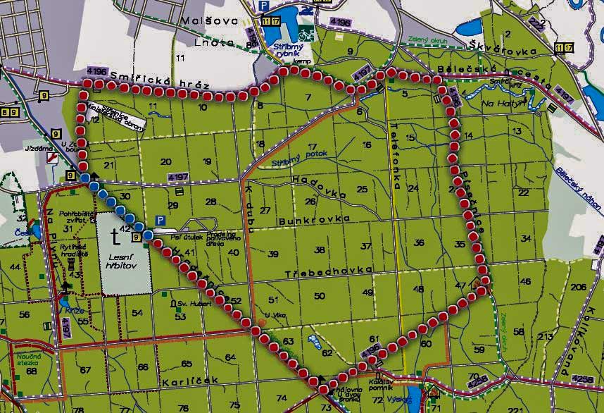 In line okruh je pokryt kvalitním asfaltem a protíná s geometrickou přesností hradecké lesy. Nejprve vede od Lesního hřbitova Hradečnicí, pak se vine z Malšovic po Smiřické hrázi, která je pozůstatkem po dávno zaniklém rybníku. Dále in line stezka pokračuje kolem odbočky ke Stříbrnému rybníku a potom po Písečnici přes rozcestí U Dvou Šraňků. Tam se napojuje opět na Hradečnici, která bruslaře zavede zase zpátky až k Lesnímu hřbitovu. Trasa na mapě.