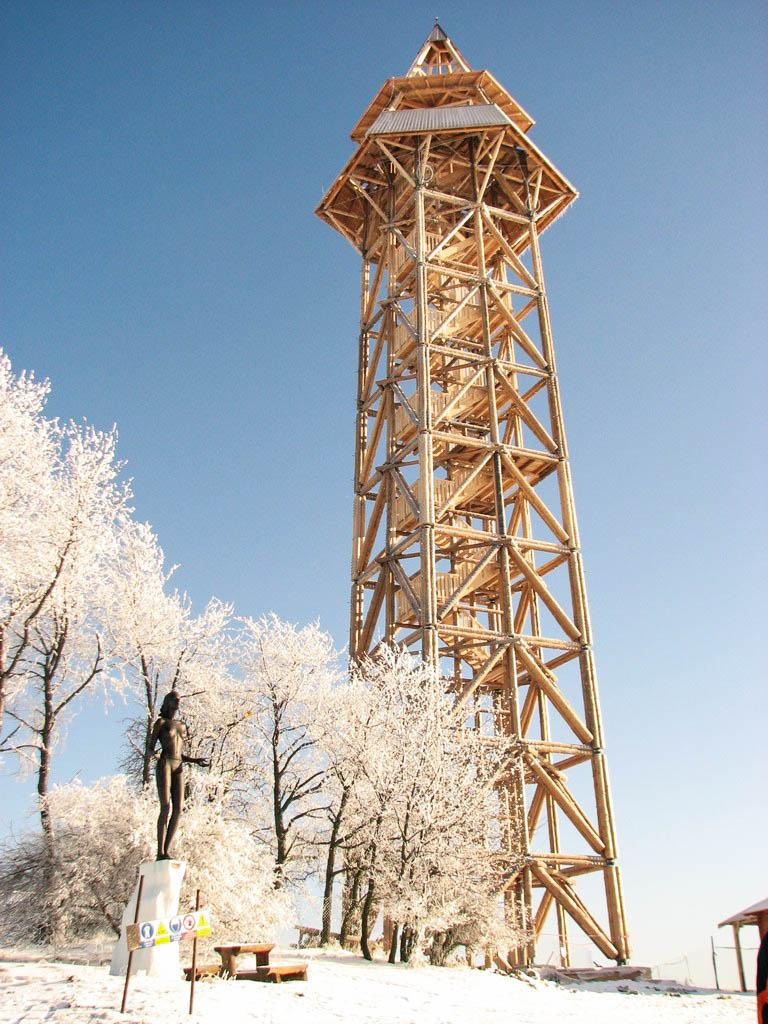 Rozhledna na návrší nad ovocným sadem je vysoká 52 metrů, na horní zastřešenou plošinu ve výšce 42 metrů vede 216 schodů. Dřevěná stavba je originální, vystavěná z kulatiny a speciálních ocelových spojů. Uvidíte z ní zvlněnou krajinu středního Posázaví s množstvím menších kopců. Pod rozhlednou si prohlédnete sochu Zvěstování Panny Marie.