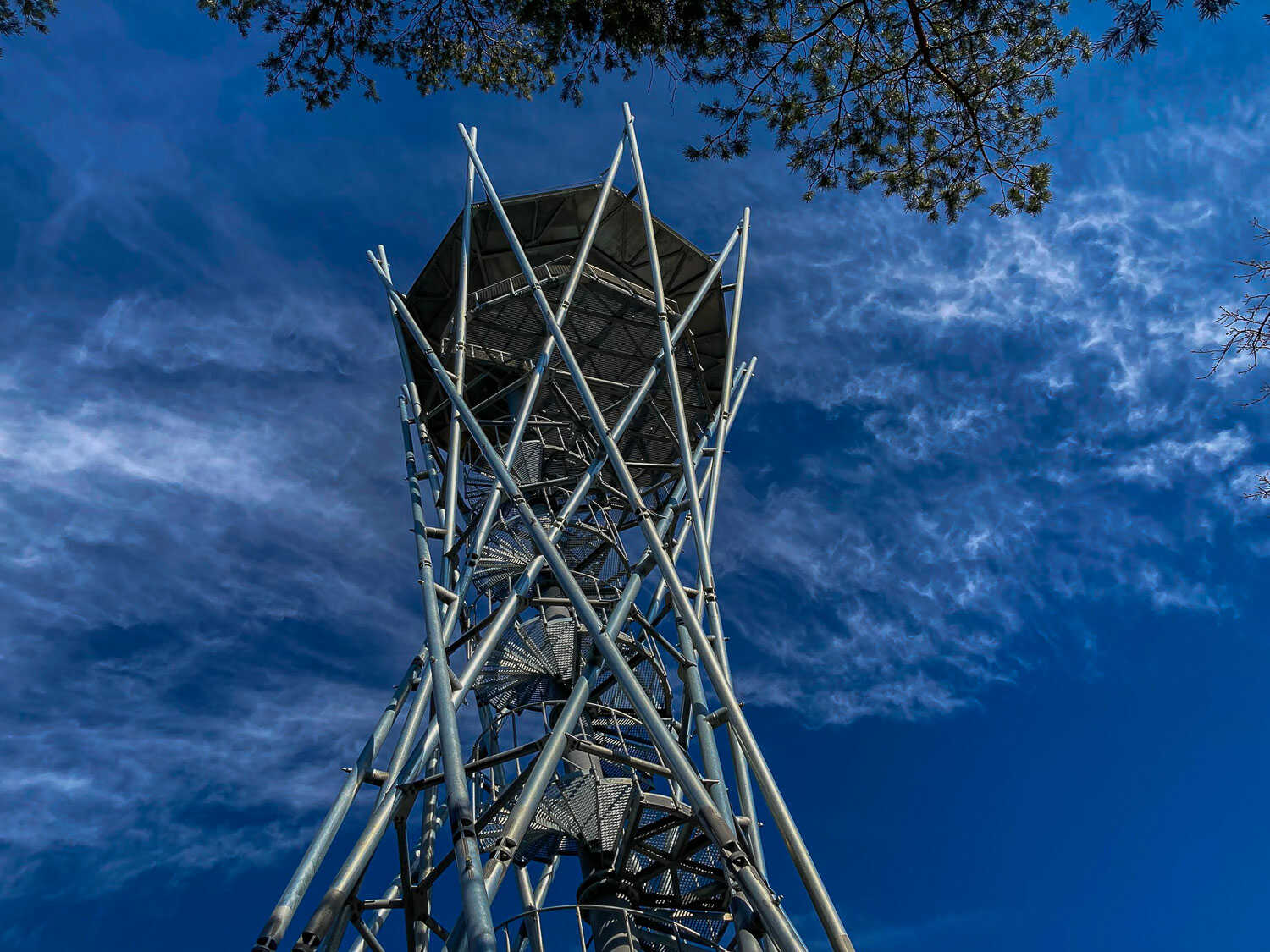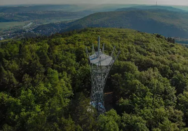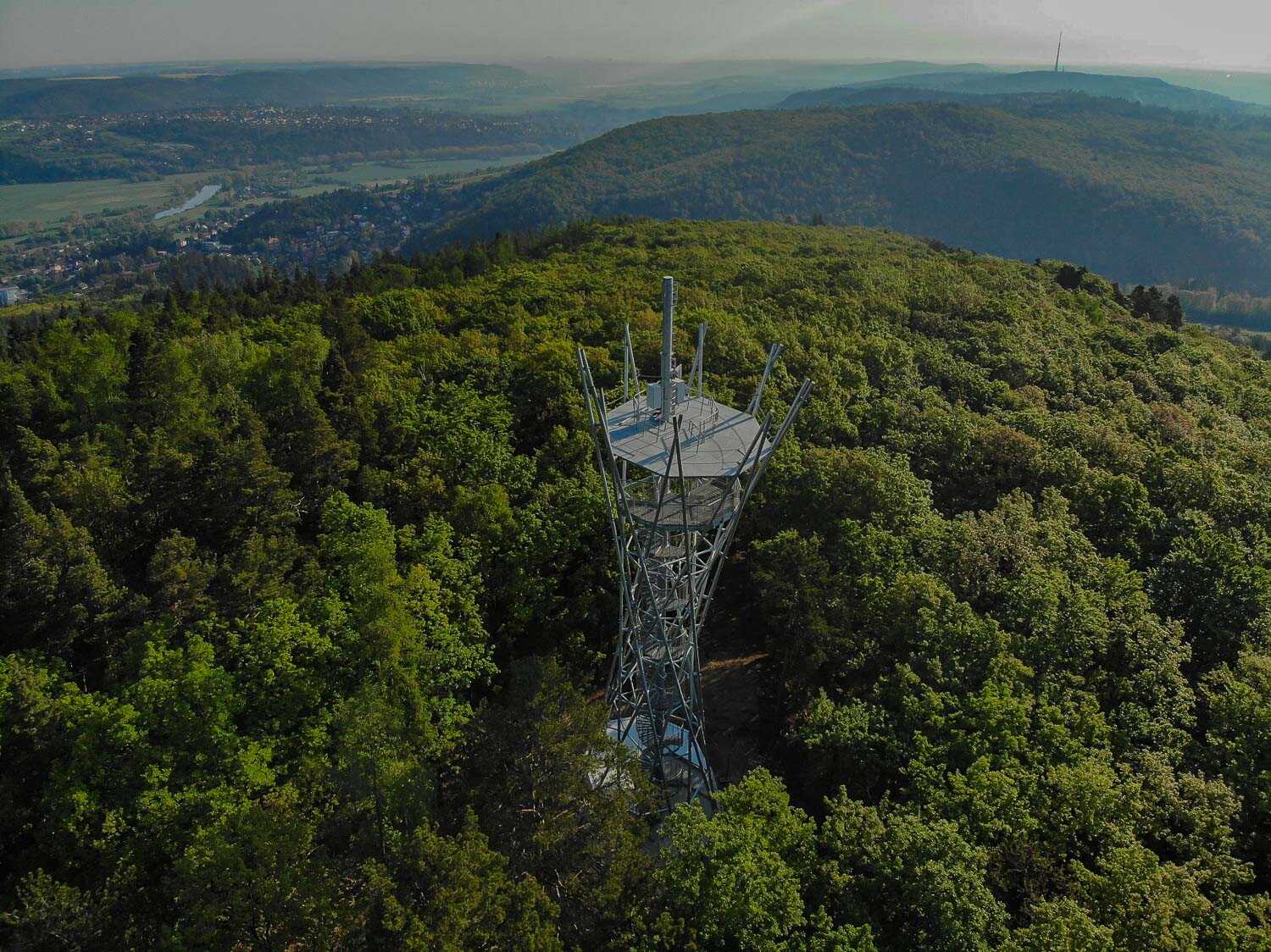 Rozhledna Korunka vám vypadá jako rotační hyperboloid s nakloněnou osou. Osa je nakloněna o 7,5 stupně, což je o 2 stupně více než věž v Pise. Působí dojmem, že padá z kopce. Betonová konstrukce a zastřešení jsou rovněž ve sklonu. Plášť věže tvoří 16 prutů, z nichž 8 se otáčí ve směru hodinových ručiček a druhá polovina proti směru. Na plošinu vede točité schodiště se 118 schody, opatřené nerezovou sítí. Vrchní část věže vypadá jako koruna, proto název Korunka. Uvidíte Brdy, Berounsko, vysílač Cukrák, část Prahy, v údolí meandr Berounky. Při dobré viditelnosti horu Říp, Šumavu a Krkonoše.