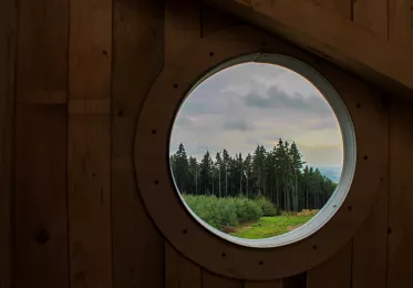 Rozhledna má tvar komolého kužele. Tvoří ji dřevěná konstrukce zpevněná ocelovými prvky. Spirálovitě obtáčí kryté schodiště. Na vyhlídkovou plošinu budete muset zdolat 158 schodů. Dřevěné schodiště je kryto plechovými stěnami a střechou. Už během výstupu se vám otevřou krásné pohledy na krajinu přes kruhová okénka ve stěně schodiště. Z vyhlídkové plošiny ve výšce 25 m se můžete rozhlížet široko daleko do kraje. Naskytne se vám pohled do Bouzovských vrchů, uvidíte rozsáhlou hanáckou nížinu, Drahanskou vrchovinu a Nízký Jeseník.