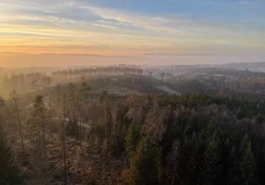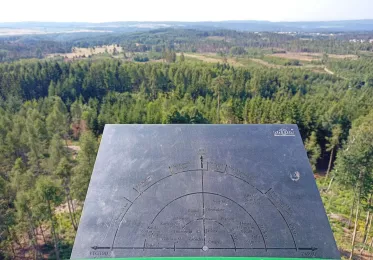 Z vyhlídkového ochozu, který je umístěn ve výšce 37 metrů, se otevírá pěkný výhled na celé blízké území Chráněné krajinné oblasti Moravského krasu. Jsou vidět věže elektrárny Dukovany, Pálavské vrchy, Drahanská a Českomoravská vrchovina. Rozeznat se dají i menší rozhledny v okolí. Například Kozárov, Spešov, malý Chlum, Babí lom u Lelkovic a Milenka u Rudky. Za velmi dobré viditelnosti v dáli září vrcholky Alp.