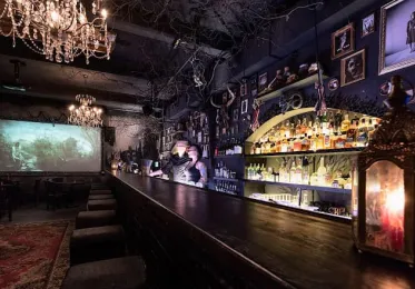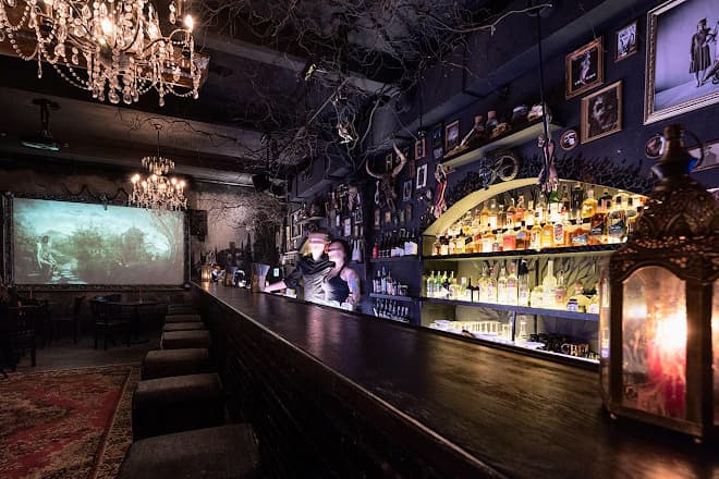 V suterénu strašidelného domu je hororový bar, který nabízí menu s hororovými drinky a jídly. Ani zde nechybějí hororové rekvizity. Naproti Fear House Praha je legendární cukrárna U Myšáka.
