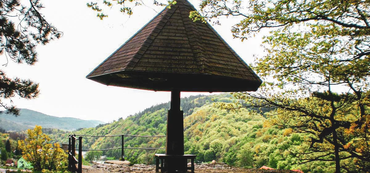 Dřevěná vyhlídka vám svým tvarem připomene, že je hodna názvu. Skutečně vypadá jako paraplíčko. Je to výhodné i proto, že když je horší počasí, pod stříškou kuželovitého tvaru se schováte. Jsou tu i lavice. Pod vámi se otevře úžasný pohled na meandrující koryto Berounky, spatříte v celé jejich šíři Roztoky u Křivoklátu, vodácký kanál, skalnaté, strmé břehy řeky i nedaleký vodácký kemp a tábořiště.