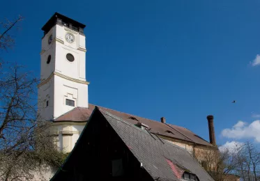 Štíhlá hranolovitá věž s vyhlídkovým ochozem patřila kostelu, který potkala nejedna katastrofa. Byl opakovaně poničen, vyrabován, zasáhl jej blesk a ničivý požár. Jen díky rozsáhlým sklepům nebyl zbořen, ale jeho další osud se nesl ve znamení zlatavého moku – piva. Byl totiž přebudován na pivovar. Poté, co zde výroba piva skončila, měl opět „na kahánku“, ale k jeho zboření naštěstí nedošlo a dnes se můžete těšit z vyhlídky z jeho věže.