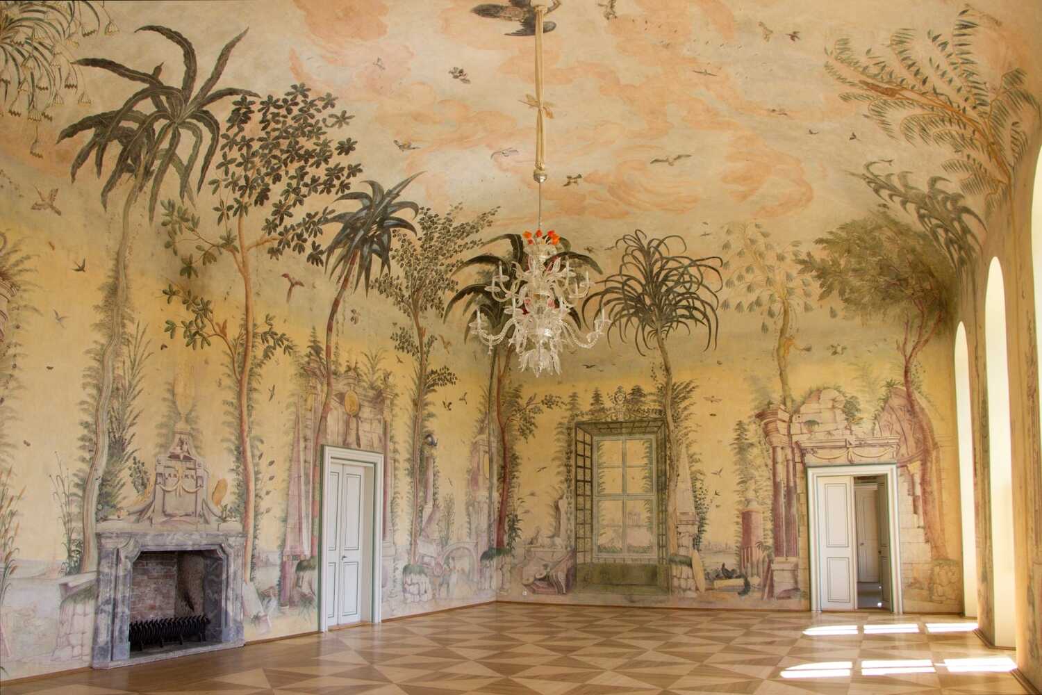 Prohlídka interiérů končí v nově restaurovaném tanečním sále. Stěny a strop jsou pokryty nástěnnou malbou od předního dobového malíře Antonína Tuvory. Malba představuje nejrozsáhlejší známé dílo tohoto umělce. Malovanými průhledy do otevřené krajiny se vám otevřou pohledy k malovaným zříceninám antických chrámů, pyramidám i jezerům s vodními ptáky a k dalším úchvatným výjevům. To vše je výsledkem technologicky velmi náročné několikaleté restaurátorské obnovy začátkem tohoto století.