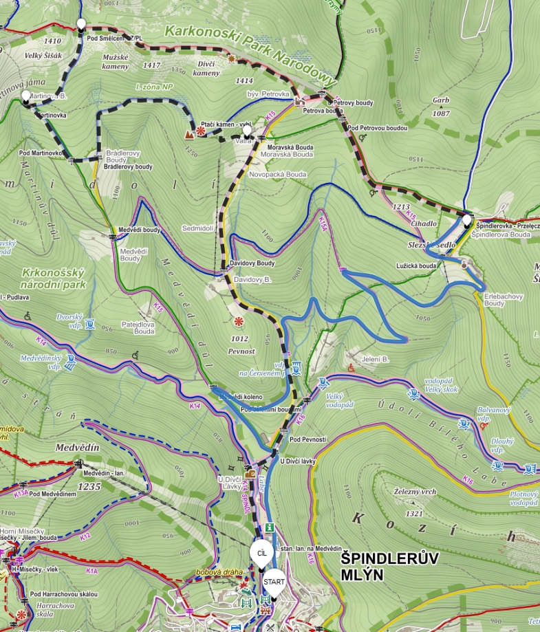 Vydejete se za horskou turistikou po hřebenech hor Krkonoš cestou Česko-polského přátelství. Ze Špindlerova Mlýna na ni vede několik tras. Vyberte si tu, která začíná u Špindlerovy boudy, kam vás pohodlně dopraví autobus ze Špindlerova Mlýna. Odtud se na zhruba 13 km dlouhou túru vydáte po červené turistické značce po cestě Česko-polského přátelství přes bývalou Petrovu boudu, dále přes Dívčí a Mužské kameny k rozcestníku Pod Smělcem. Zde se vydejte po modré turistické značce směrem k Martinově boudě, dále po modré přes Brádlerovy k Chatě Vatra, kde výtečně vaří. Odtud po žluté dojdete podél toku Červeného potoka přes Davidovy boudy zpět do Špindlerova Mlýna.