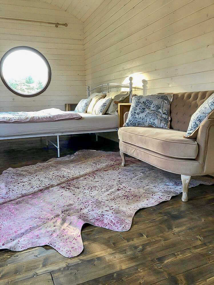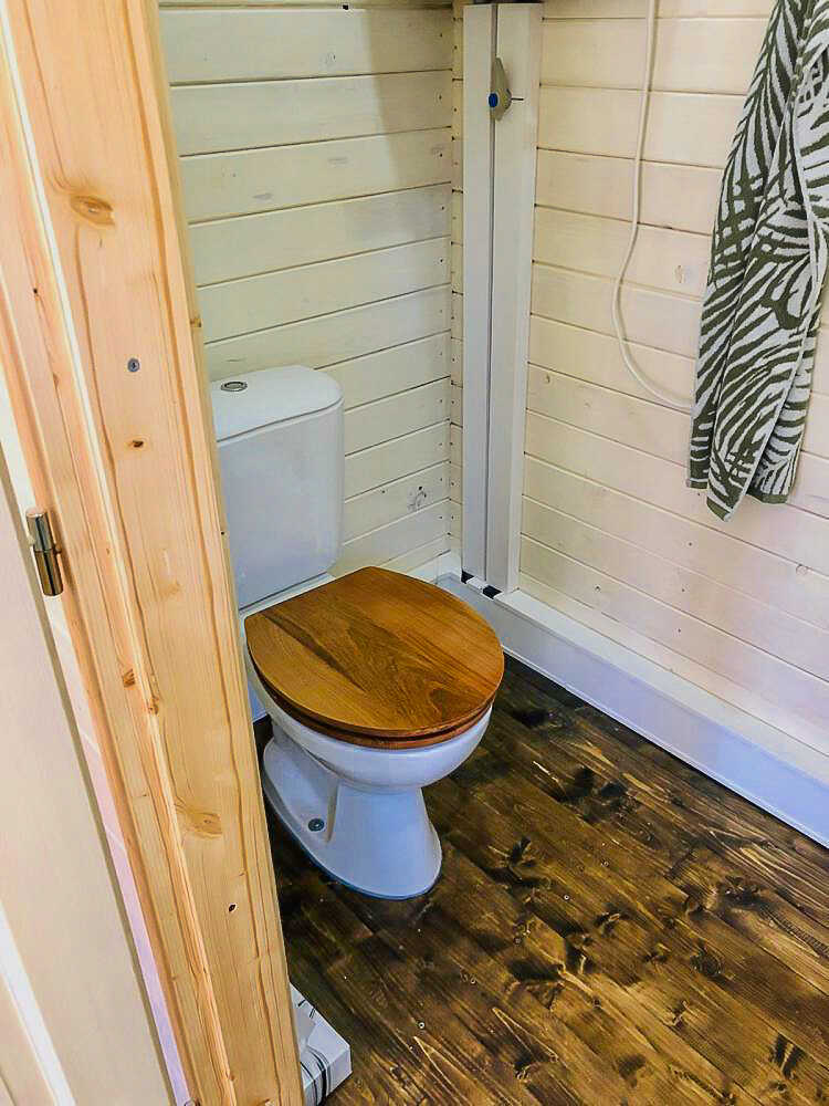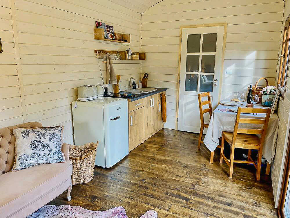 Tento minidomeček je určen pro 2 osoby. Poskytuje dostatek soukramí, stojí v klidné části ekozahrady s výhledem na stromy a louku. Uvnitř má minidomeček jednu místnost velikou 14 m2. Je v ní manželská postel, jídelní stůl a židle, noční stolky a dostatečné úložné prostory. K dispozici máte plně vybavený kuchyňský kout, ve kterém je sklokeramická deska s dvěmi plotýnkami, lednička, rychlovarná konvice, kávovar na tablety Tchibo, čaj na uvítanou, toustovač, kuchyňské nádobí a náčiní. V barelech je přichystaná pitná voda z vrtu bez chemie. Je zde i sprchový kout a splachovací toaleta za dveřmi, ekologické toaletní potřeby, ručníky a na vyžádání zapůjčíme i fén. Za příplatek si můžete objednat horký masážní sud a snídaně. Do tohoto minidomečku, jako jediného, můžete přijet i s vaším psíkem.