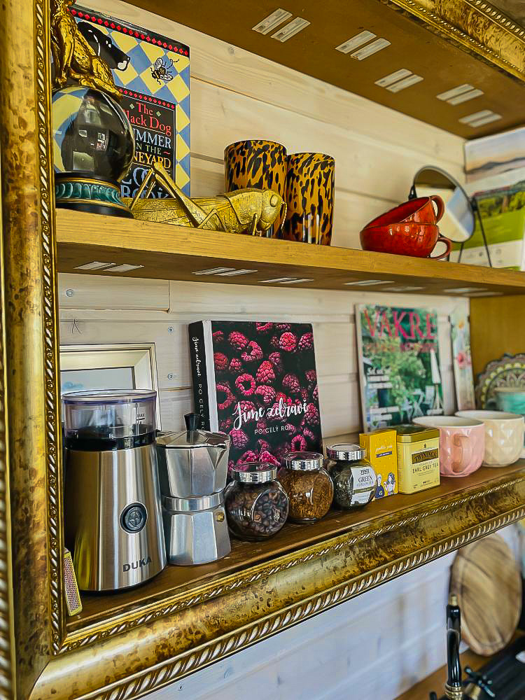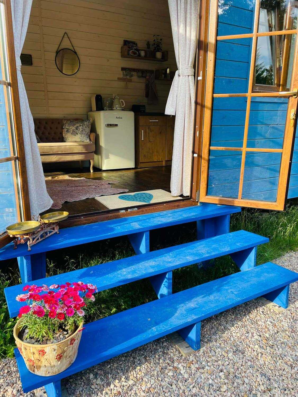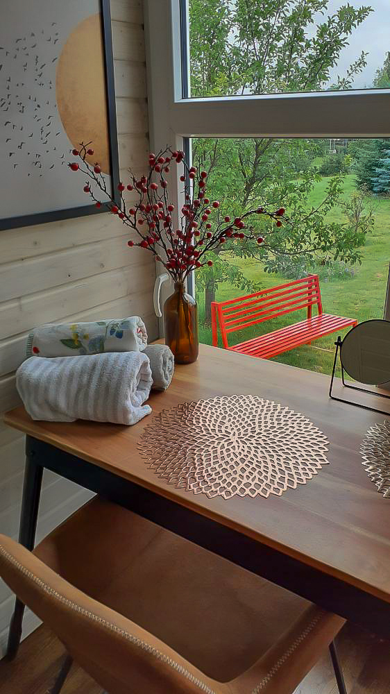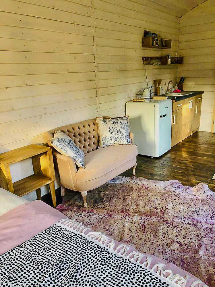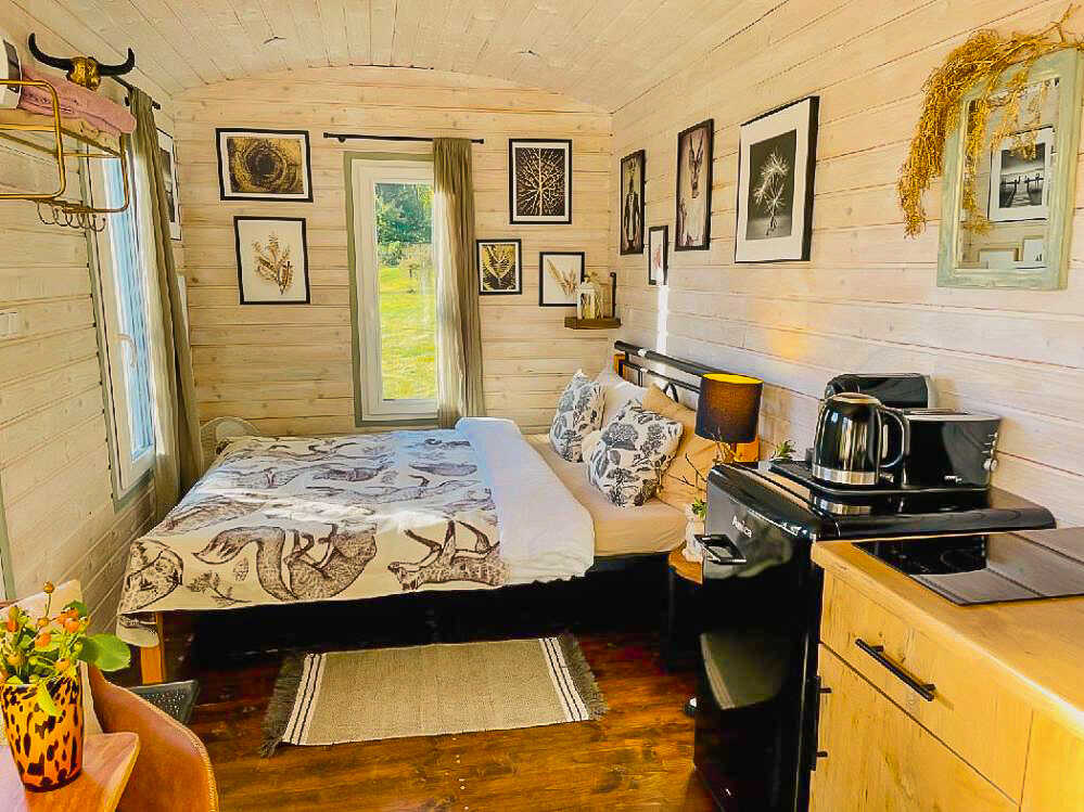 Tato velká (20 m2), designová, glamour- camping (glamping) maringotka je velmi prostorná, světlá a pohodlná. Je umístěná v soukromí ekozahrady, kousek od lesa. Okouzlí vás její design i krásný výhled do zahrady. Je ideálním ubytováním pro pár, nebo pro pár s malým dítětem, které spí ve společné posteli. Má vlastní sprchový kout i splachovací toaletu, kuchyňský kout uvnitř, kde najdete sklokeramickou desku s 2 plotýnkami, ledničku, rychlovarnou konvici, kávovar na tablety Tchibo, čaj na uvítanou, toustovač, kuchyňské nádobí a náčiní. K maringotce patří ohniště, gril a venkovní posezení.