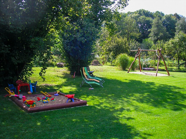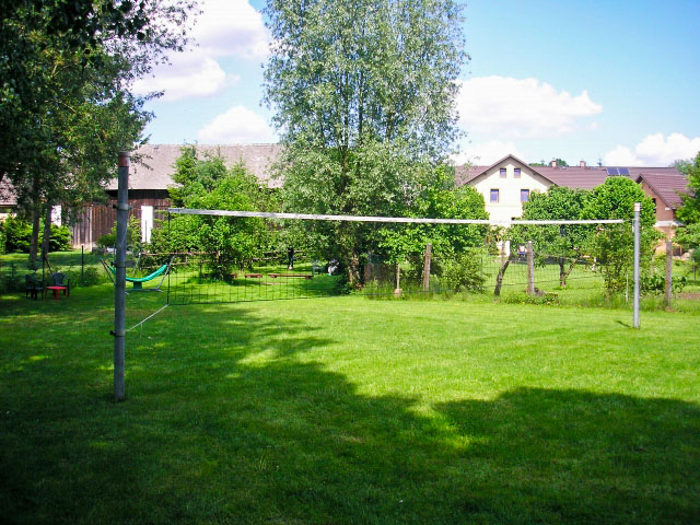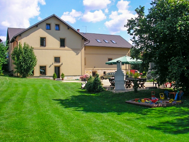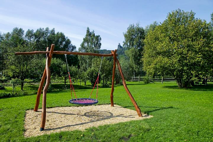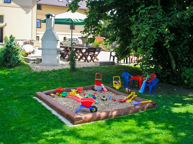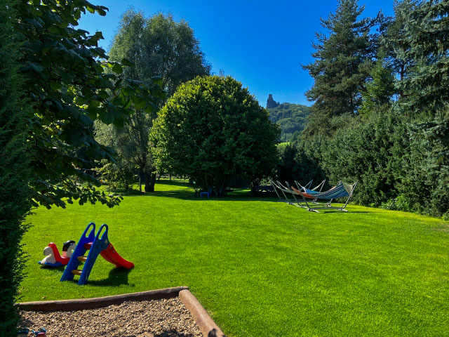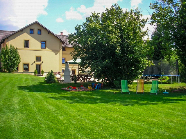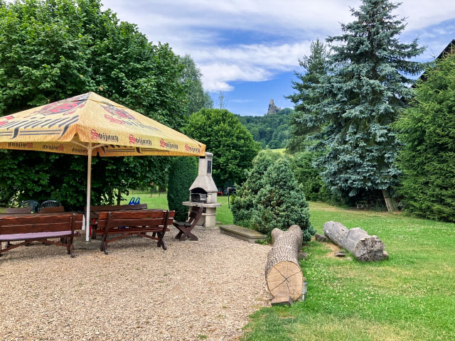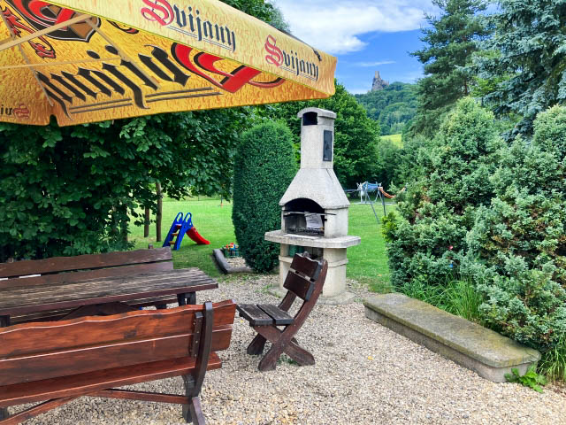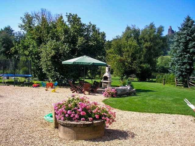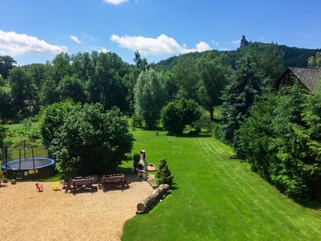 Součástí areálu je rozlehlá zahrada s přímým výhledem na hrad Trosky, který je v noci nasvícený a vytváří jedinečnou atmosféru. Zahrada nabízí široké sportovní i relaxační vyžití – fotbalové branky, volejbalové a nohejbalové hřiště, badminton, kroket, pétanque, líný tenis, švihadla i další sportovní potřeby k zapůjčení. Pro děti je připravena velká trampolína (4,3 m), houpačka hnízdo, kamínkoviště s hračkami a v letních měsících i malé bazénky a rozprašovadla. Příjemnou atmosféru doplňují i přátelská zvířátka – beránci Bolek a Lolek a minikozlíci Pepík a Terezka. K dispozici je také gril, ohniště a zahradní nábytek pro posezení.