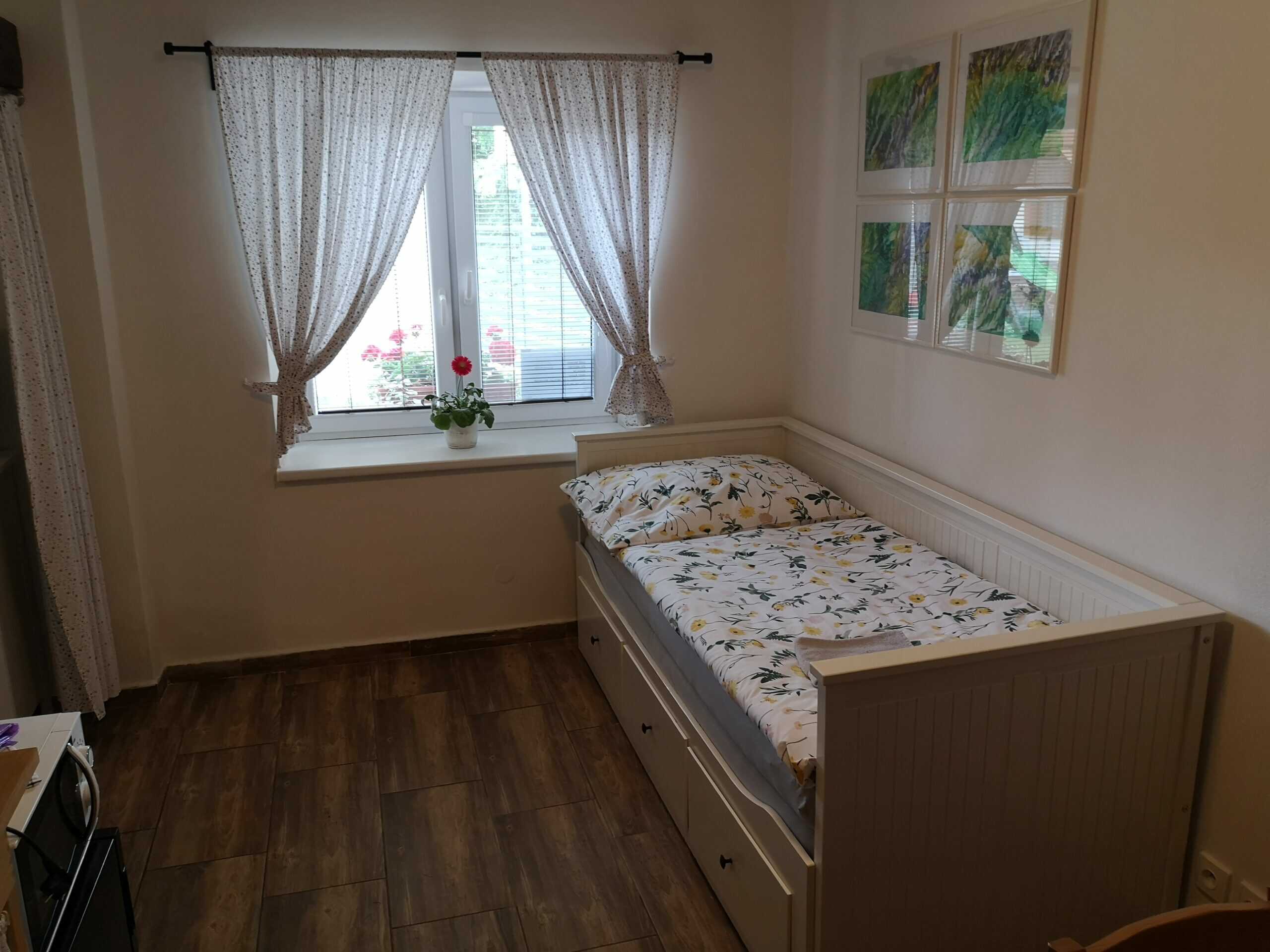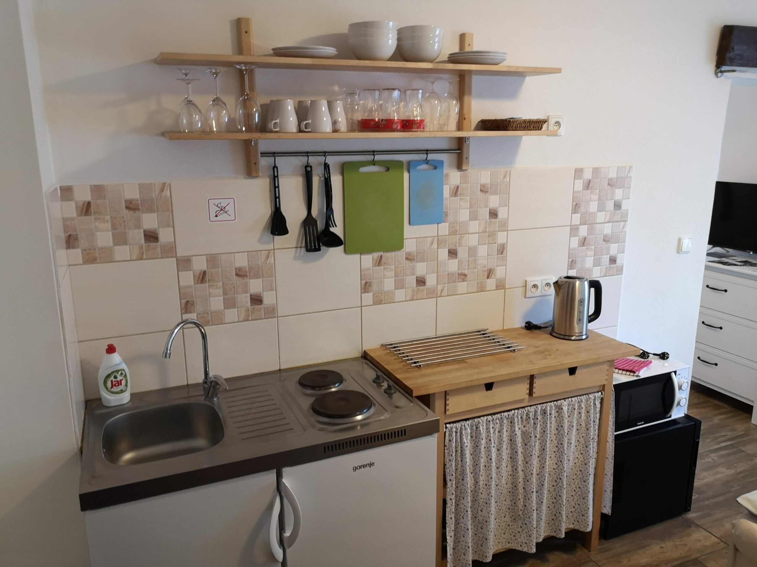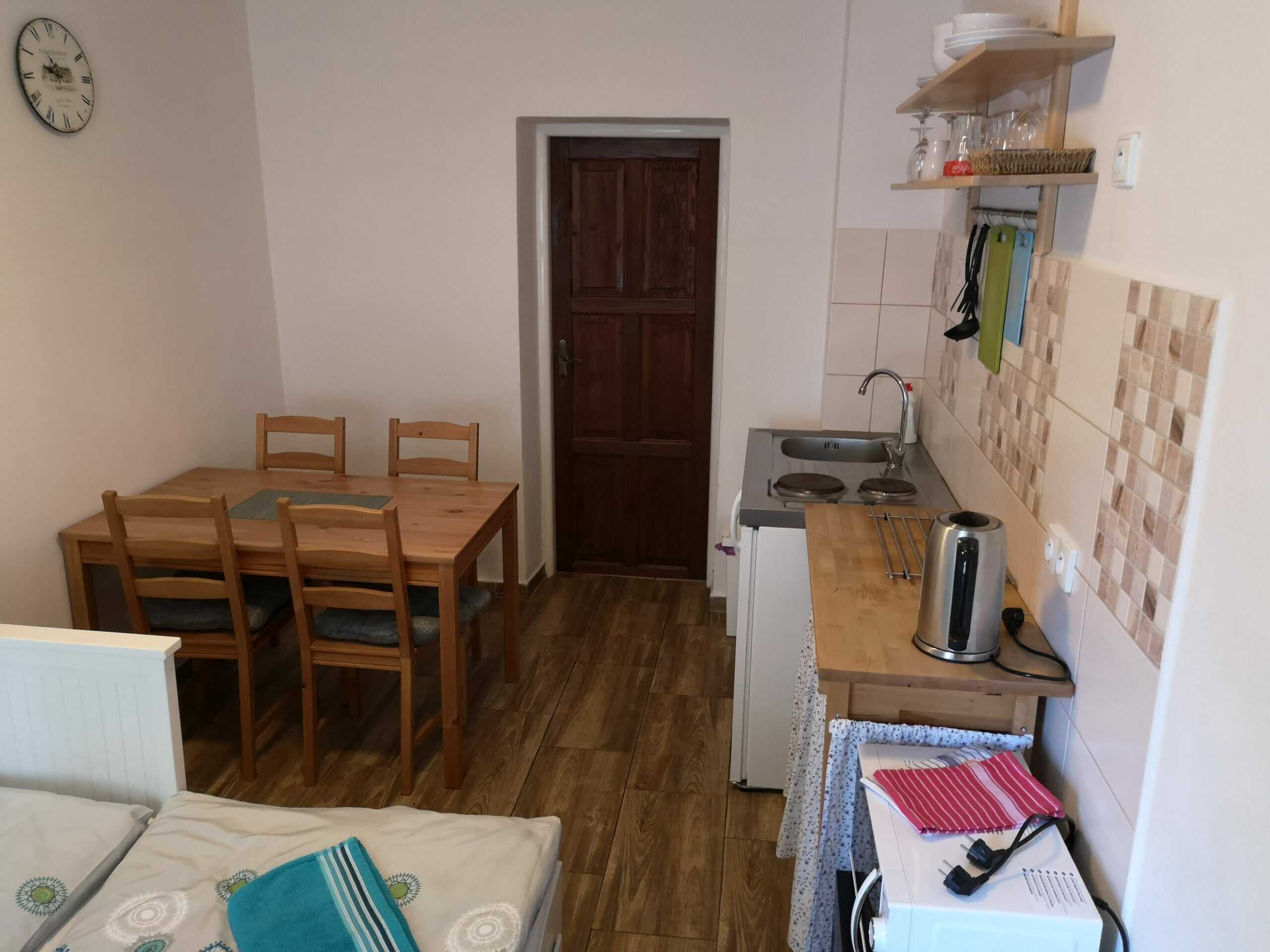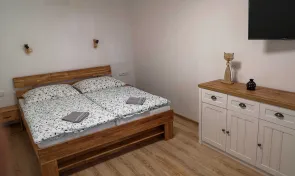 Apartmán č. 1 nabízí útulnou 2-lůžkovou ložnici s manželskou postelí a druhou místnost s rozkládacím gaučem, který se dá snadno proměnit na plnohodnotné dvoulůžko. K dispozici je také minikuchyňka vybavená dvouplotýnkou, mikrovlnnou troubou, rychlovarnou konvicí, lednicí s mrazničkou a jídelním koutem. Součástí apartmánu je vlastní koupelna se sprchovým koutem a toaletou.