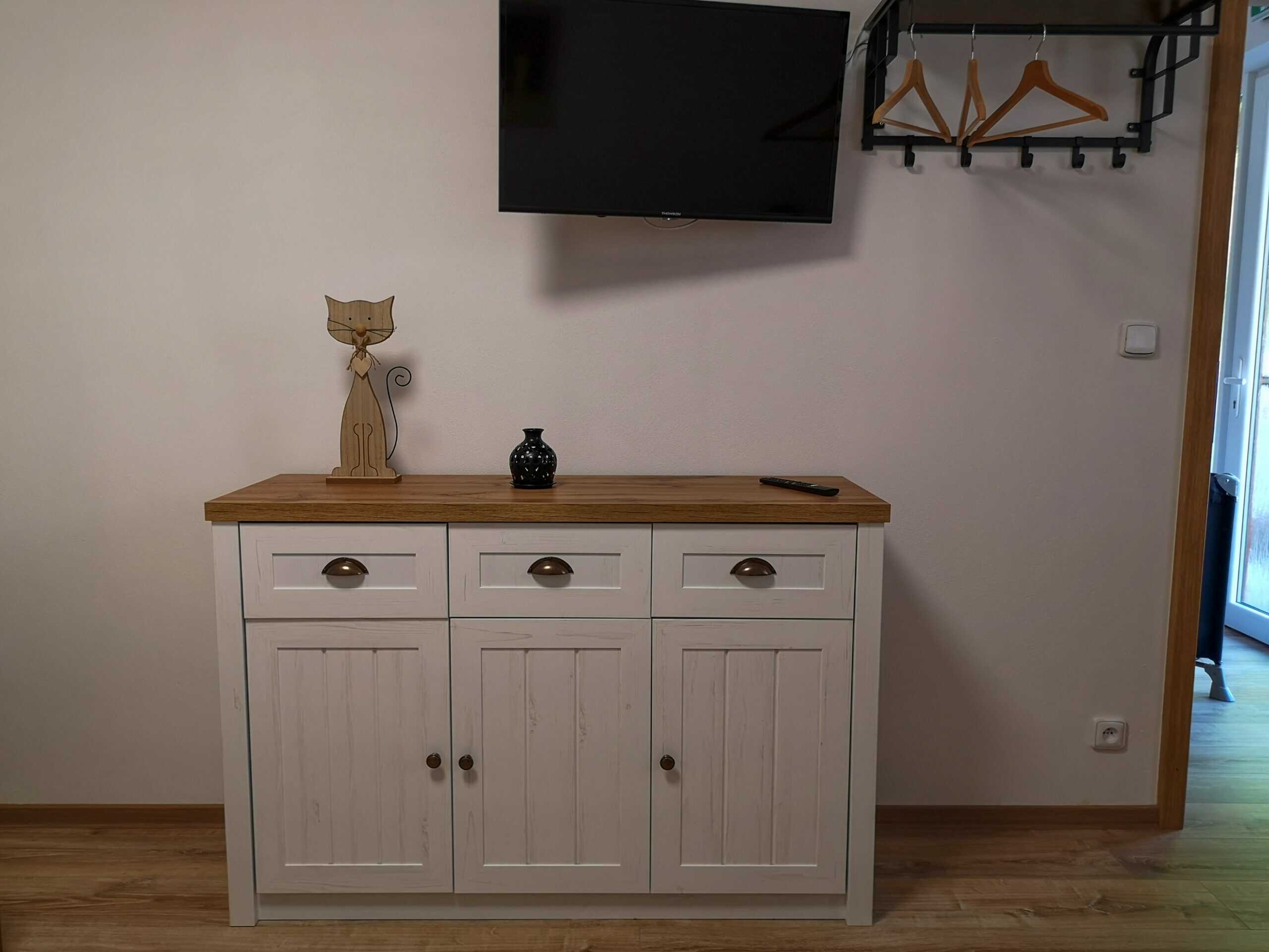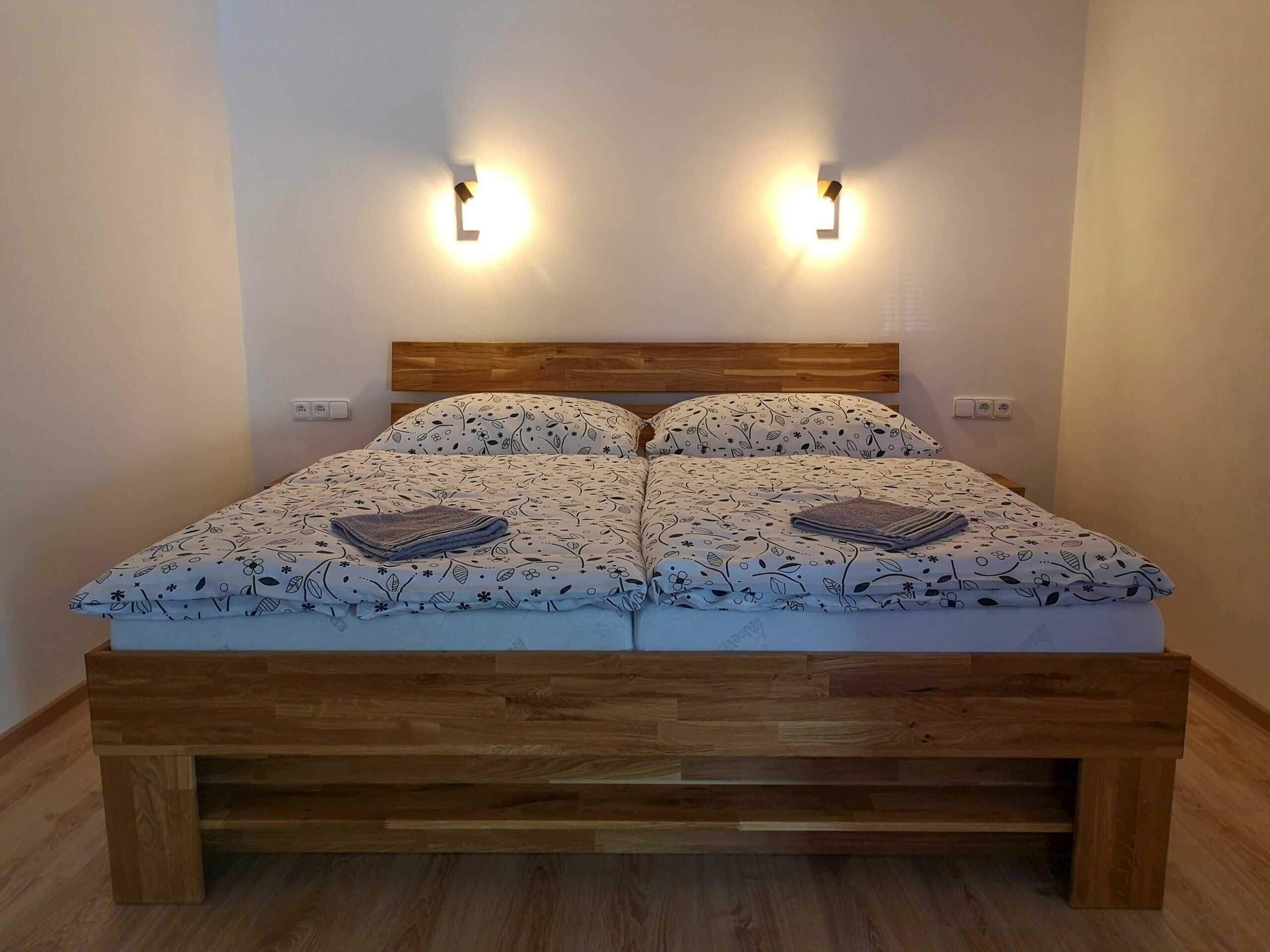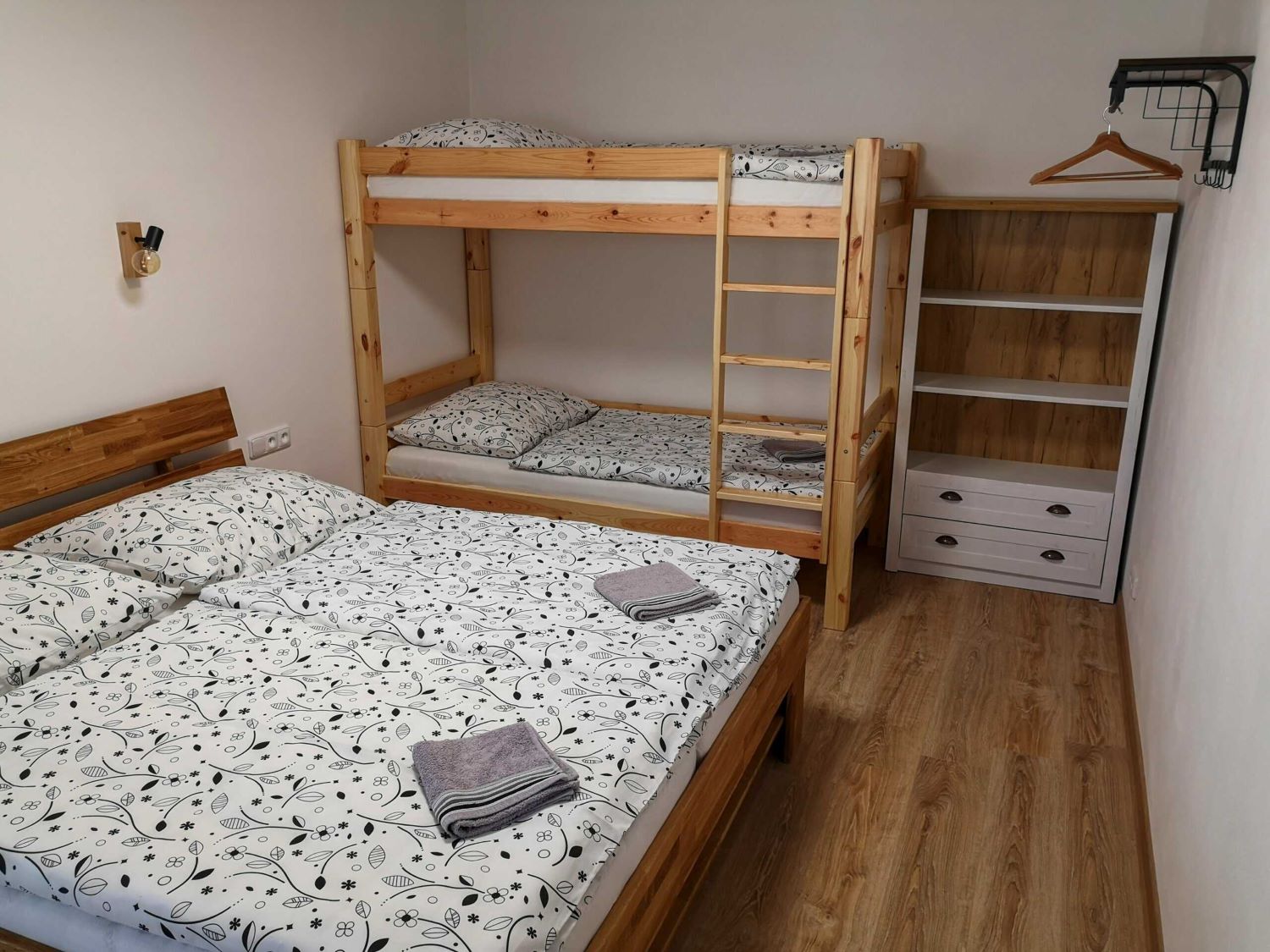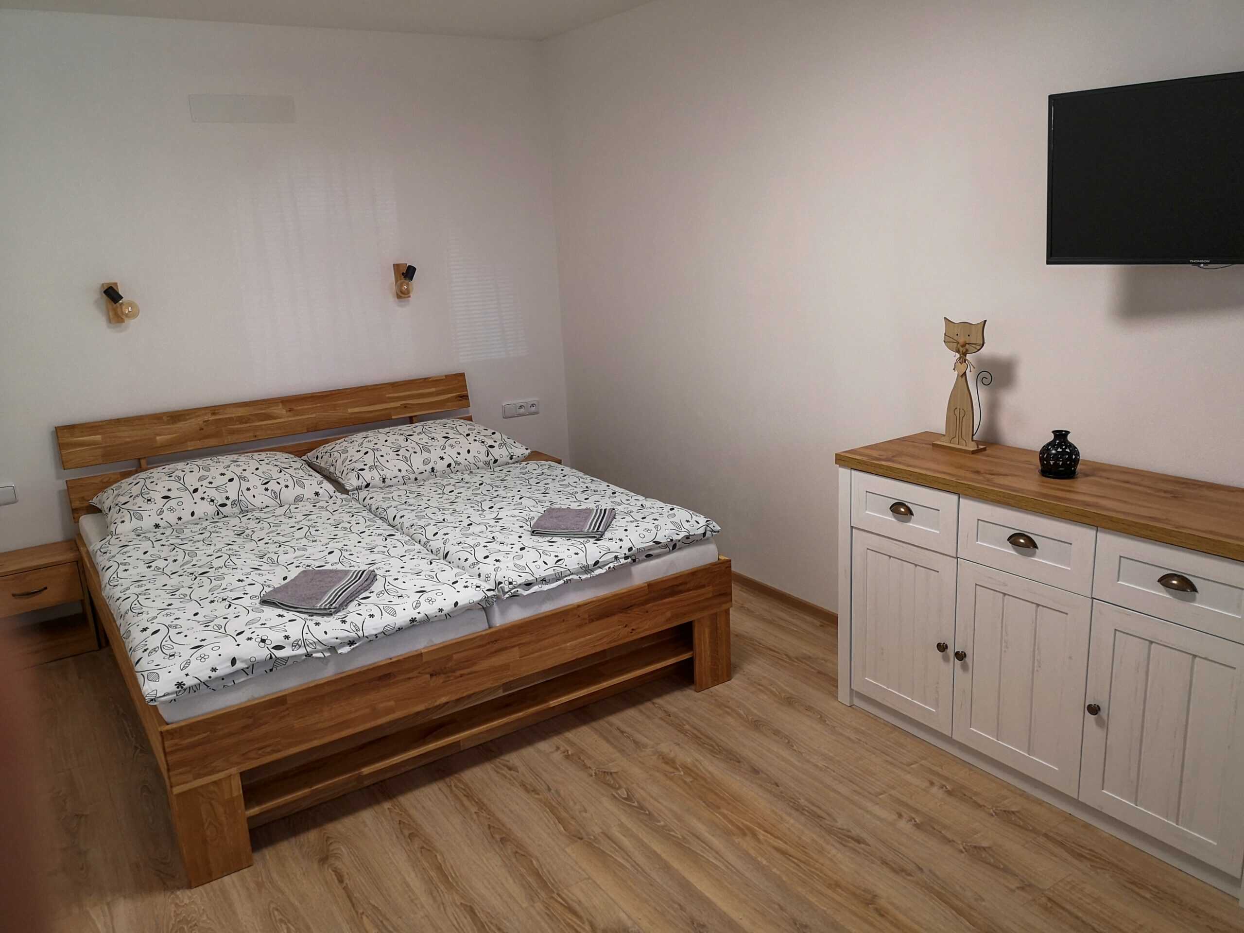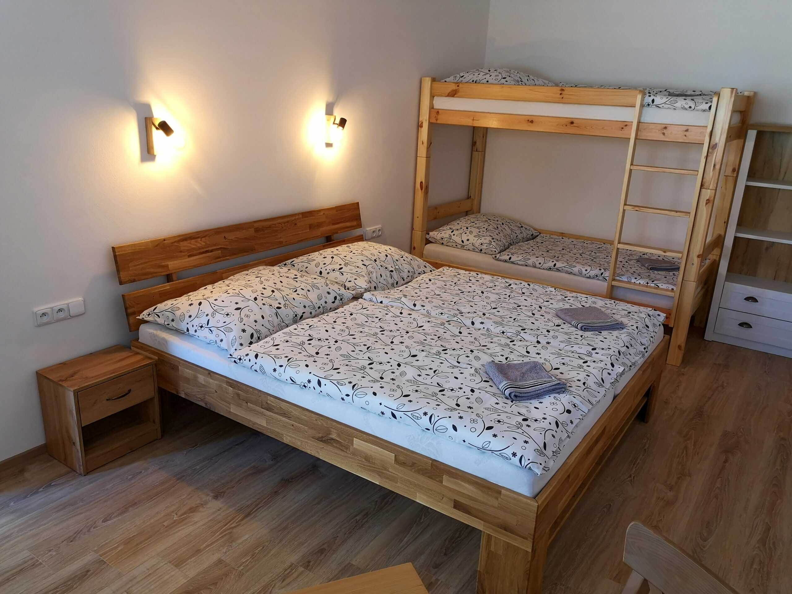 Apartmány č. 2 a 3 mají stejnou dispozici – každá jednotka se skládá z kuchyně a dvou ložnic. V první ložnici najdete manželskou postel a rozkládací křeslo spolu s televizí, druhá ložnice nabízí manželskou postel a patrovou postel, což je ideální pro rodiny s dětmi. Kuchyňky jsou vybaveny stejně jako v apartmánu č. 1 a každá jednotka má vlastní koupelnu se sprchovým koutem a toaletou.