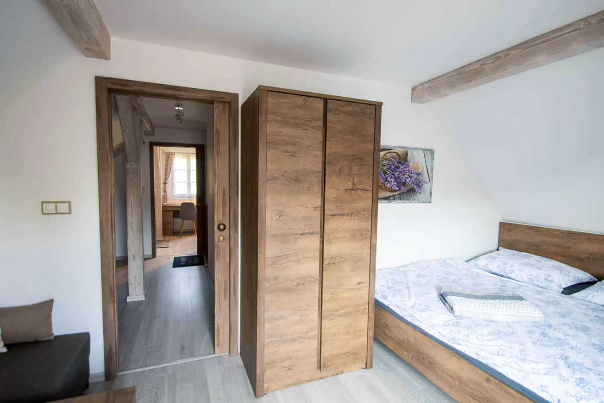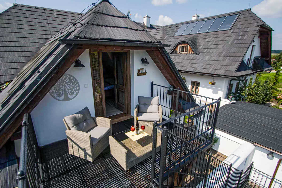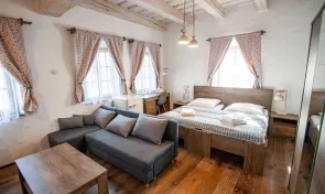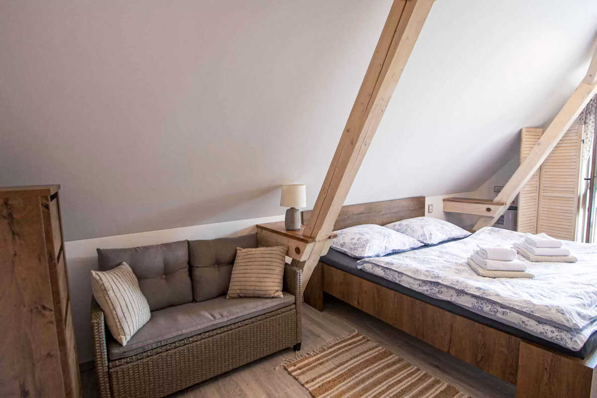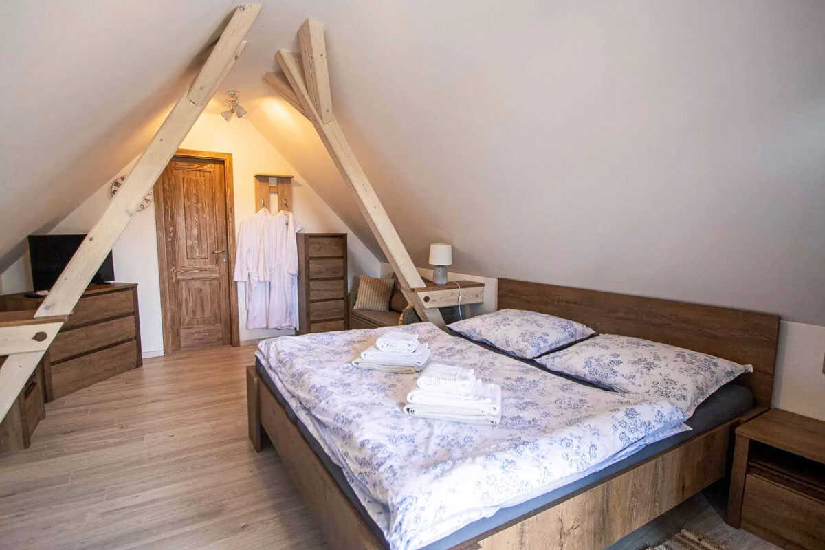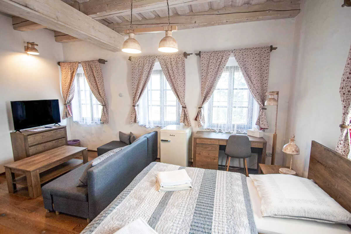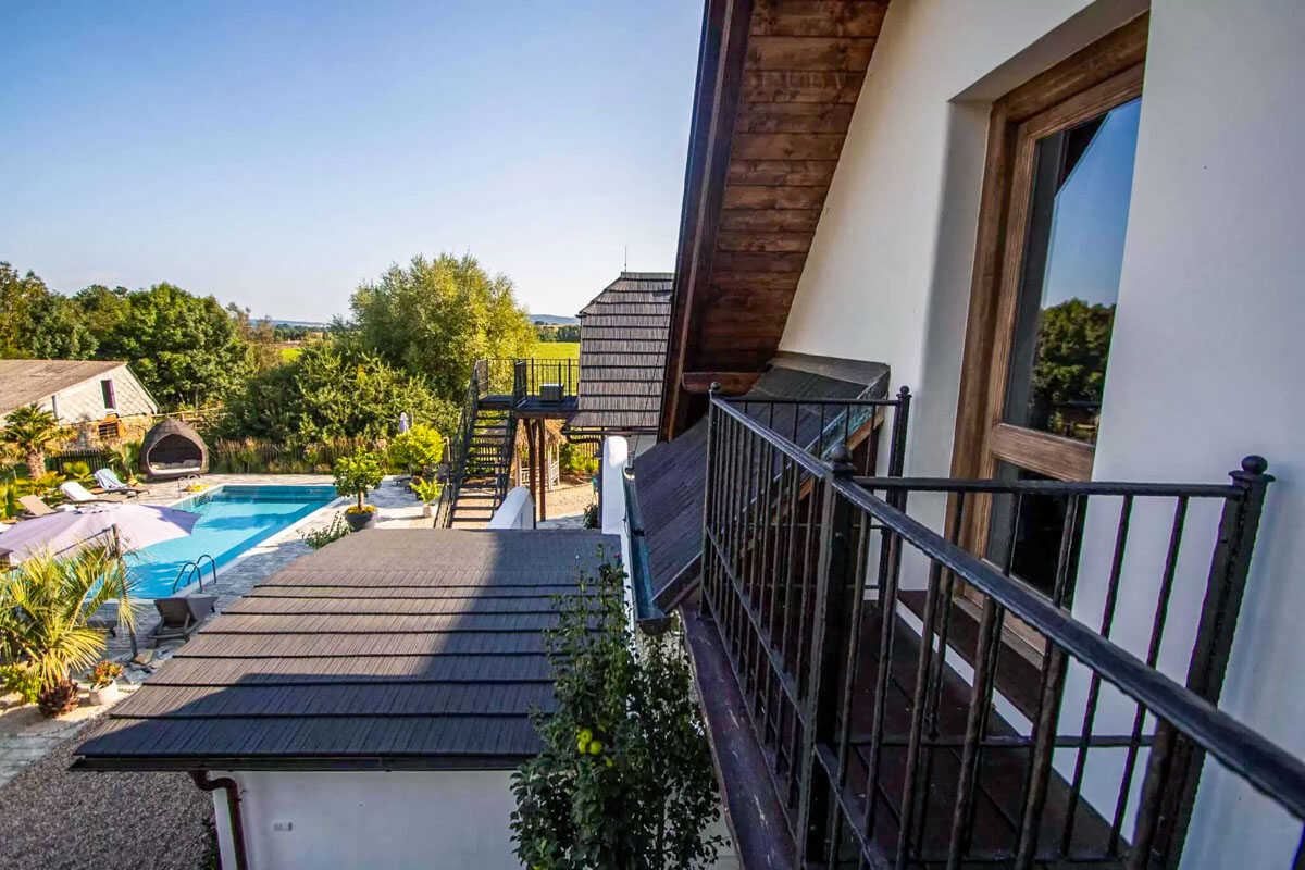K dispozici je pět stylově zařízených apartmánů s celkovou kapacitou až 20 osob. Dva z nich jsou určeny především pro páry – mají manželskou postel, koupelnu a příjemné posezení. Jeden z těchto pokojů, dvoulůžkový pokoj Deluxe, je prostornější a pyšní se velkou koupelnou, ideální pro chvíle relaxace po výletu či cyklistice. Další pokoje jsou vhodné pro rodiny – například rodinný apartmán s kapacitou až šesti osob tvoří dva propojené pokoje s balkonky, odkud se otevírá krásný výhled na zahradu a venkovní bazén. Stejně tak apartmán se dvěma ložnicemi nabízí ideální prostor pro 1–4 osoby, které ocení klid, pohodlí a výhled do přírody. Nechybí ani podkrovní pokoj s výhledem na bazén, který působí útulně a má samostatný vstup i balkon s posezením.
