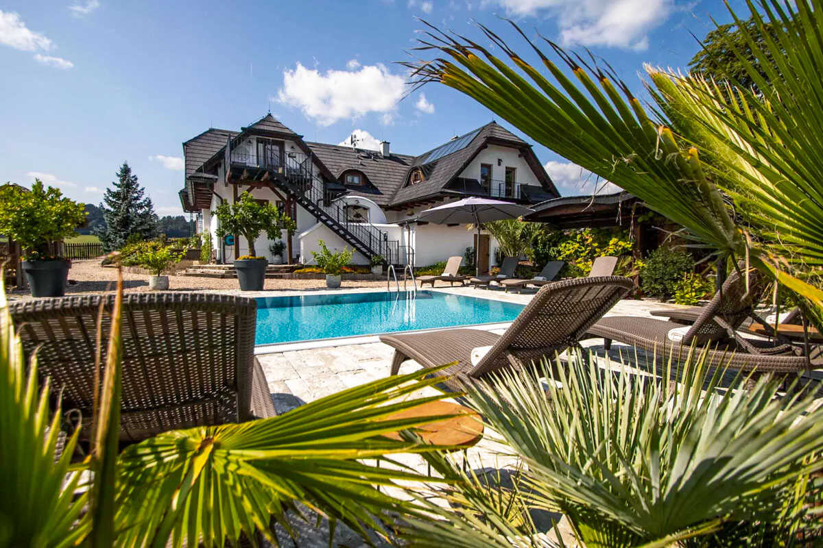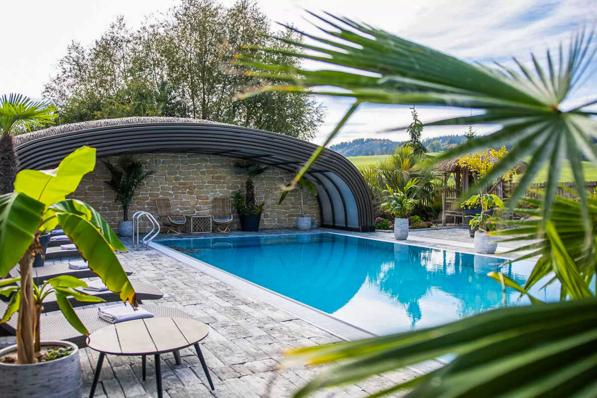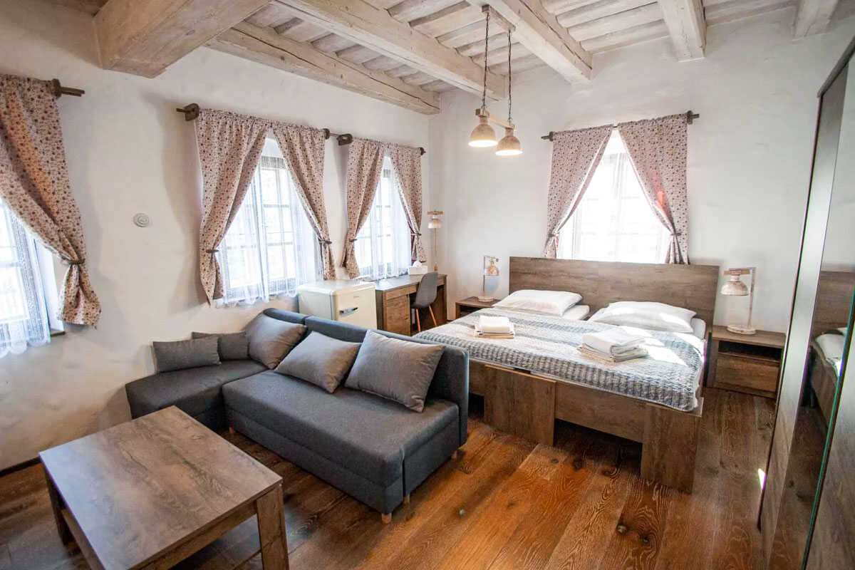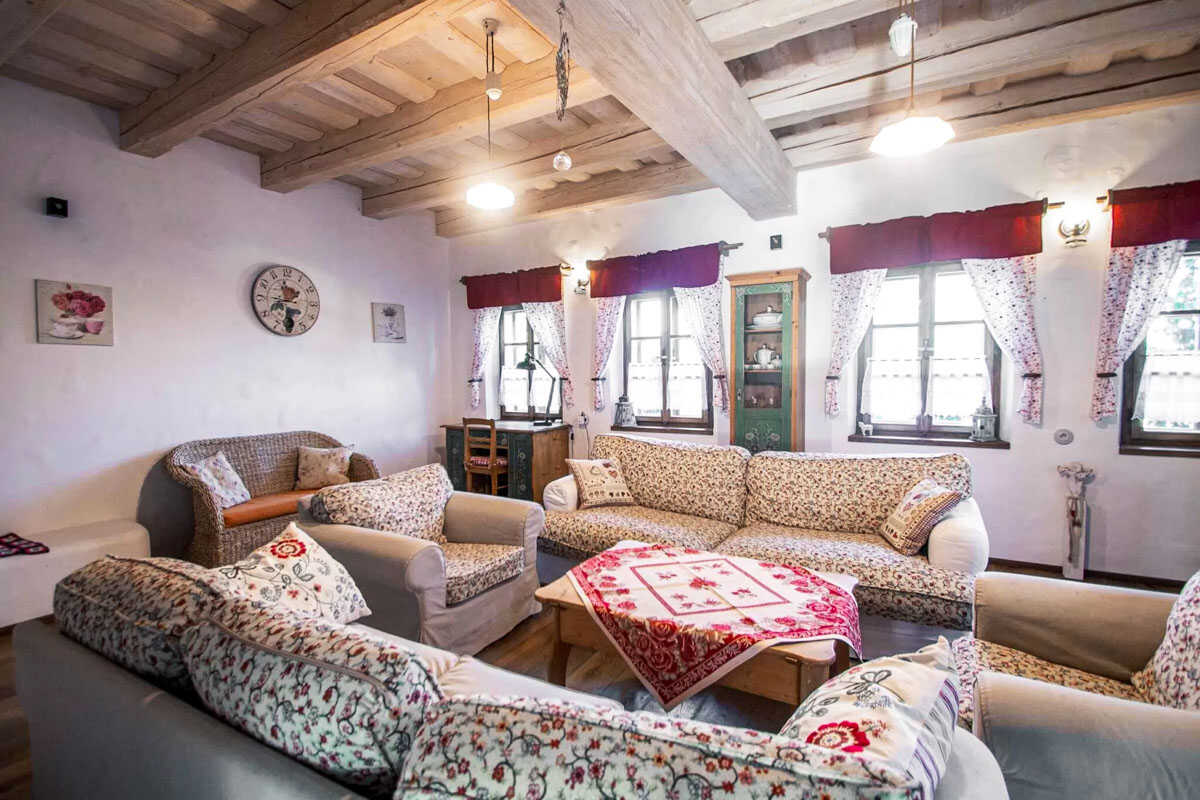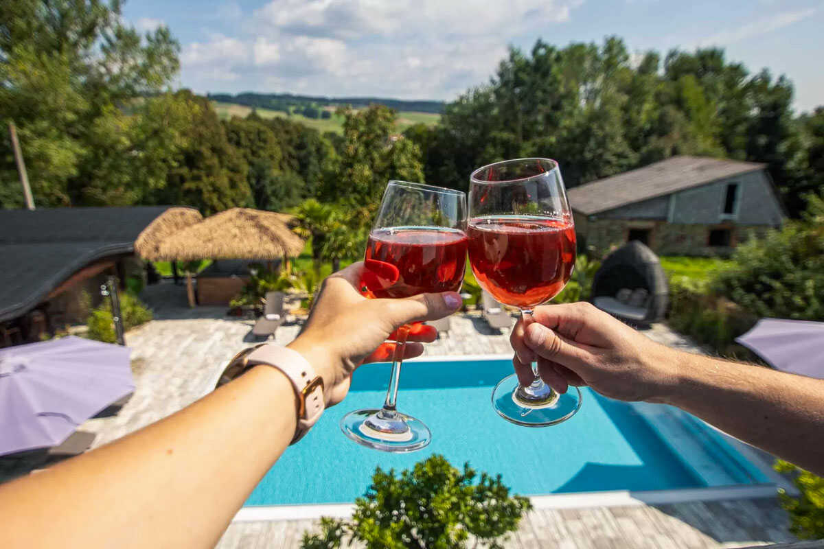 K dispozici je pět stylově zařízených apartmánů s celkovou kapacitou až 20 osob. Dva z nich jsou určeny především pro páry – mají manželskou postel, koupelnu a příjemné posezení. Jeden z těchto pokojů, dvoulůžkový pokoj Deluxe, je prostornější a pyšní se velkou koupelnou, ideální pro chvíle relaxace po výletu či cyklistice. Další pokoje jsou vhodné pro rodiny – například rodinný apartmán s kapacitou až šesti osob tvoří dva propojené pokoje s balkonky, odkud se otevírá krásný výhled na zahradu a venkovní bazén. Stejně tak apartmán se dvěma ložnicemi nabízí ideální prostor pro 1–4 osoby, které ocení klid, pohodlí a výhled do přírody. Nechybí ani podkrovní pokoj s výhledem na bazén, který působí útulně a má samostatný vstup i balkon s posezením.