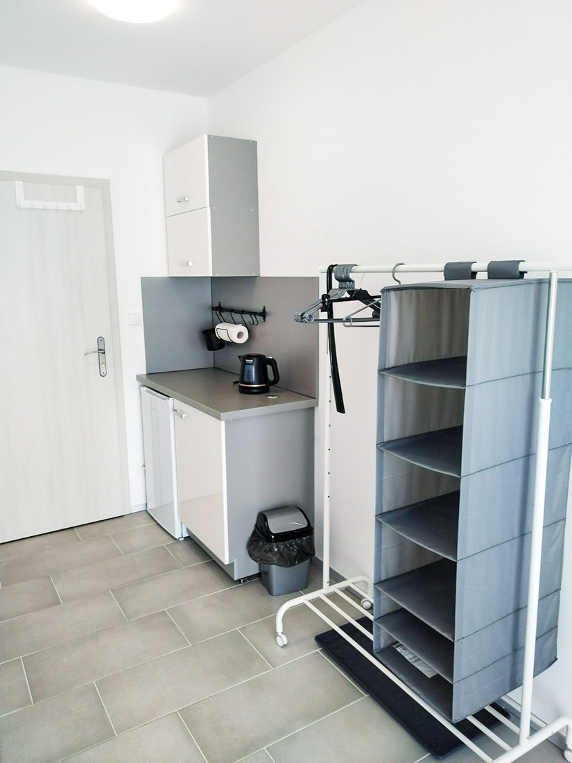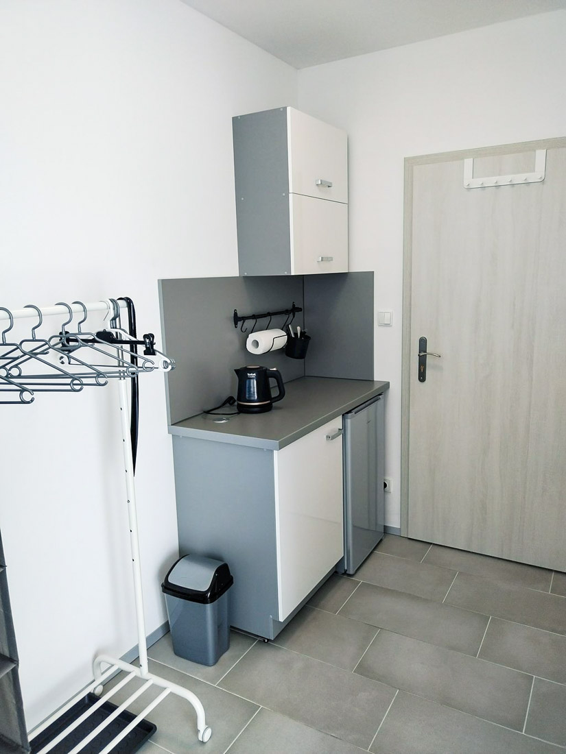 Pro hosty je k dispozici také společná kuchyňka, vybavená mikrovlnnou troubou, indukčním vařičem, toustovačem, topinkovačem a potřebným nádobím. Tato kuchyňka je ideální pro přípravu snídaní či lehkých jídel.