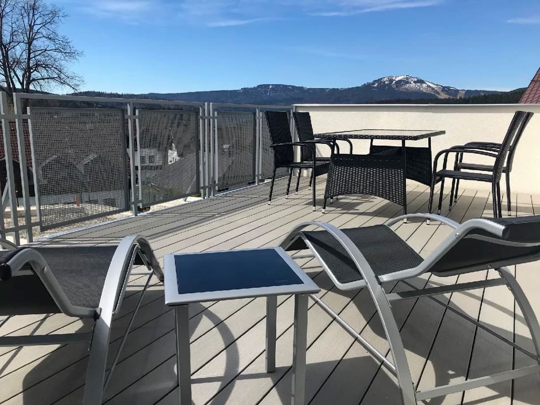 Panoramatický apartmán v prvním patře zaujme především velkou 25m² terasou s lehátky a výhledem na Velký Javor. Ideální je pro rodiny či menší skupiny přátel. K dispozici je samostatná ložnice s manželskou postelí a jednolůžkem, obývací pokoj s rozkládací postelí, plně vybavená kuchyň a koupelna se sprchovým koutem a WC. I zde nechybí WiFi, vlastní parkovací místo a úložný prostor pro sportovní vybavení.