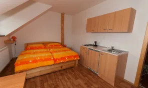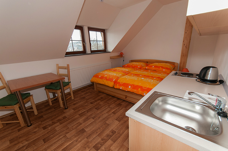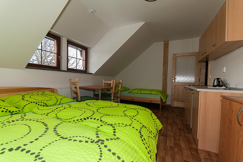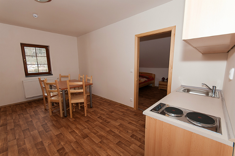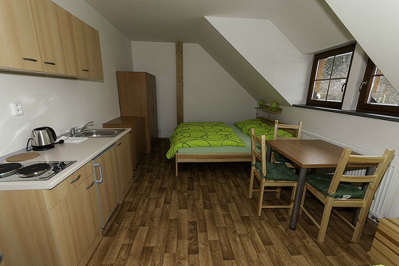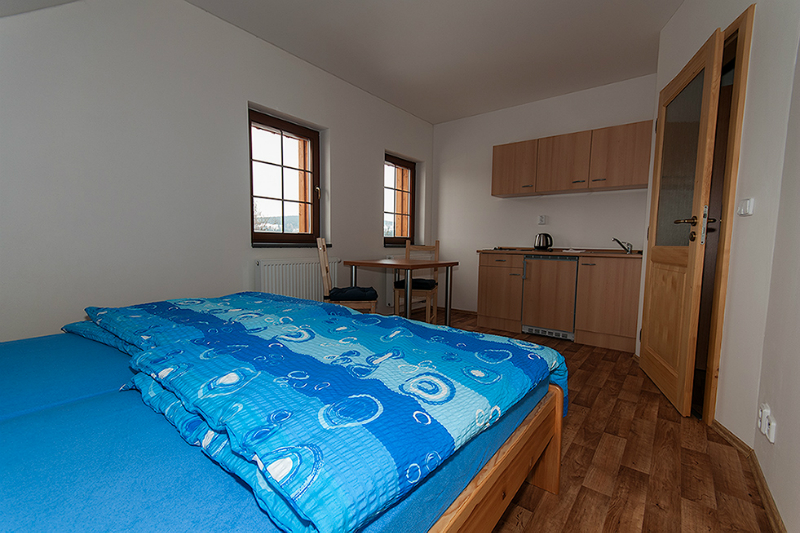 Ubytování disponuje celkem čtyřmi apartmány pojmenovaných podle šumavských vrcholů. Největší z nich, Boubín, je vybaven třemi pevnými lůžky s možností přidání dvou přistýlek a navýšení kapacity na pět osob. Dále ubytování nabízí třílůžkový aparmán Javorník a dva dvoulůžkové apartmány Popelná a Přilba. Celková kapacita objektu je 12 osob.