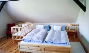 Chalupa hostům nabízí celkem tři kompletně vybavené ložnice: jeden dvoulůžkový pokoj a dva čtyřlůžkové pokoje. Pro rodiny s malými dětmi je k dispozici také dětská postýlka. Pro zajištění maximálního pohodlí mají hosté k užívání dvě koupelny a WC, přičemž ve vybavení nechybí ani automatická pračka.