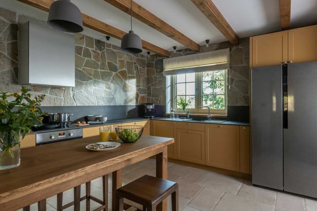 Pro setkání všech hostů a večerní posezení je v přízemí obývací pokoj, ve kterém můžete z pohodlí na gauči sledovat televizi. V zimě atmosféru zpříjemní oheň v krbu. Je zde i jídelní stůl se židlemi. Vedle obývacího pokoje je nadstandardně a moderně vybavená kuchyně, ve které je americká lednice s mrazákem, elektrická trouba, sklokeramická varná deska, myčka nádobí, mikrovlnná trouba, rychlovarná konvice, kávovar De’Longhi a potřebné kuchyňské nádobí a náčiní.