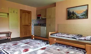 Chalupa Školka nabízí celoroční ubytování v přízemním, bezbariérovém objektu se 7 ložnicemi a kapacitou přibližně 5 až 29 osob. Hosté mají k dispozici čtyři čtyřlůžkové pokoje, jeden pětilůžkový pokoj s vlastním kuchyňským koutem a dva čtyřlůžkové apartmány s vlastní koupelnou, kuchyňským koutem a TV. Všechny pokoje jsou nově zrekonstruované, vybavené lůžky z masivu s kvalitními matracemi, kompletními lůžkovinami a novými koberci. Pro rodiny s dětmi je připravena řada praktického vybavení – dětské postýlky včetně povlečení, jídelní židlička, přebalovací pult, vanička, nočníky, bytová houpačka, hračky, dětský koutek i společenské hry. Sociální zázemí je řešeno velmi komfortně: samostatná dámská/rodinná koupelna s přebalovacím pultem, vaničkou, nízkými umyvadly, toaletami a sprchami, samostatná pánská koupelna s dvěma sprchovými kouty, toaletami a pisoárem a vlastní sociální zařízení ve dvou apartmánech.
