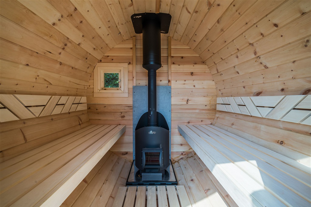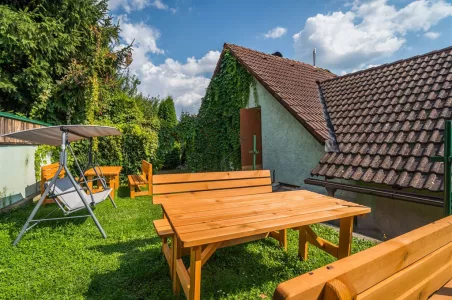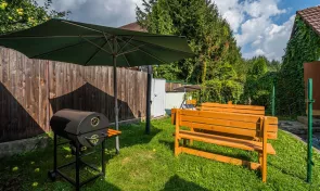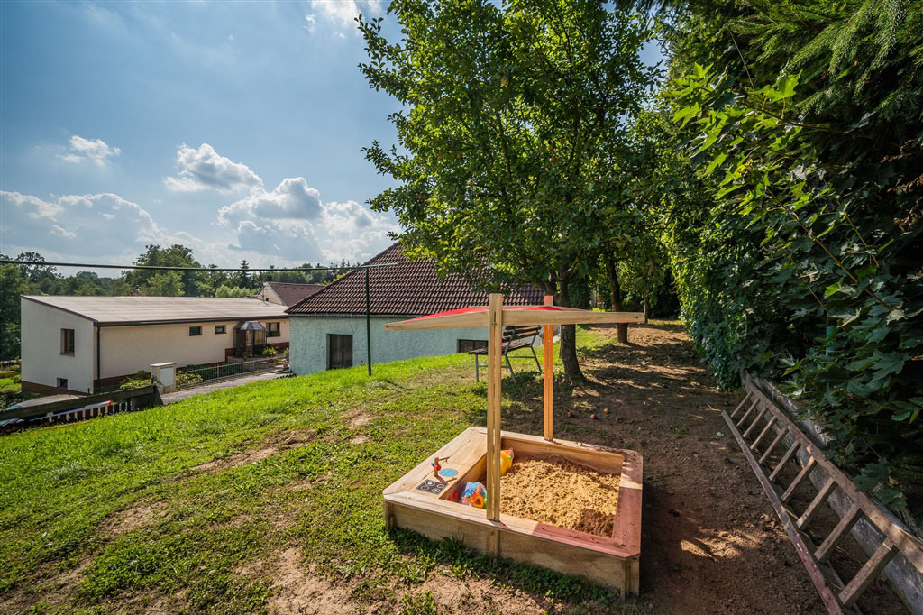 Součástí areálu je rozlehlá zahrada s bazénem, srubovou saunou, venkovní koupací kádí, pergolou s posezením a grilem. Nechybí ani ohniště, pískoviště a hřiště pro děti.
