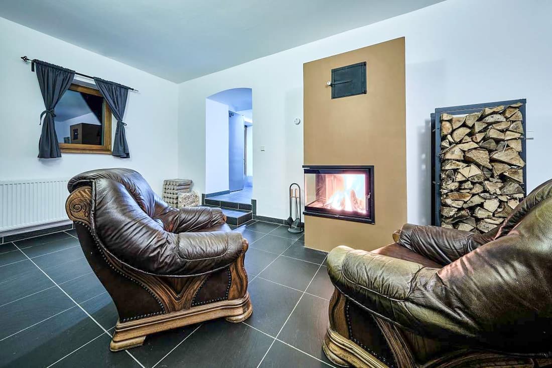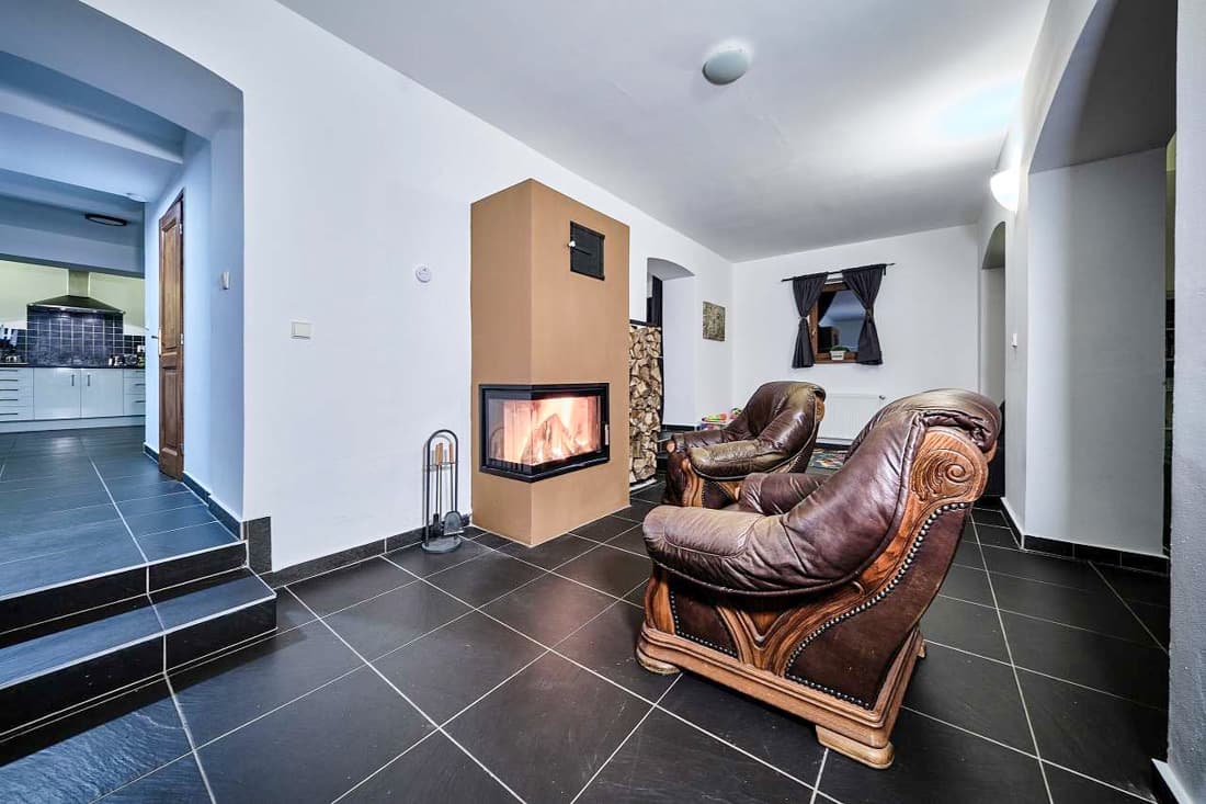Dominantou chalupy je velký obývací prostor rozdělený na relaxační část s krbem a prosvětlenou část s francouzskými okny, která propojuje interiér s terasou a zahradou. Plně vybavená kuchyně (elektrická indukční varná deska, 3x lednice s mrazničkou, horkovzdušná trouba, mikrovlnná trouba) a prostorná jídelna umožňují pohodlné vaření i stolování pro všechny hosty.