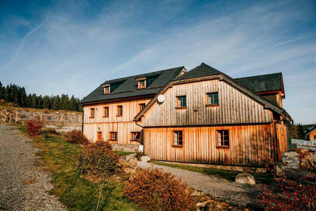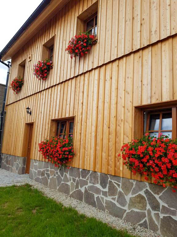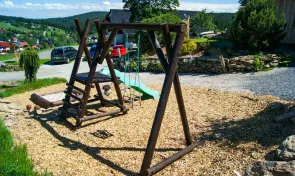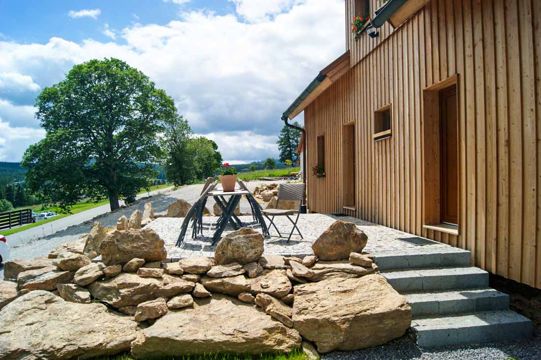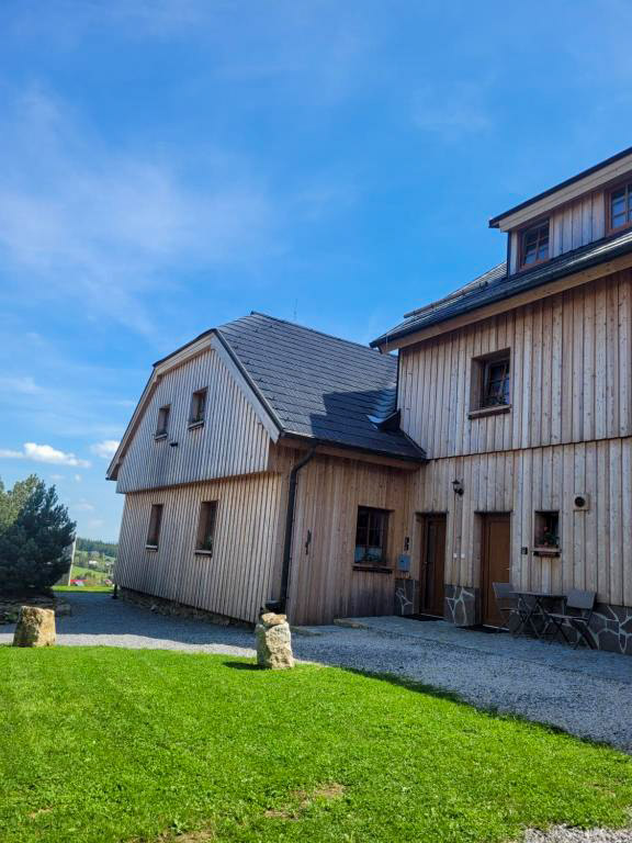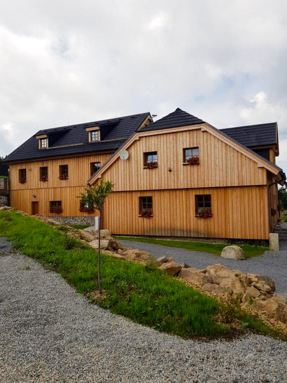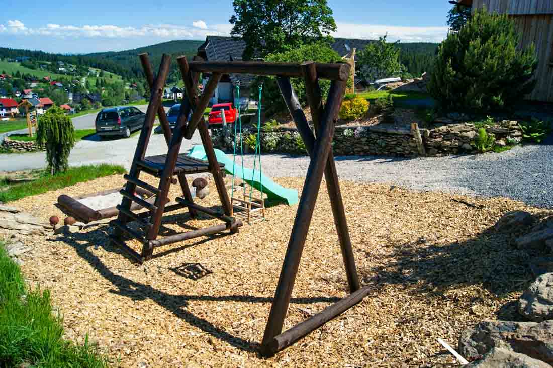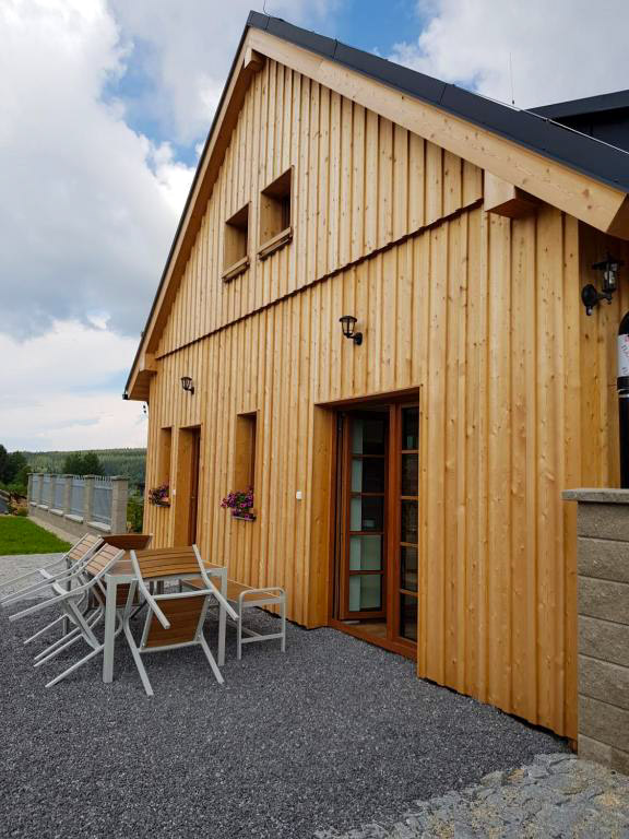 Součástí chaty je také příjemné venkovní zázemí, které ocení rodiny i skupiny přátel. Hosté mohou využít venkovní posezení se zahradním nábytkem. K dispozici je rovněž zahradní gril. Pro děti je připraven venkovní prostor pro hraní s pískovištěm, skluzavkou a houpačkou. Přímo na zahradu navazuje les a louka a v zimě od chaty nastoupíte na běžeckou stopu.
