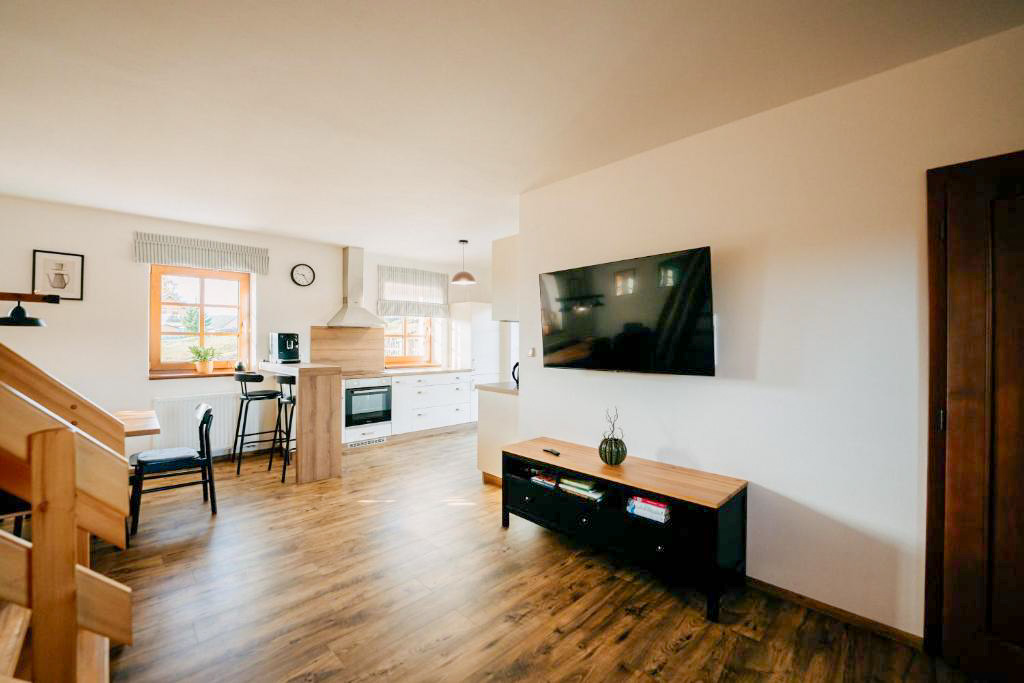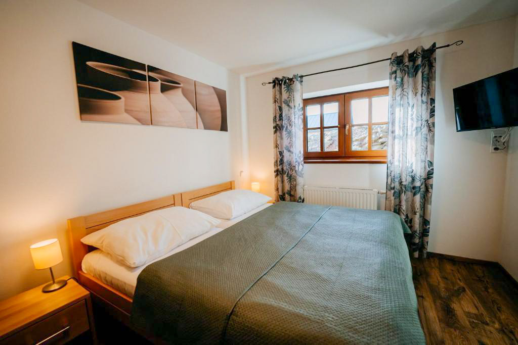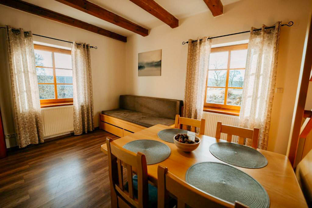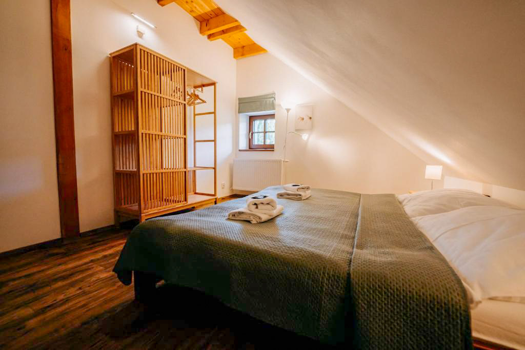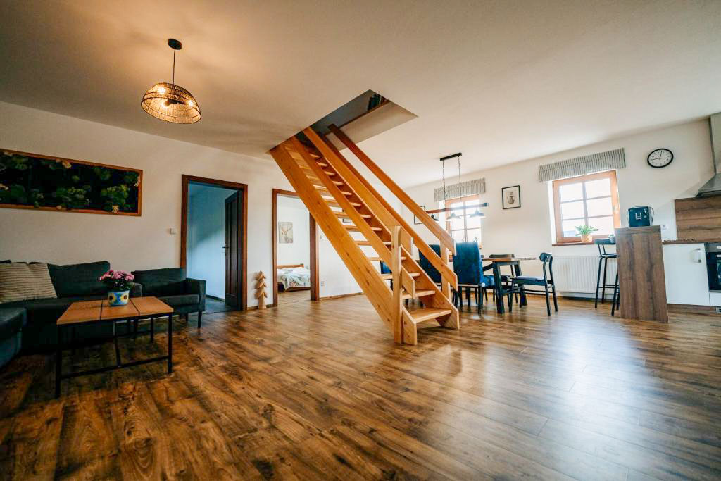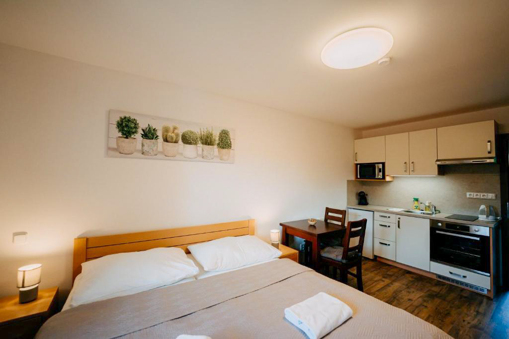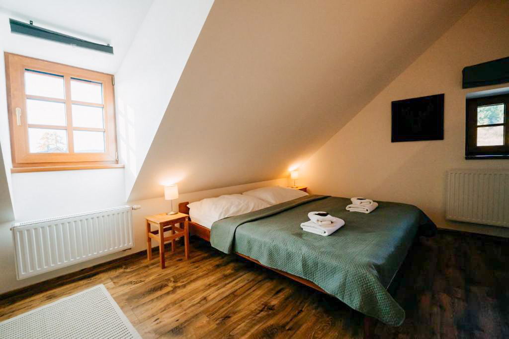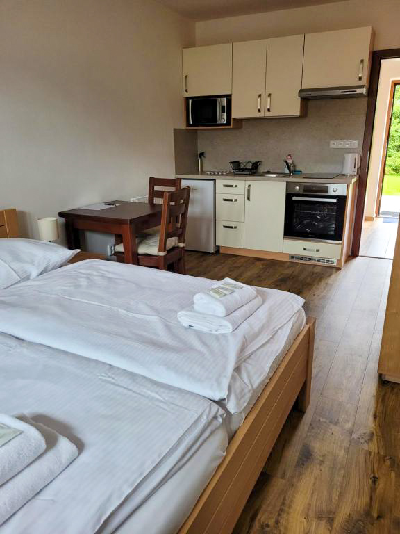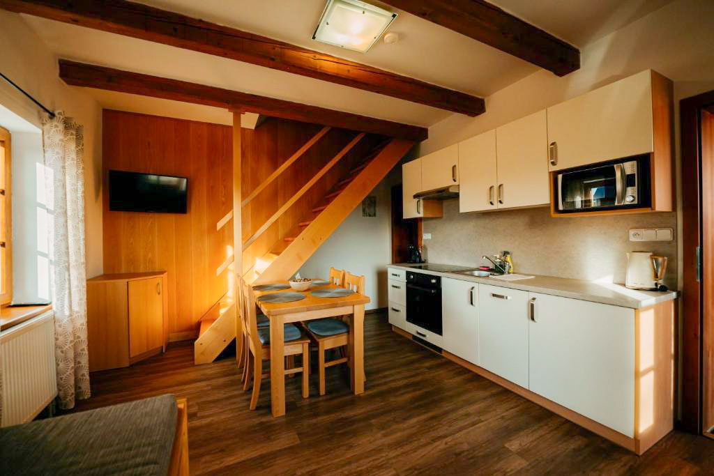 Ubytování je zajištěno v komfortně vybavených apartmánech různé velikosti, od dvoulůžkových, po pětilůžkové a jeden desetilůžkový aparmán. Všechny aparmány disponují plně vybavenou kuchyňkou (lednice, varná deska, myčka nádobí, mikrovlnná trouba, horkovzdušná trouba, kávovar i nádobí), vlastní koupelnou, televizorem a Wi-Fi v celém objektu. Každý apartmán má samostatný vstup, což hostům zajišťuje dostatek soukromí. Ručníky, ložní prádlo i základní toaletní potřeby jsou samozřejmostí. K dispozici je rovněž i finská sauna.