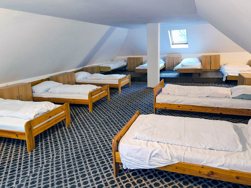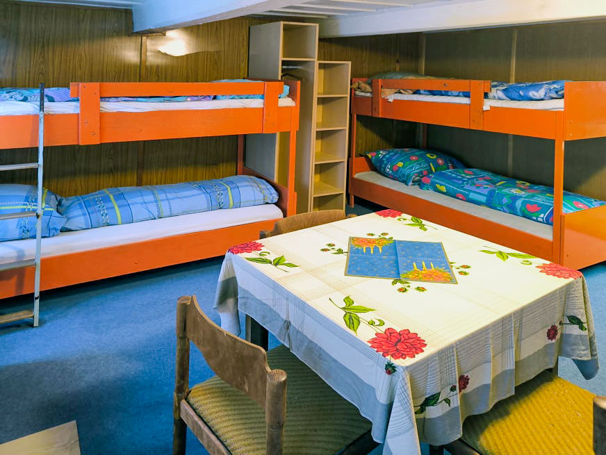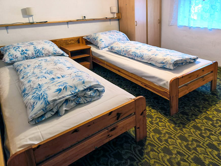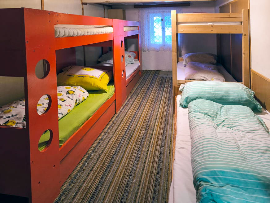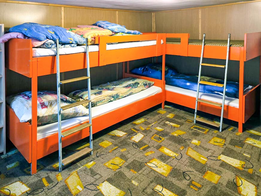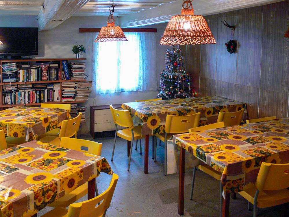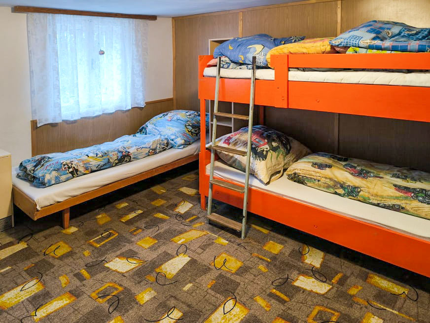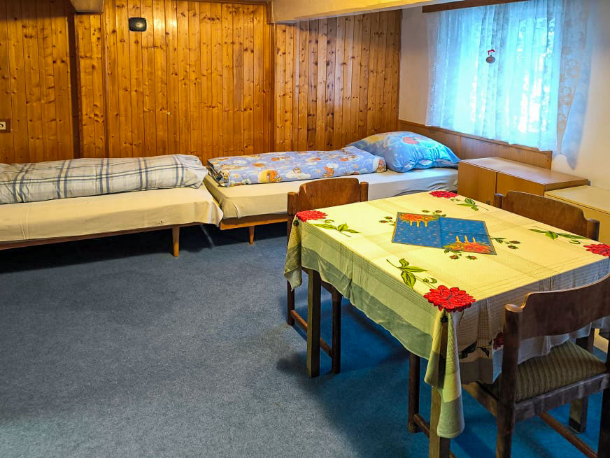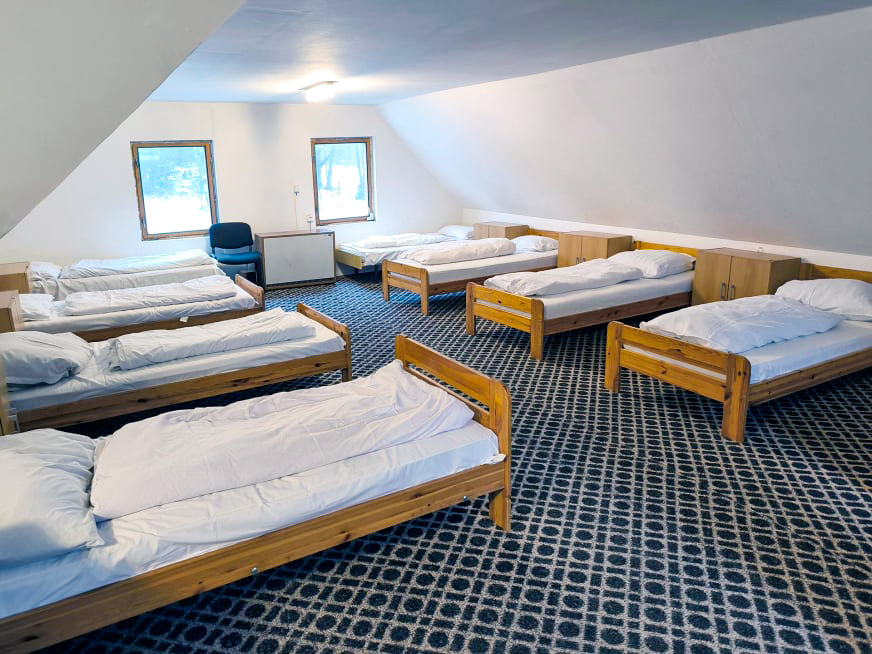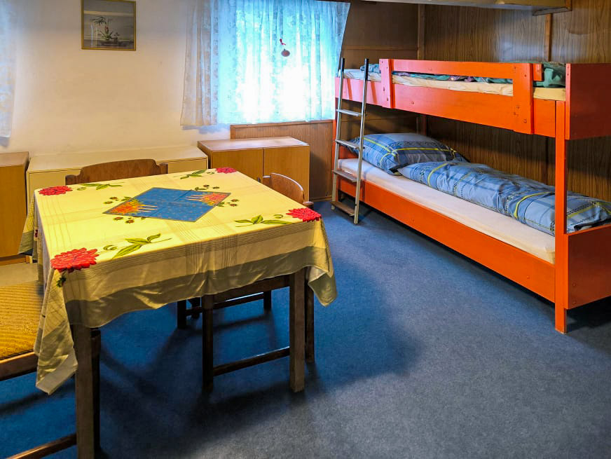 Hlavní budova poskytuje kapacitu až 52 lůžek v útulných pokojích s 2 až 6 lůžky. V přízemí jsou dvě společné koupelny (samostatně pro ženy a muže) a toalety v patře. Společenská místnost s jídelnou tvoří srdce objektu – kromě stravování zde hosté mohou trávit čas u televize, s knihou či stolními hrami. K dispozici je i menší bar a kuchyňský koutek s mikrovlnkou, rychlovarnou konvicí a lednicí.
