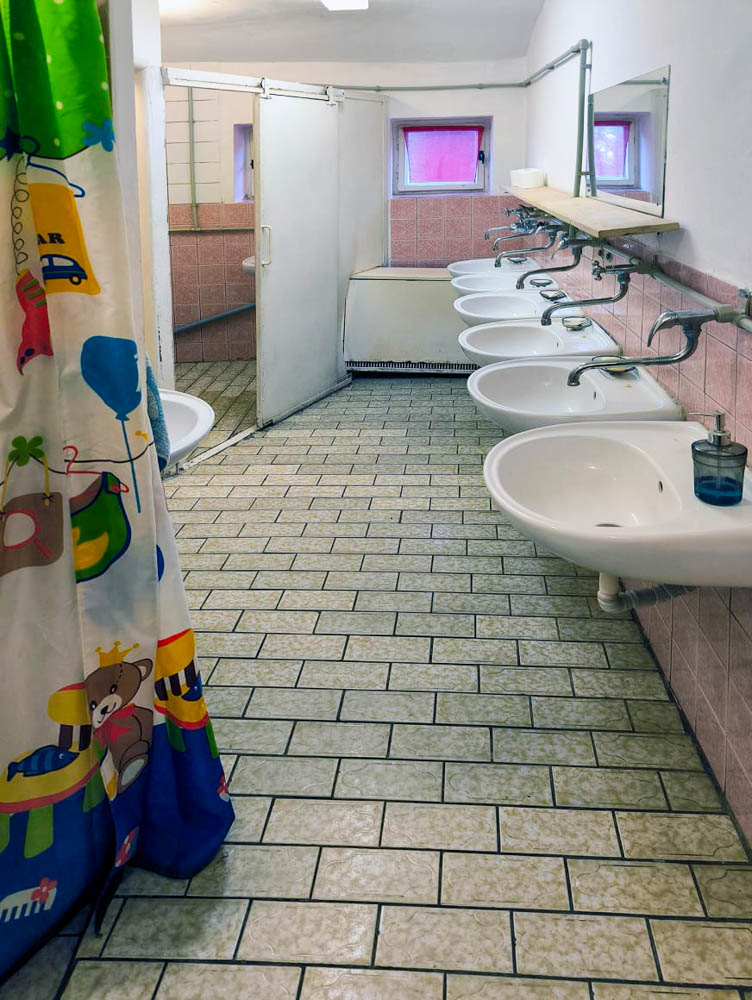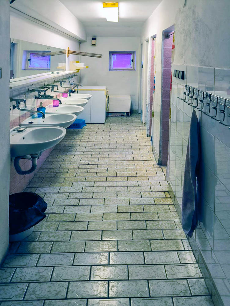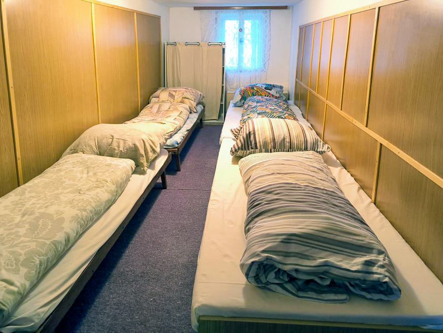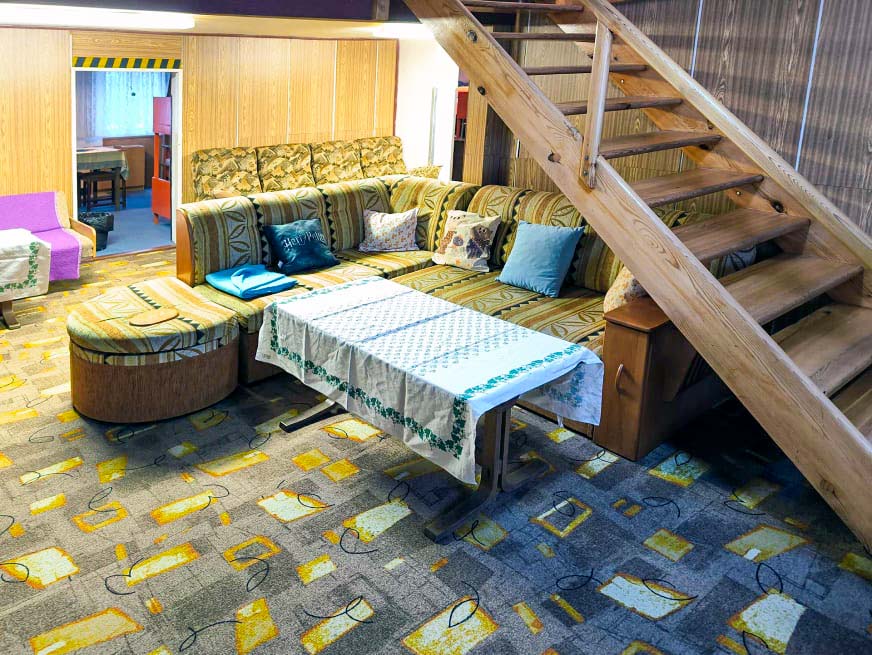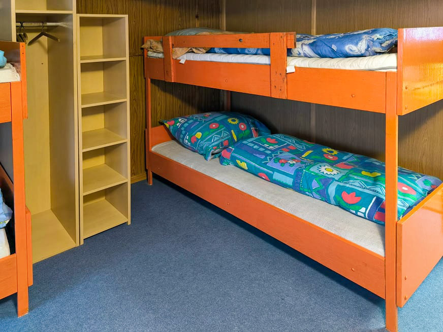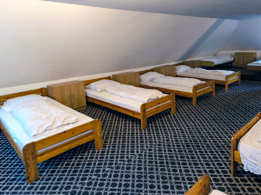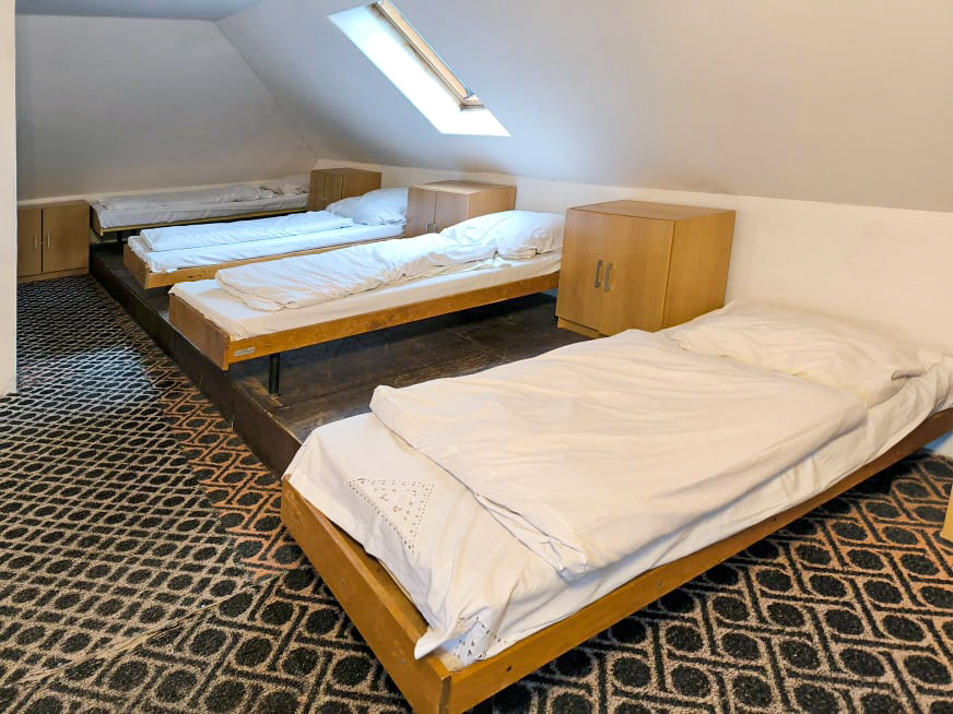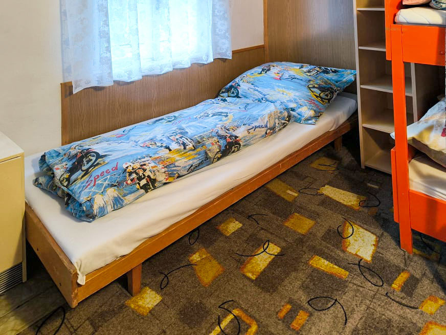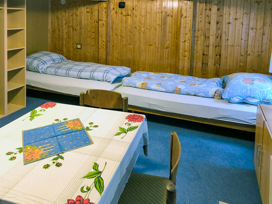 Hlavní budova poskytuje kapacitu až 52 lůžek v útulných pokojích s 2 až 6 lůžky. V přízemí jsou dvě společné koupelny (samostatně pro ženy a muže) a toalety v patře. Společenská místnost s jídelnou tvoří srdce objektu – kromě stravování zde hosté mohou trávit čas u televize, s knihou či stolními hrami. K dispozici je i menší bar a kuchyňský koutek s mikrovlnkou, rychlovarnou konvicí a lednicí.