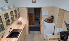 Pro hosty jsou k dispozici dvě plně vybavené kuchyně. Jedna se nachází v přízemí a druhá v patře. Jsou vybavené myčkou nádobí, mikrovlnnou troubou, sklokeramickou varnou deskou, elektrickou troubou, lednicí, rychlovarnou konvicí, topinkovačem a kuchyňským náčiním. Společenské místnosti v přízemí i podkroví jsou vybaveny televizí se satelitním připojením. V přízemí je navíc krb a v patře mini audio věž. Celý objekt je pokrytý Wi-Fi připojením k internetu. Majitel možnost nabízí zapůjčení výčepního zařízení.