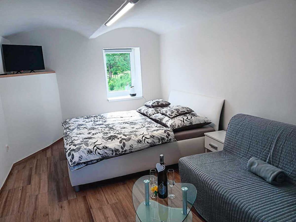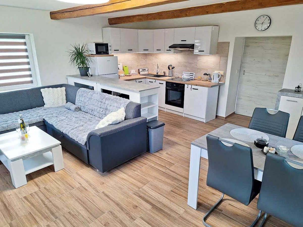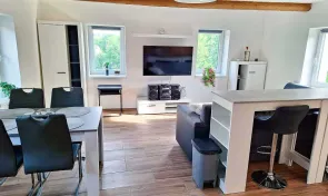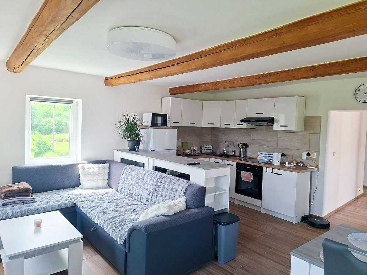 Srdcem chalupy je společný obytný prostor s posezením, televizí a jídelním koutem, navazující na plně vybavenou kuchyň. K dispozici je lednice, myčka, multifunkční sporák, mikrovlnka, kávovar, varná konvice i veškeré potřebné nádobí, takže si komfortně uvaříte jako doma. Moderní koupelna se sprchovým koutem, WC a pračkou se sušičkou zpříjemní hlavně delší pobyty – nemusíte řešit mokré ručníky ani dětské oblečení po celodenních výletech.