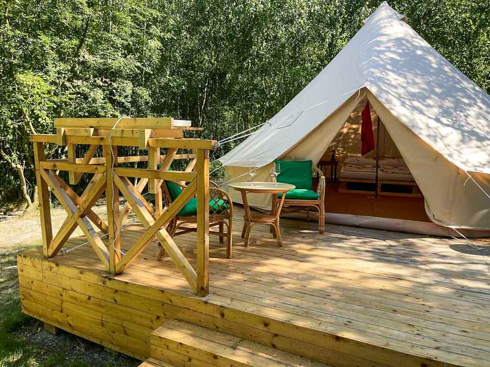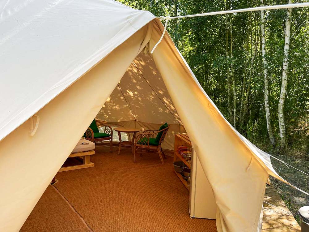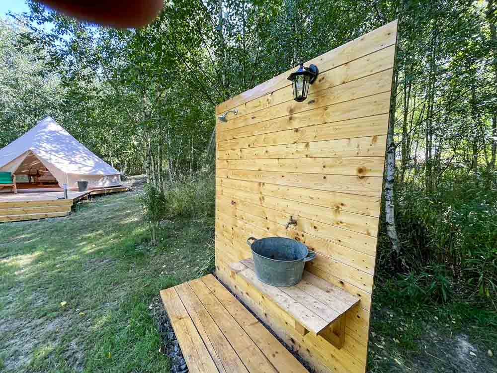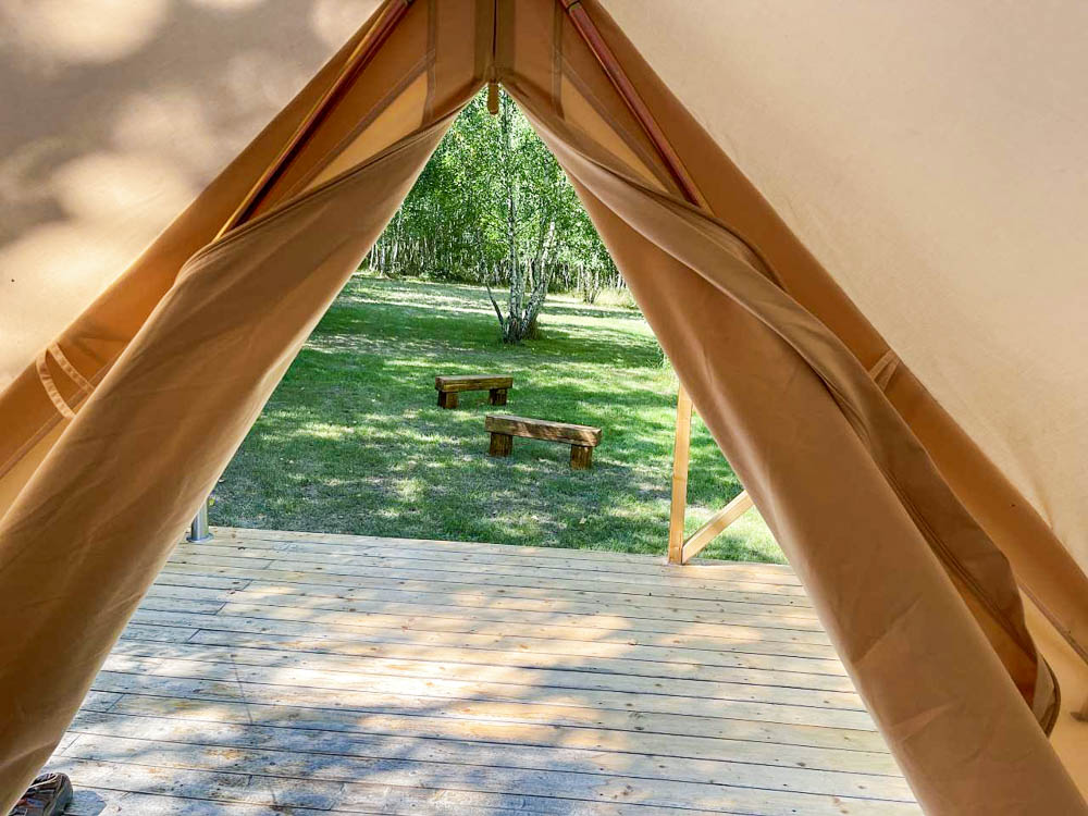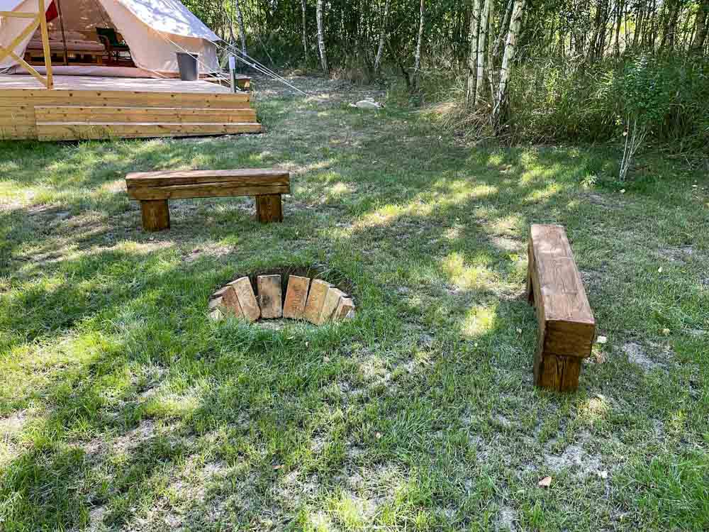 Ke každému stanu patří terasa s posezením, venkovní ohniště s dřevem, travnatá plocha a možnost zaparkovat automobil asi 50 metrů od místa ubytování. Atmosféru pobytu dokresluje klidné prostředí přírody a večerní posezení u ohně.