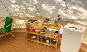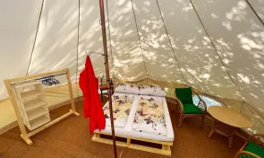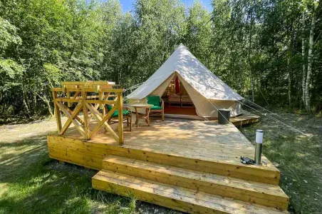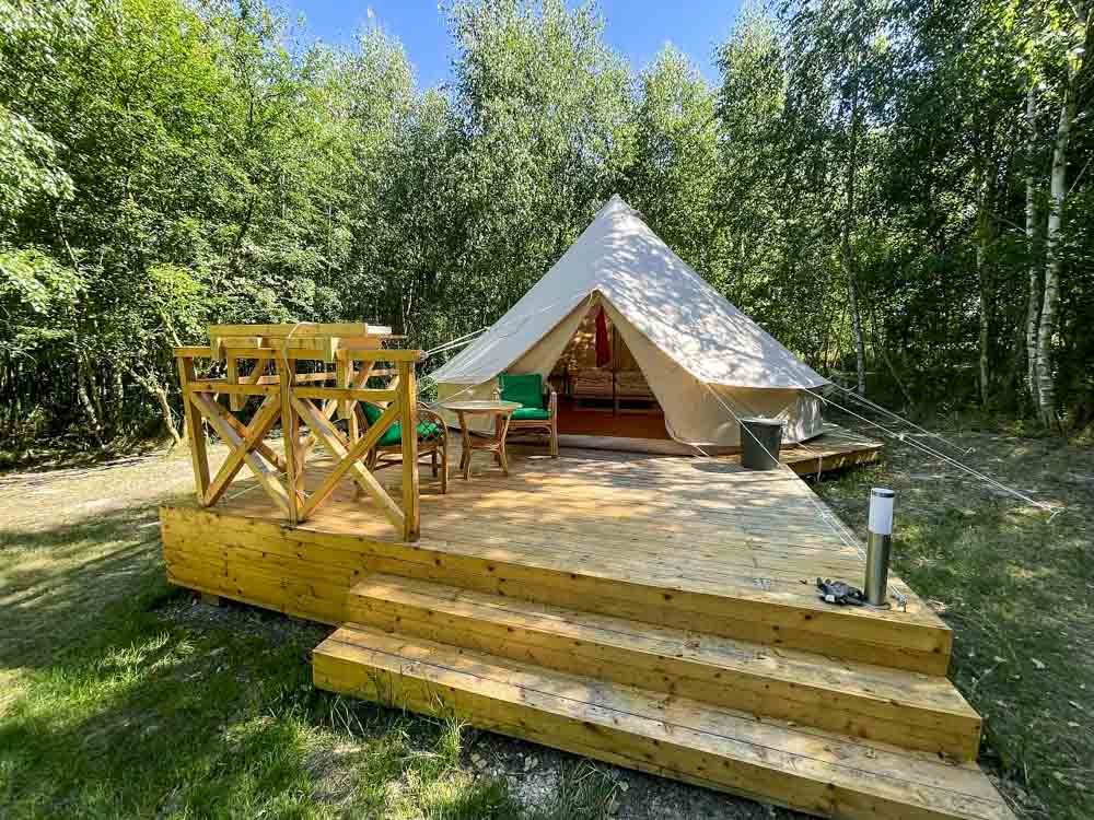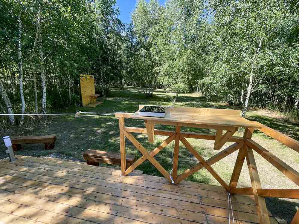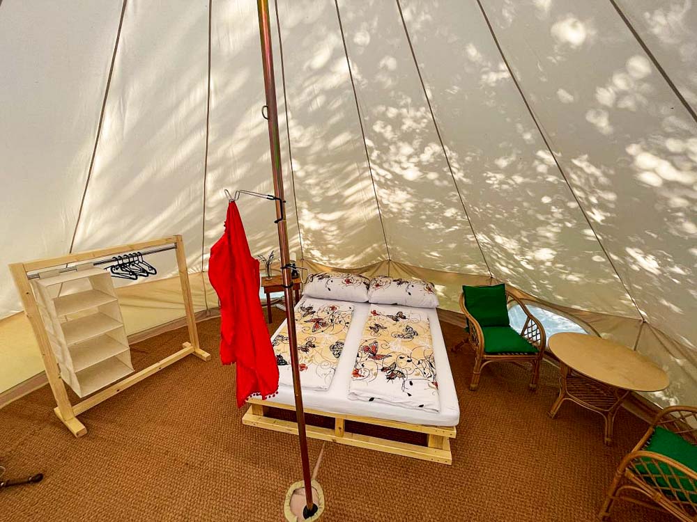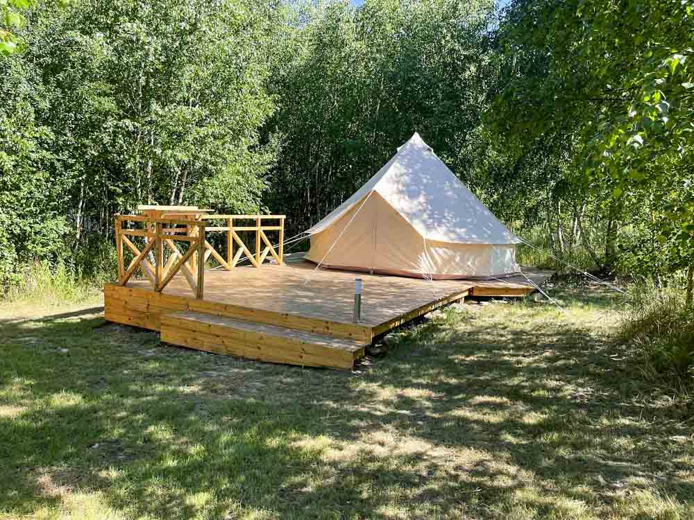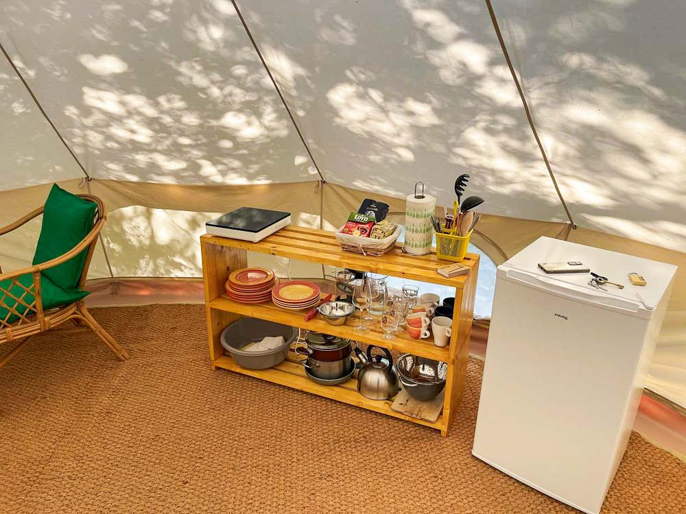 Ke každému stanu patří terasa s posezením, venkovní ohniště s dřevem, travnatá plocha a možnost zaparkovat automobil asi 50 metrů od místa ubytování. Atmosféru pobytu dokresluje klidné prostředí přírody a večerní posezení u ohně.