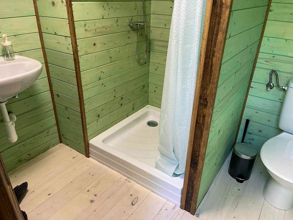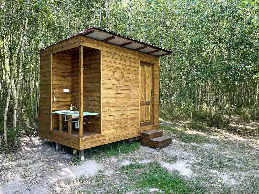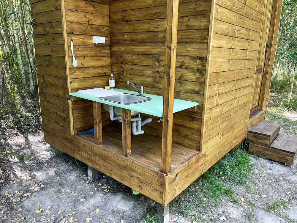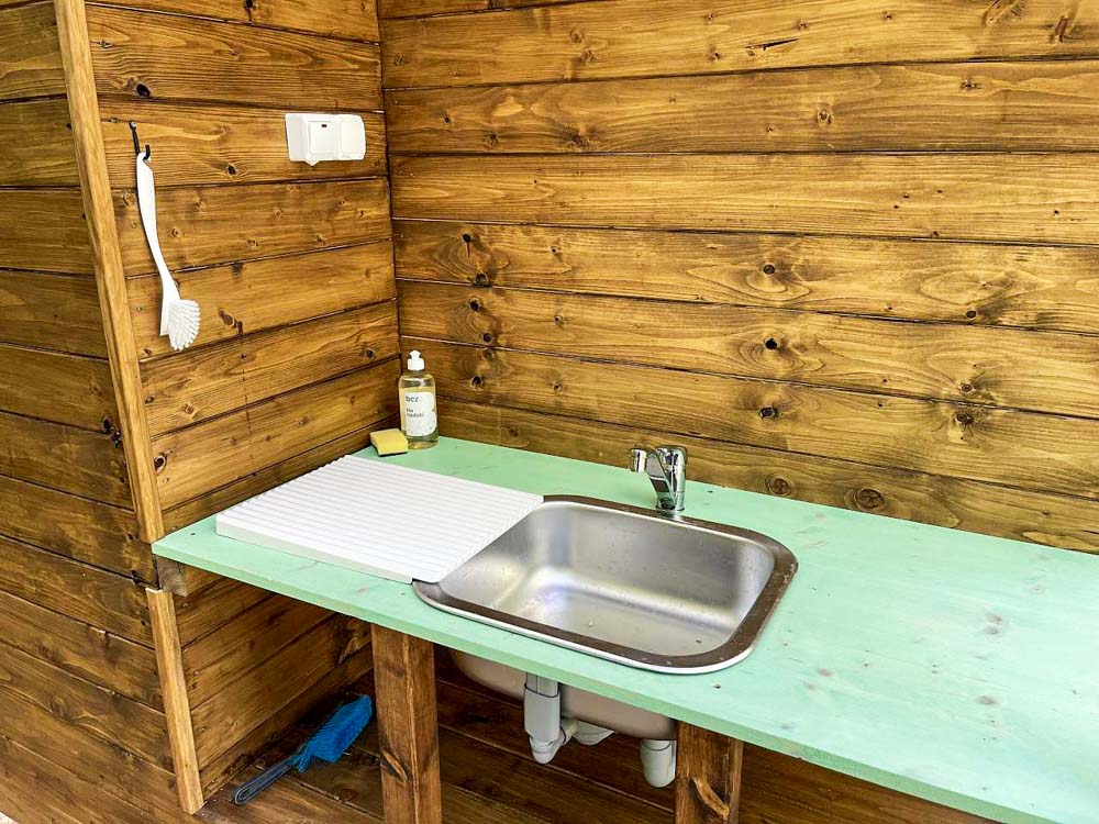 Sociální zázemí je umístěno v nové dřevěné chatce, která slouží pouze pro tyto dva stany. Najdete zde splachovací WC, sprchu s teplou vodou, umyvadlo a prostor pro umývání nádobí. V létě lze využít také venkovní sprchu se studenou vodou.