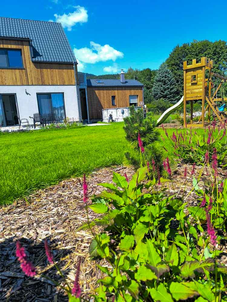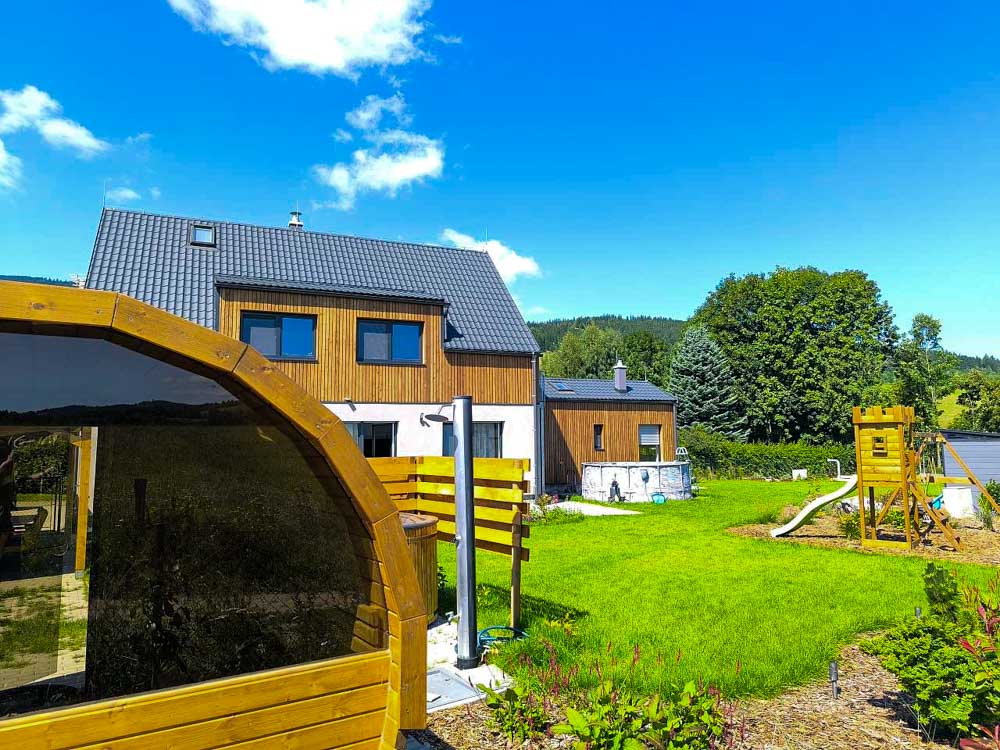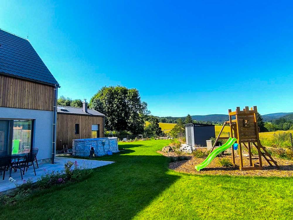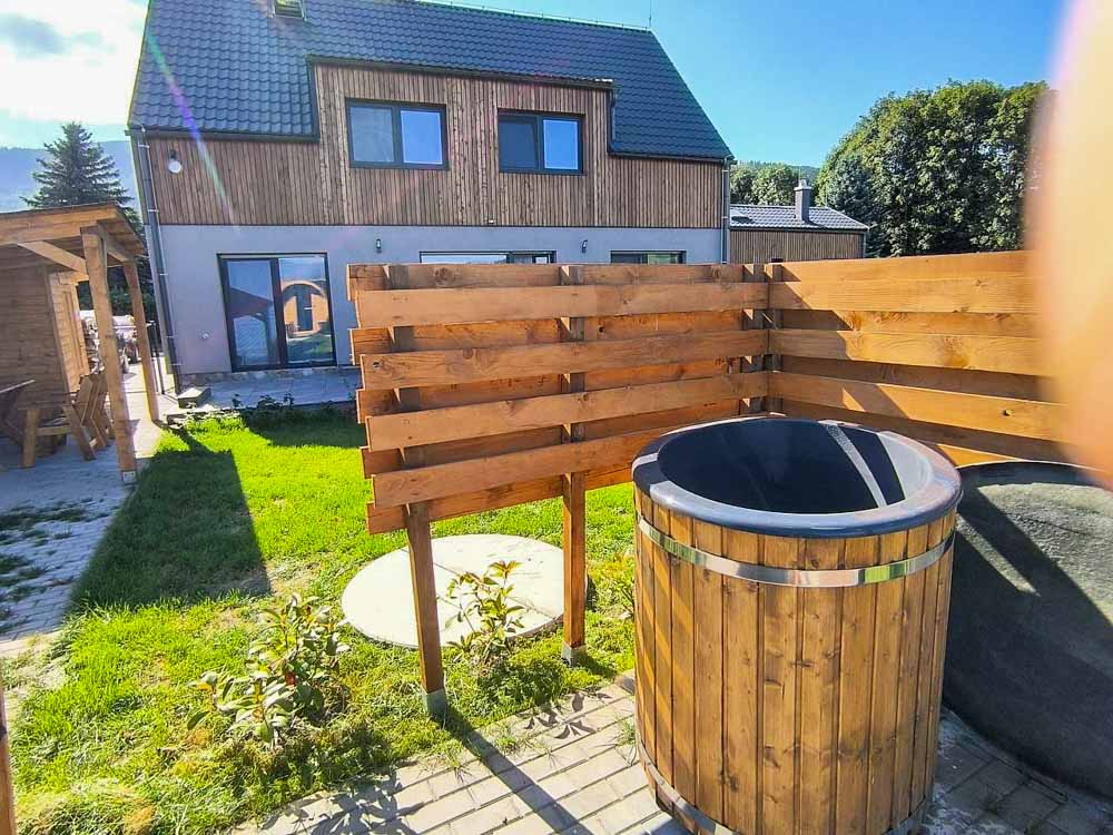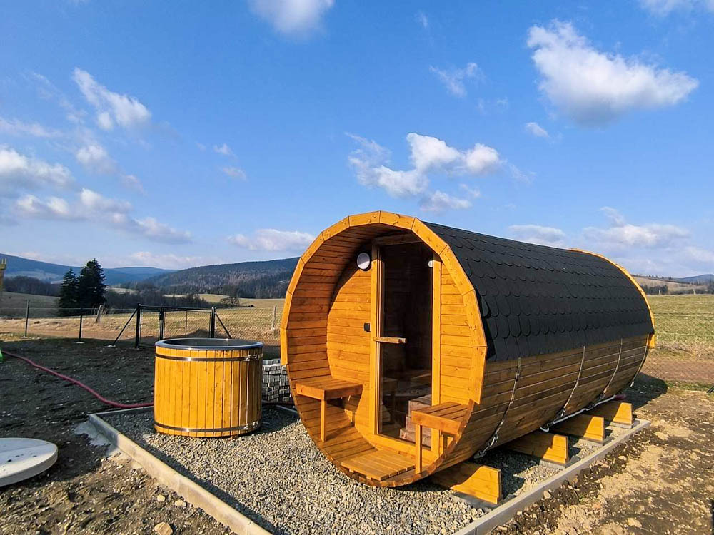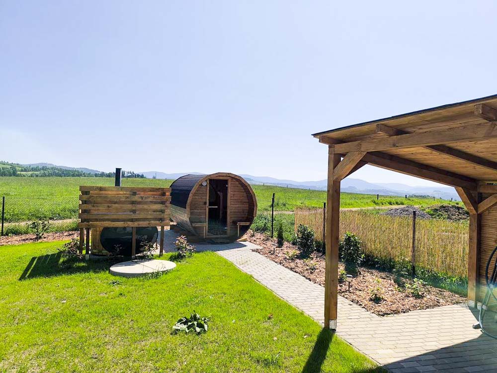 Venkovní zázemí je společné pro oba objekty a tvoří skutečné srdce celého areálu. Hosté mohou využívat finskou saunu s výhledem na Paprsek, koupací sud, nadzemní bazén, dětské hřiště s prolézačkami, houpačkami a pískovištěm, gril, ohniště i kryté posezení. Celý pozemek je oplocený, parkování je zajištěno přímo u objektu a hosté mohou využít i zamykatelný domek pro uschování kol a lyží.