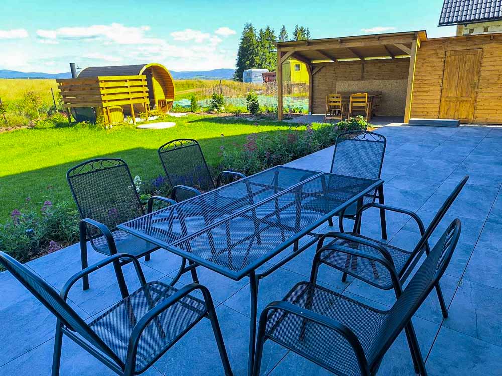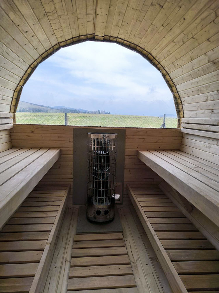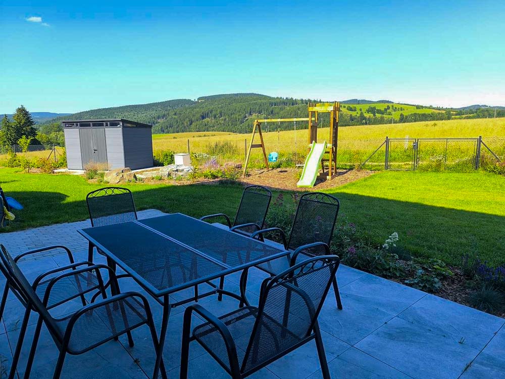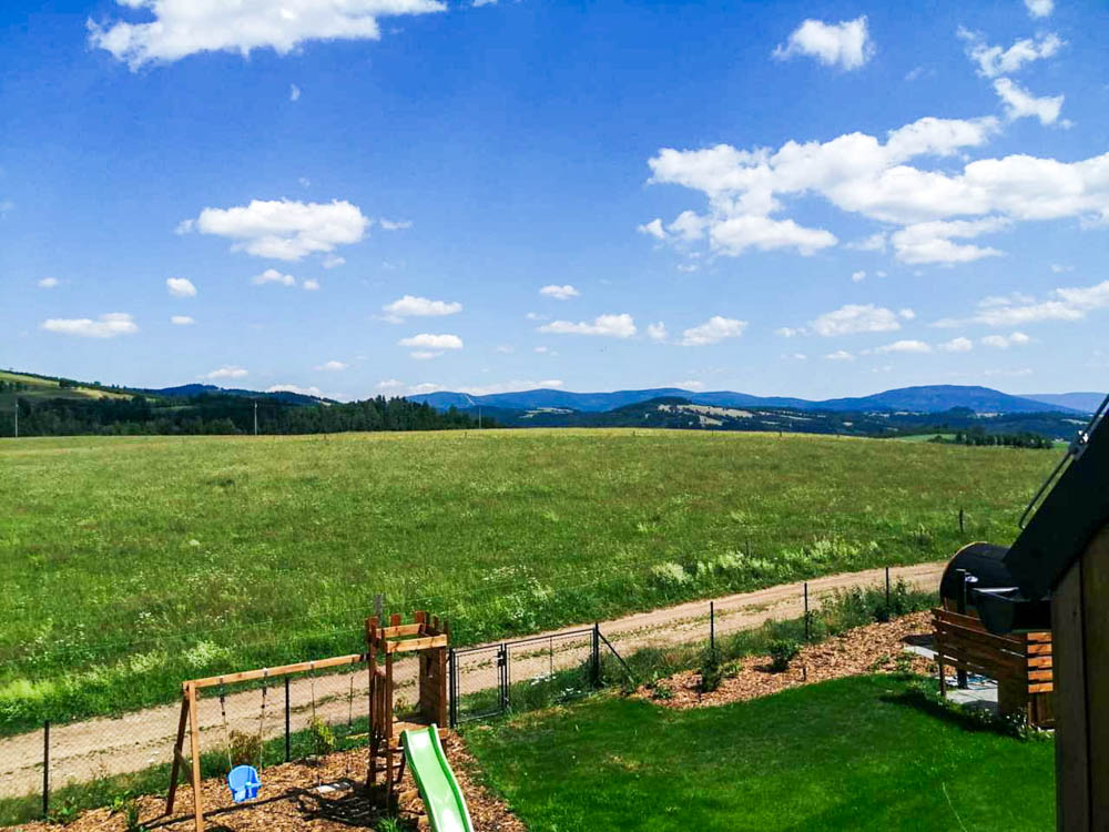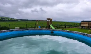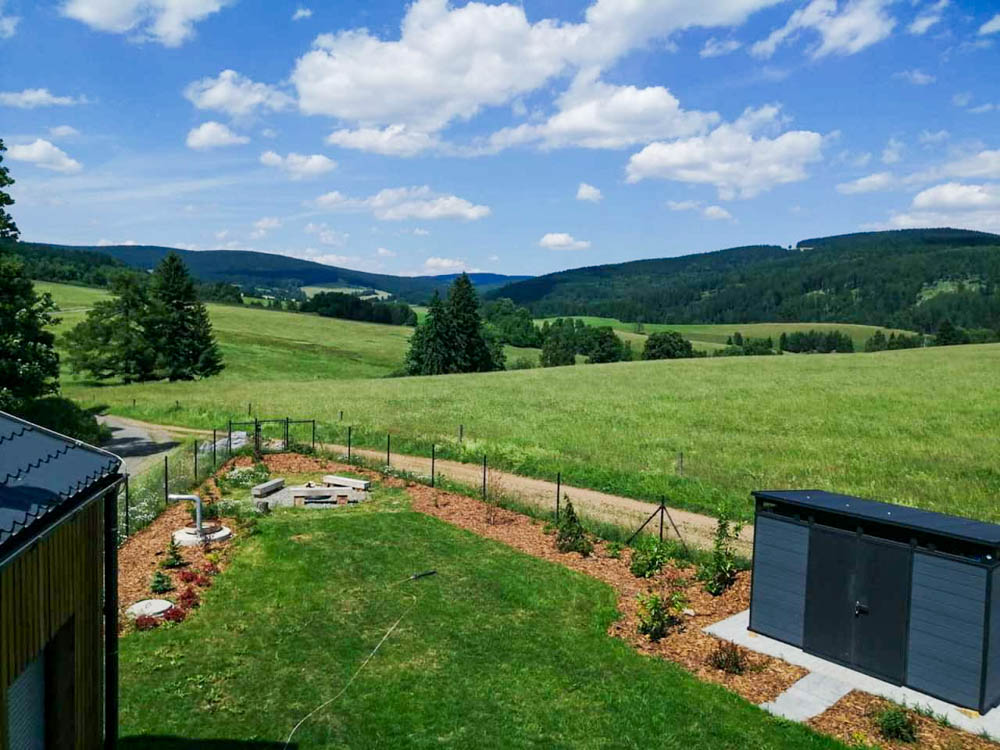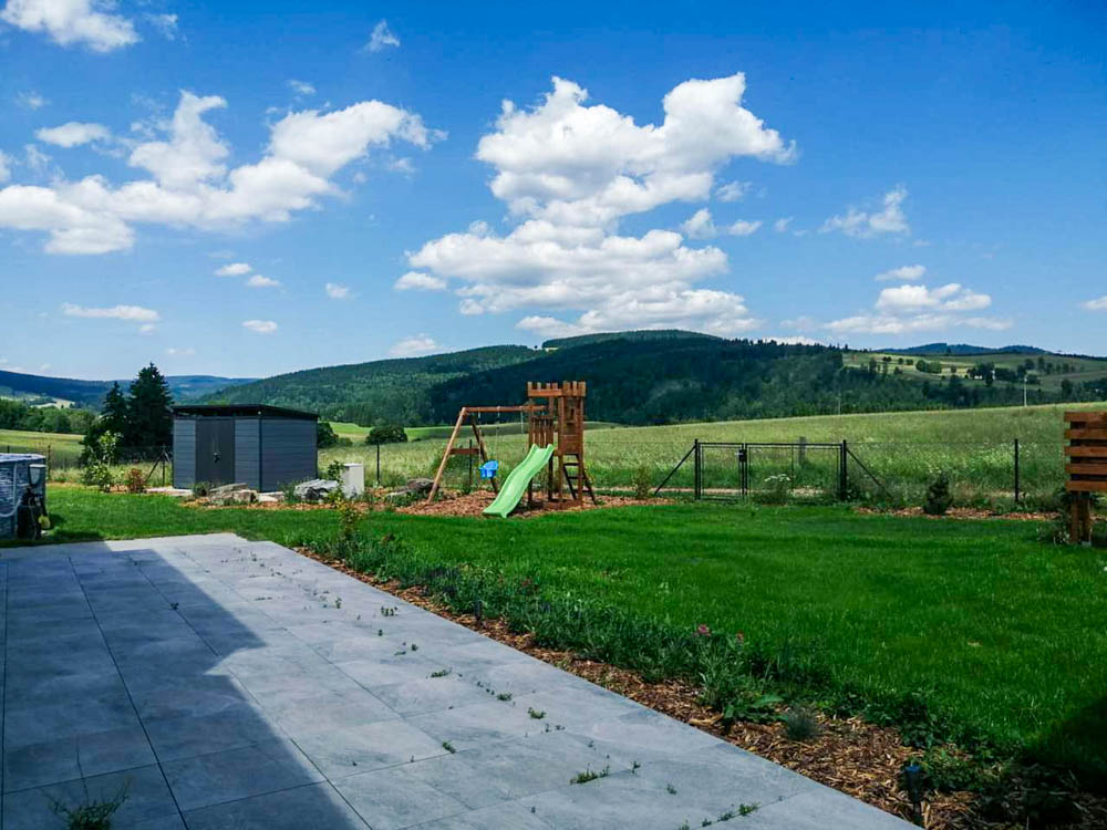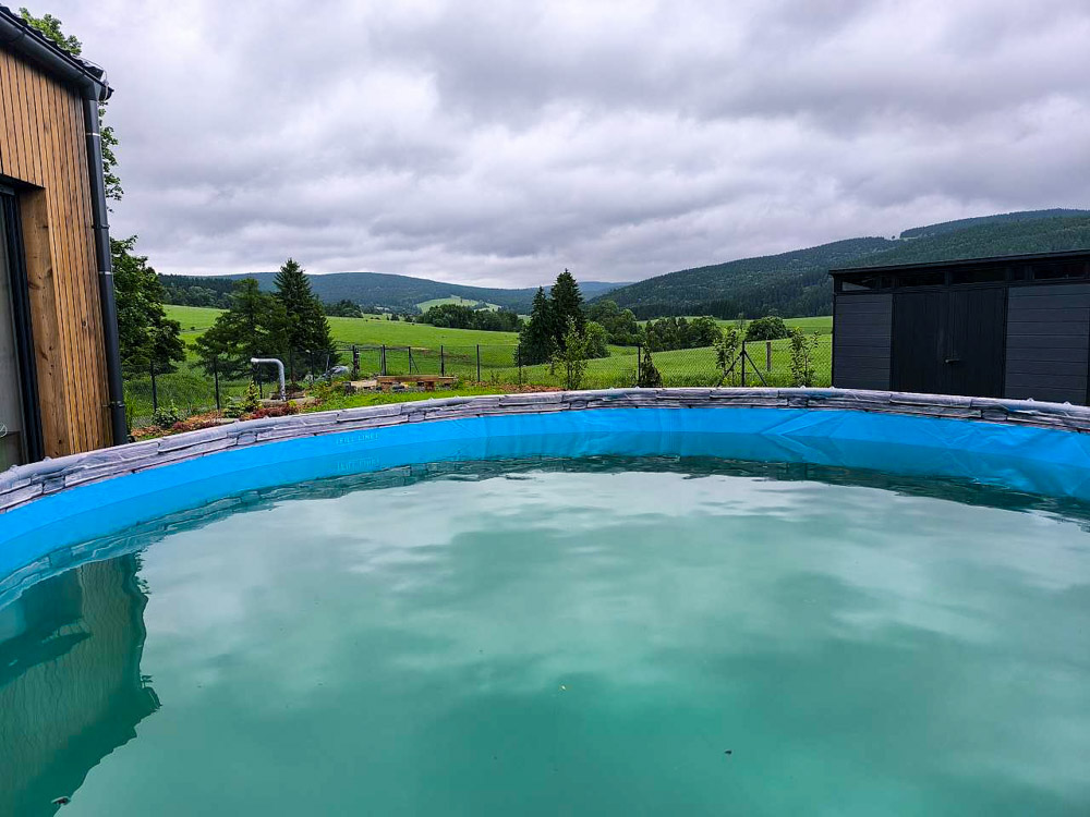 Venkovní zázemí je společné pro oba objekty a tvoří skutečné srdce celého areálu. Hosté mohou využívat finskou saunu s výhledem na Paprsek, koupací sud, nadzemní bazén, dětské hřiště s prolézačkami, houpačkami a pískovištěm, gril, ohniště i kryté posezení. Celý pozemek je oplocený, parkování je zajištěno přímo u objektu a hosté mohou využít i zamykatelný domek pro uschování kol a lyží.
