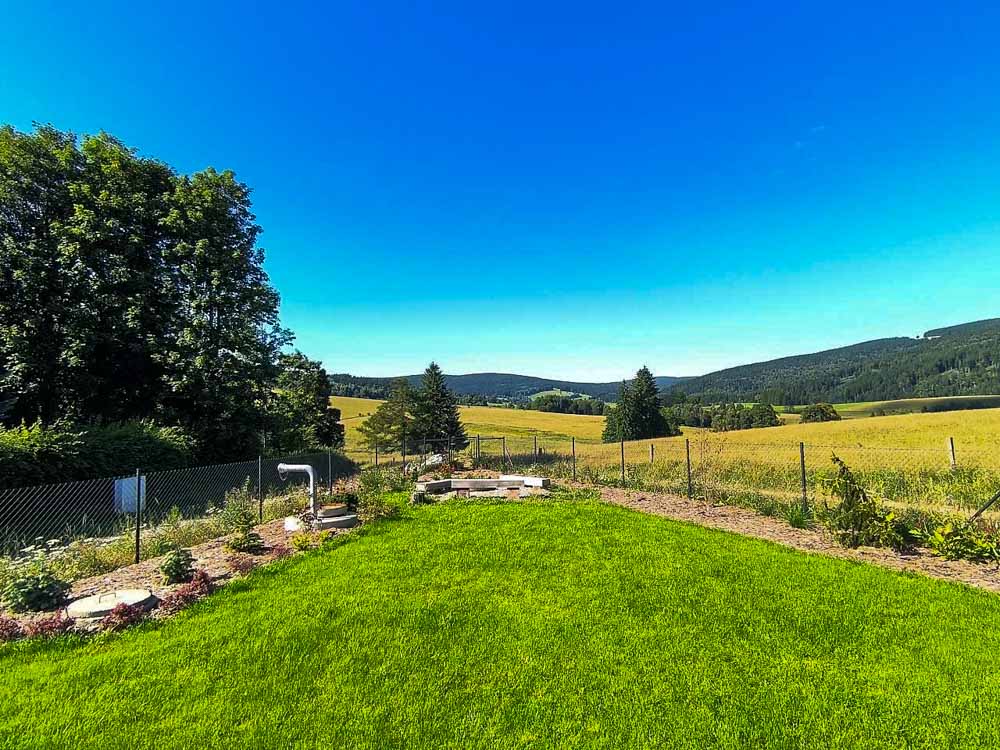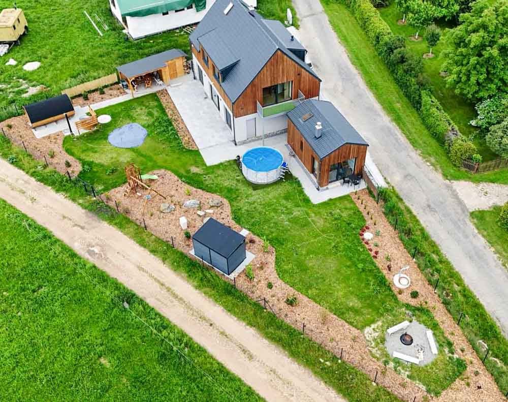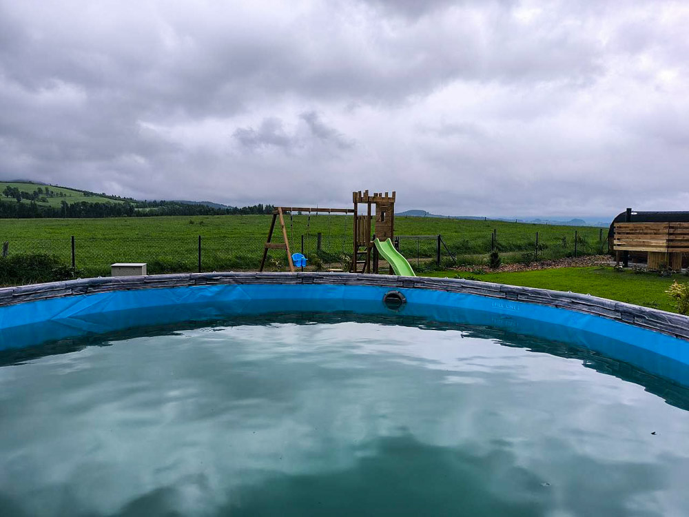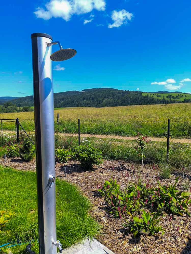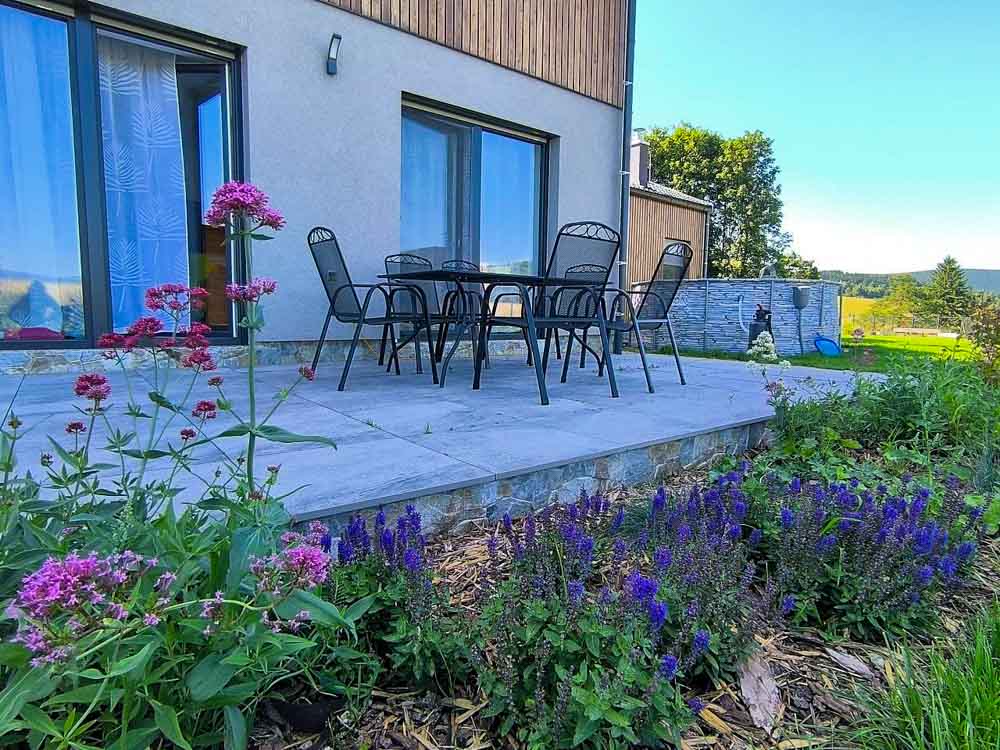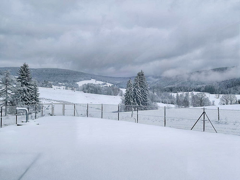 Venkovní zázemí je společné pro oba objekty a tvoří skutečné srdce celého areálu. Hosté mohou využívat finskou saunu s výhledem na Paprsek, koupací sud, nadzemní bazén, dětské hřiště s prolézačkami, houpačkami a pískovištěm, gril, ohniště i kryté posezení. Celý pozemek je oplocený, parkování je zajištěno přímo u objektu a hosté mohou využít i zamykatelný domek pro uschování kol a lyží.