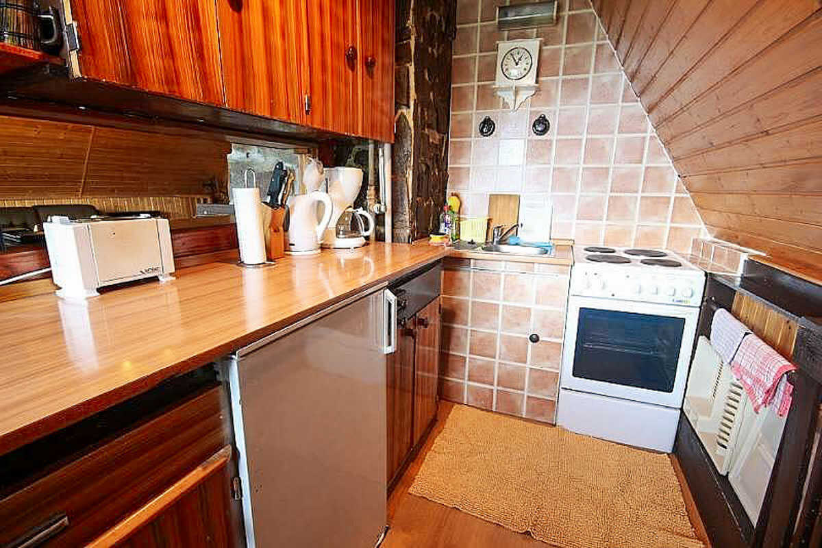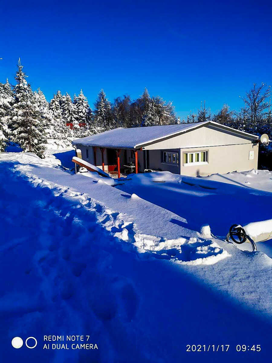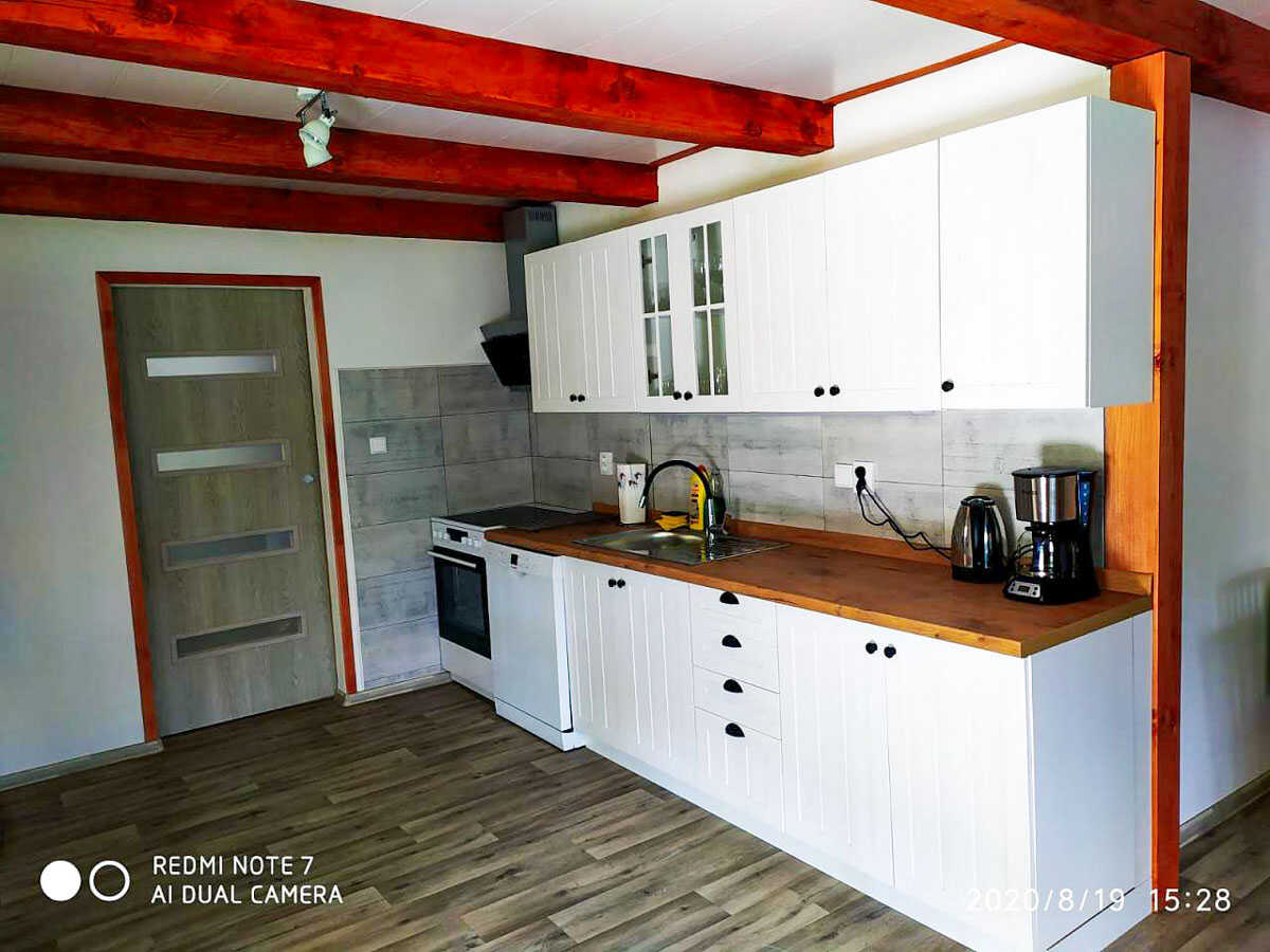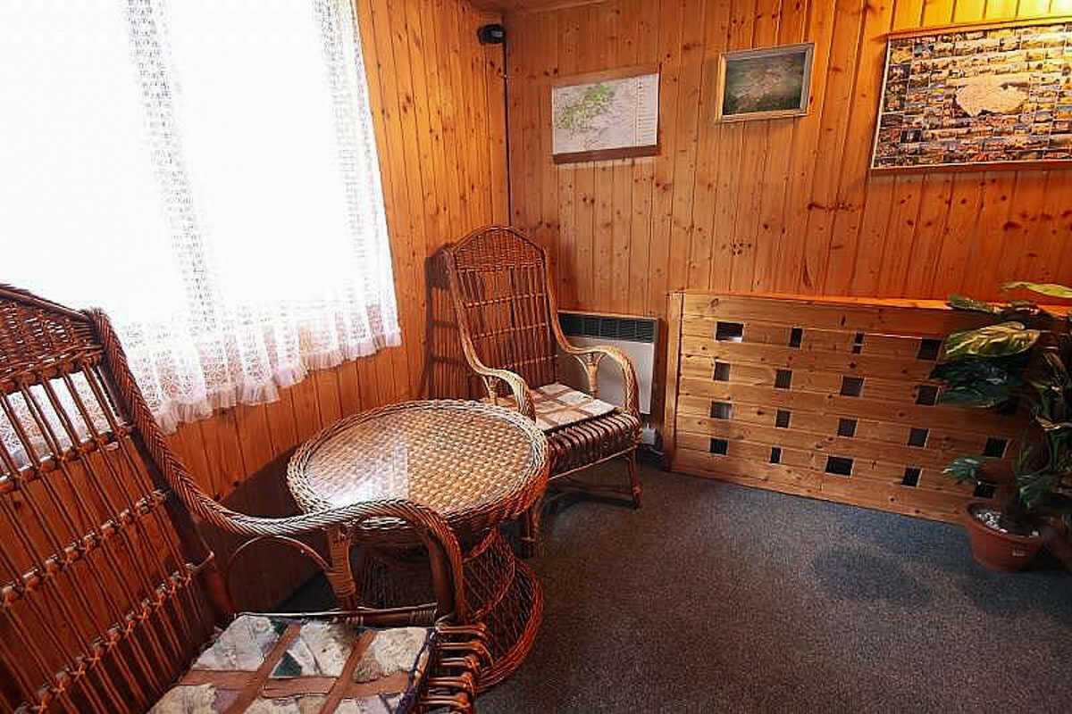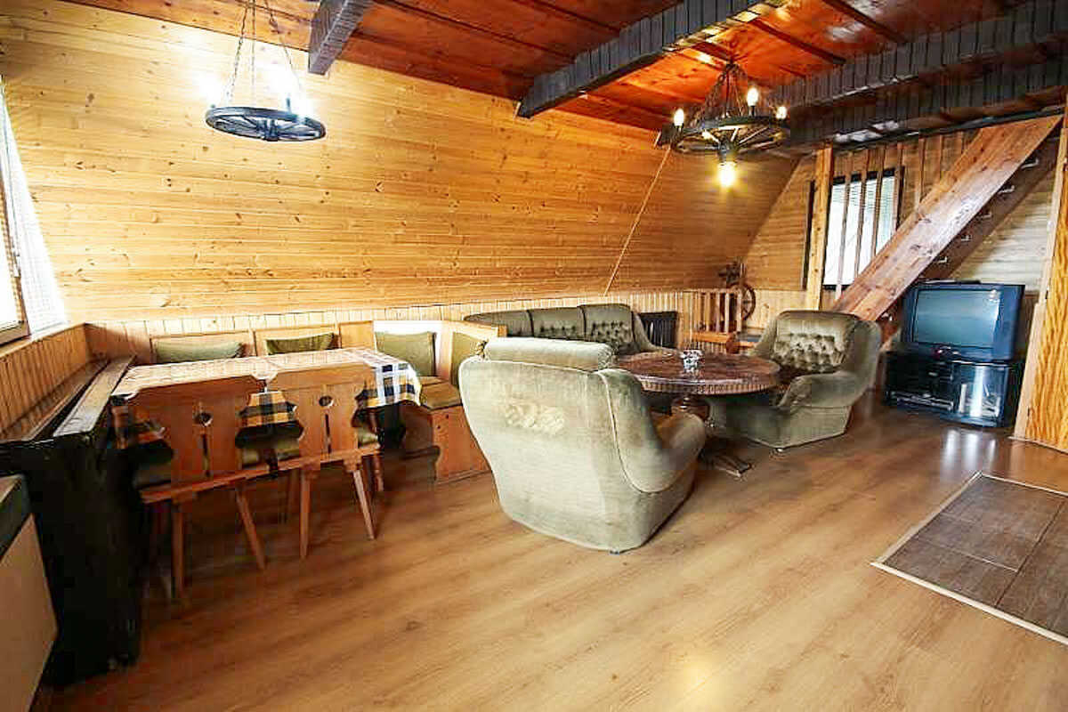Tato chata nabízí skutečně bohaté vybavení a je ideální pro hosty, kteří chtějí spojit horské prostředí s maximálním pohodlím. V přízemí se nachází útulná společenská místnost s krbem, sedací soupravou, satelitní TV a Wi-Fi připojením. Na ni navazuje kuchyň s veškerým vybavením – elektrický sporák, myčka, mikrovlnka, lednice i překapávač na kávu.