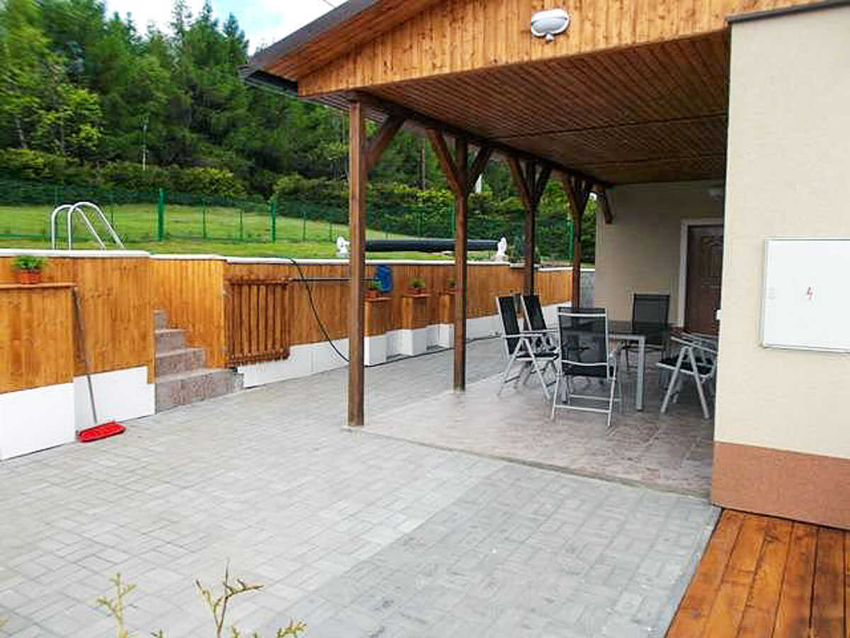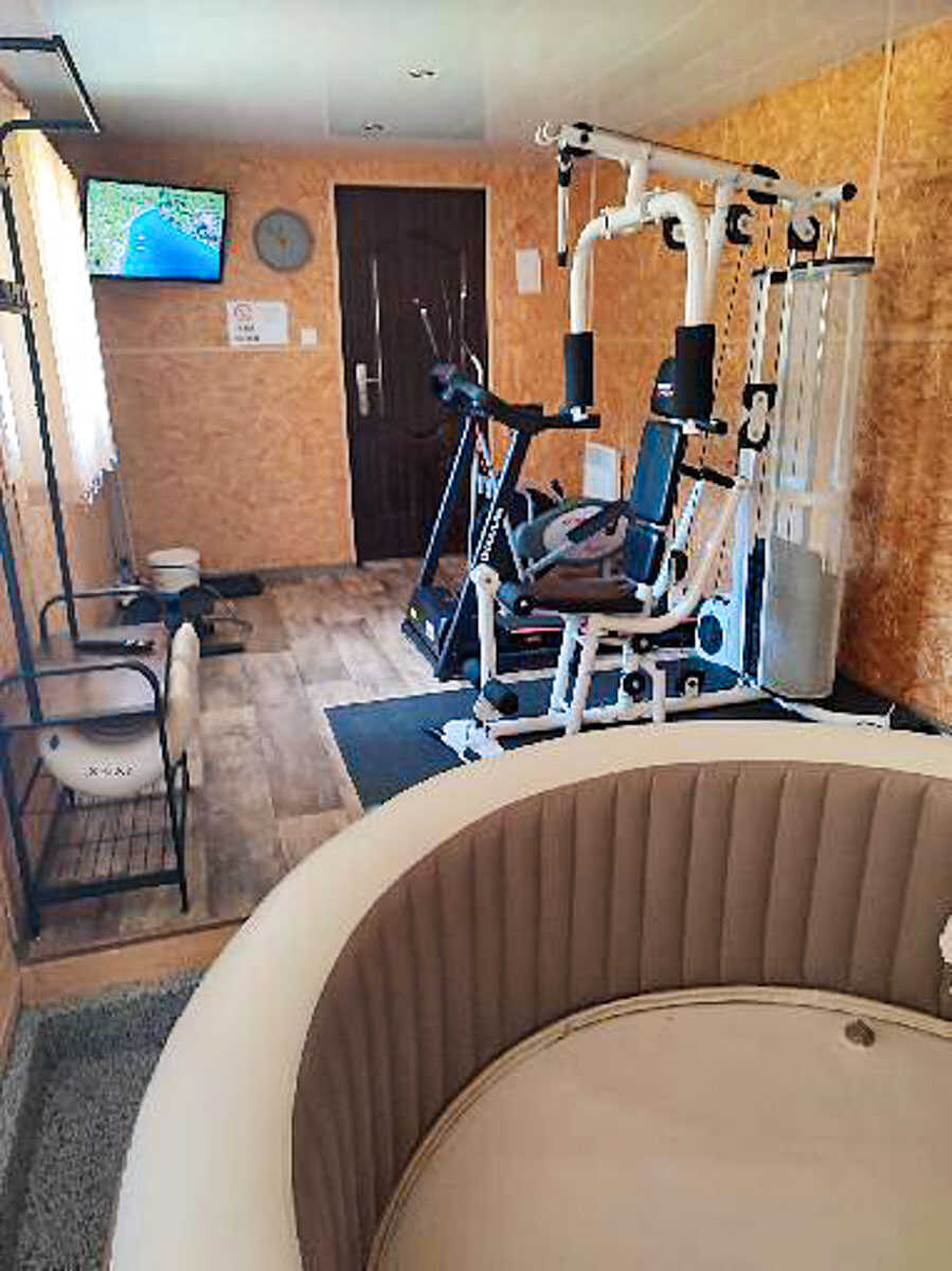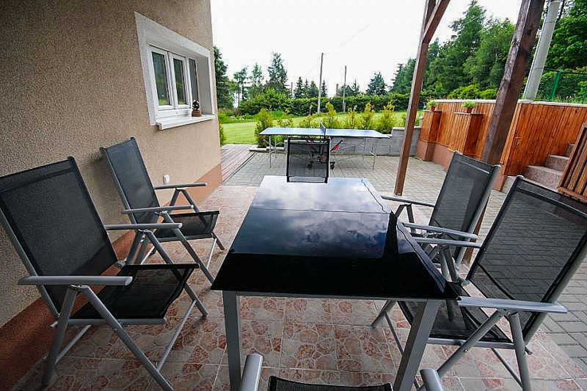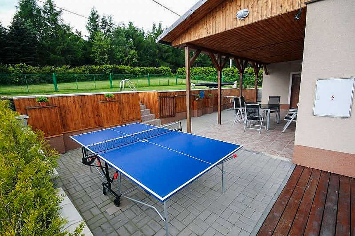 Zázemí chaty doplňuje velkorysá koupelna s infrasaunou, pračkou a sušičkou, wellness s vířivkou a fitness zóna s běžeckým pásem, orbitrekem a posilovacím strojem. Venku najdete bazén, gril, zastřešenou terasu s nábytkem a trampolínu pro děti i dospělé. K dispozici je i badmintonová síť a pálky. Chata má tepelné čerpadlo, klimatizaci a vlastní parkovací místa pro tři vozy.