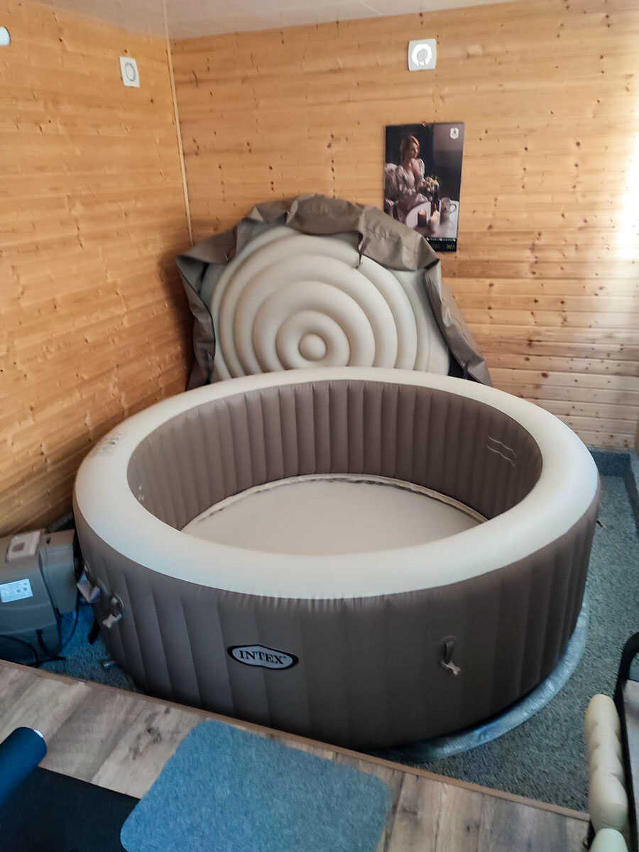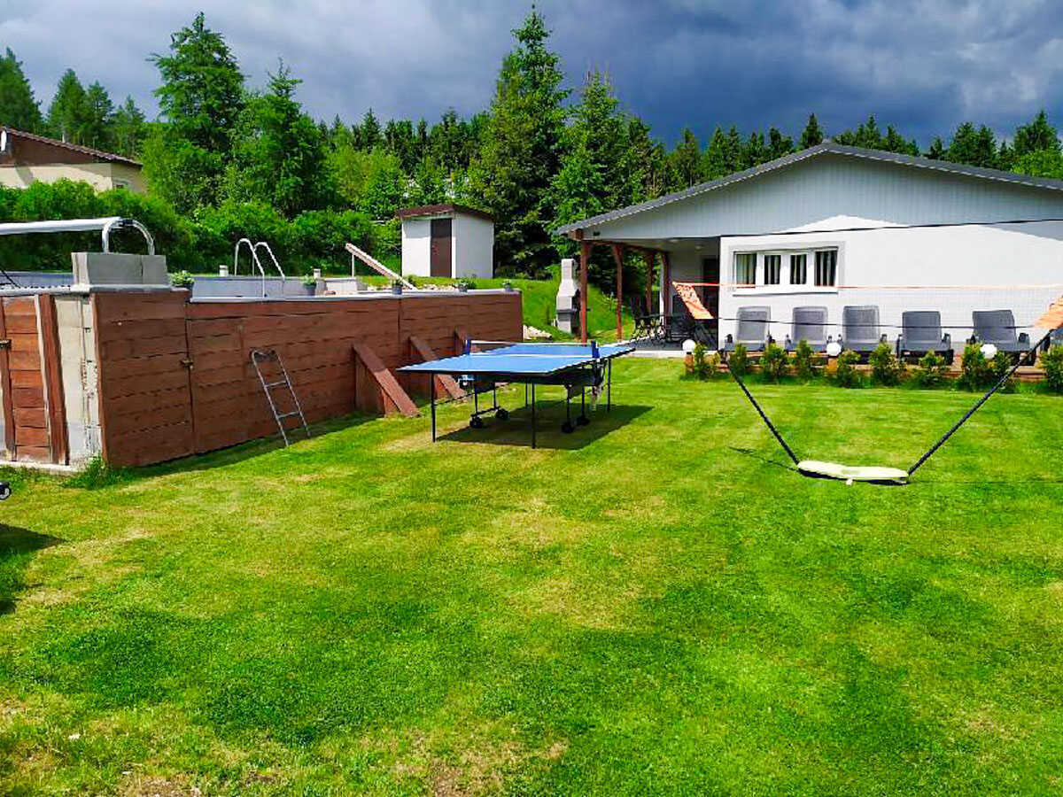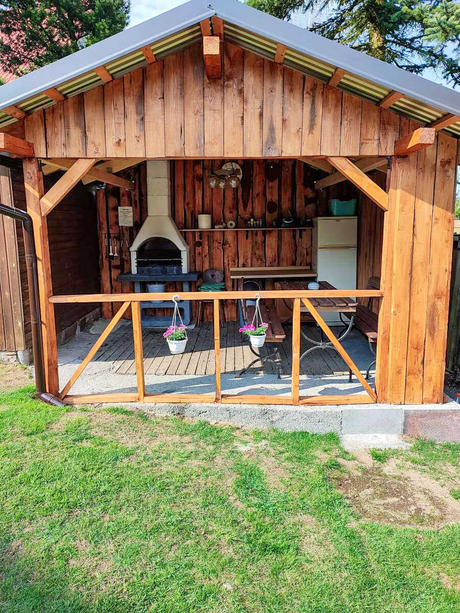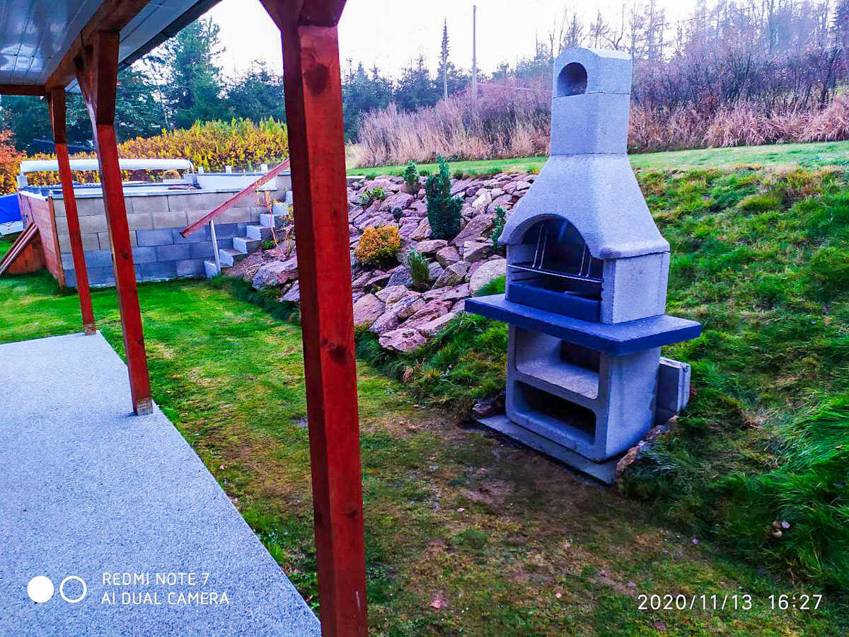Zázemí chaty doplňuje velkorysá koupelna s infrasaunou, pračkou a sušičkou, wellness s vířivkou a fitness zóna s běžeckým pásem, orbitrekem a posilovacím strojem. Venku najdete bazén, gril, zastřešenou terasu s nábytkem a trampolínu pro děti i dospělé. K dispozici je i badmintonová síť a pálky. Chata má tepelné čerpadlo, klimatizaci a vlastní parkovací místa pro tři vozy.