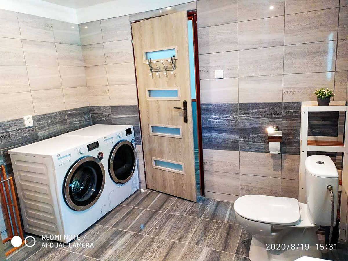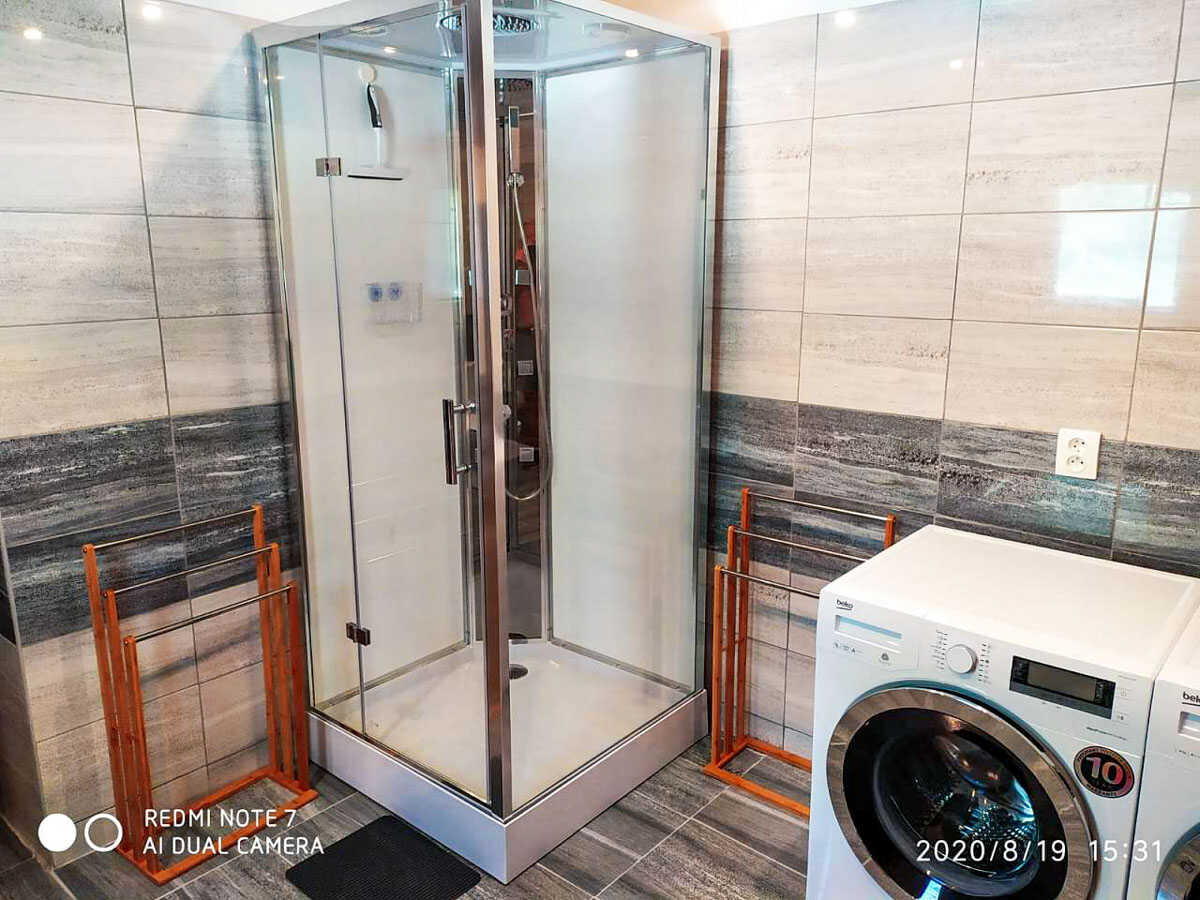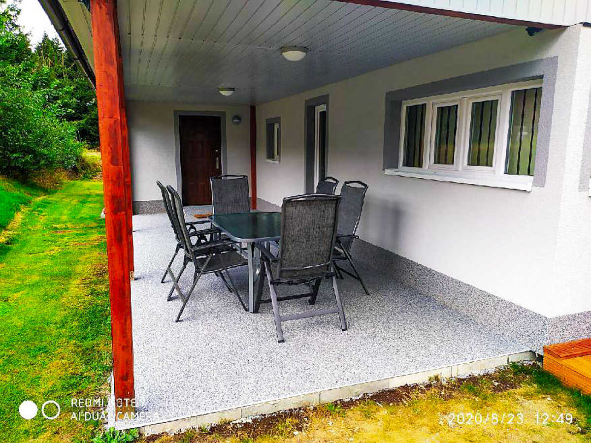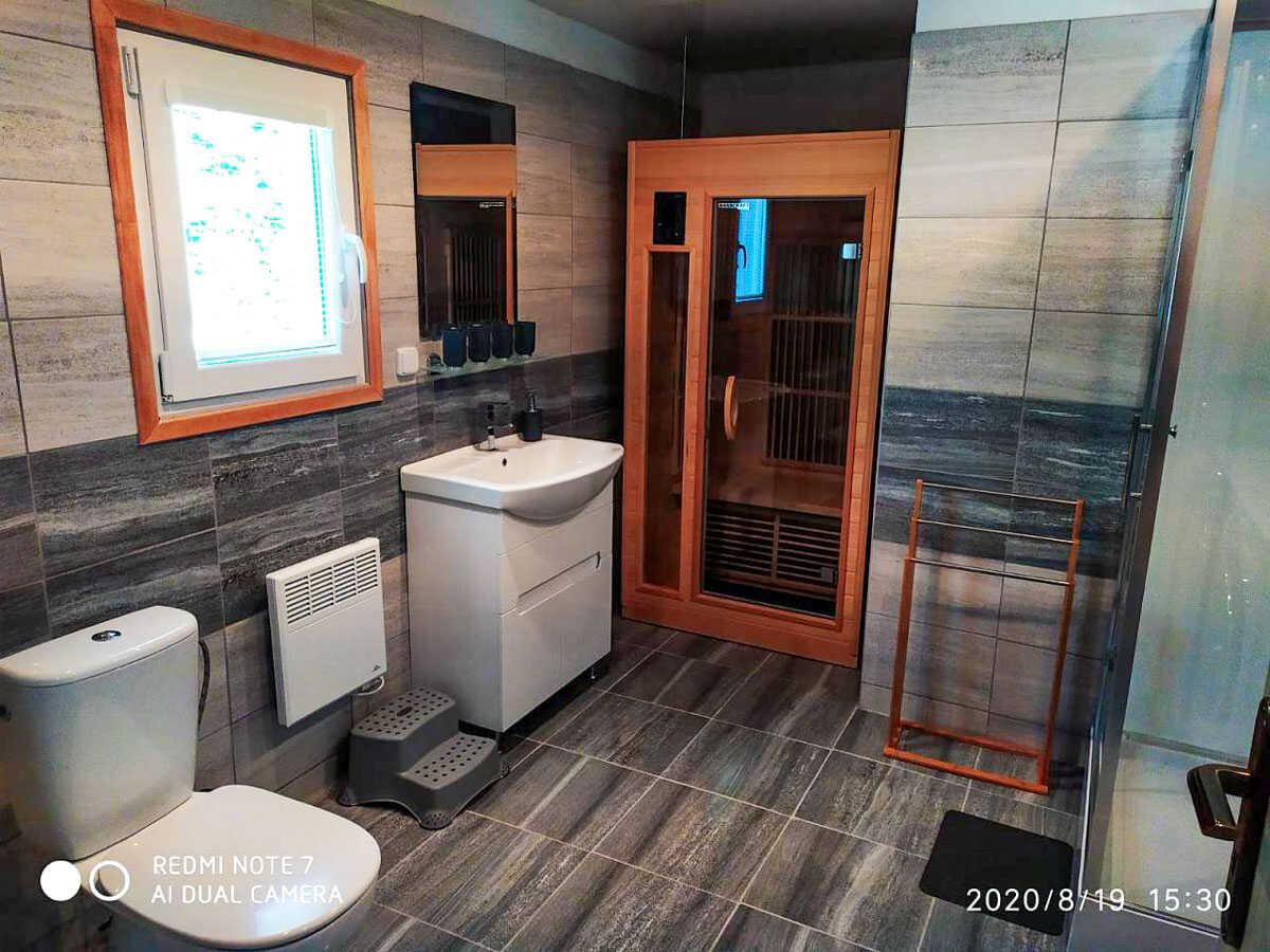 Zázemí chaty doplňuje velkorysá koupelna s infrasaunou, pračkou a sušičkou, wellness s vířivkou a fitness zóna s běžeckým pásem, orbitrekem a posilovacím strojem. Venku najdete bazén, gril, zastřešenou terasu s nábytkem a trampolínu pro děti i dospělé. K dispozici je i badmintonová síť a pálky. Chata má tepelné čerpadlo, klimatizaci a vlastní parkovací místa pro tři vozy.