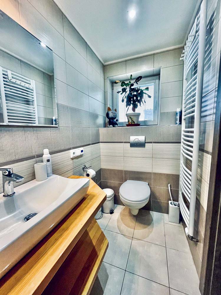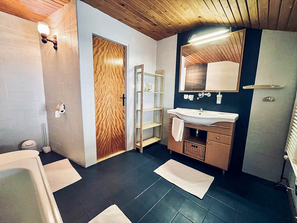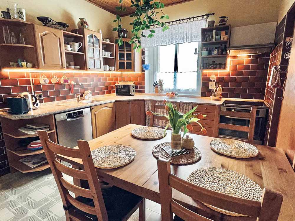 K dispozici jsou dvě moderní koupelny – jedna v přízemí se sprchovým koutem a druhá v patře s vanou, ideální pro relaxaci po aktivním dni. Součástí domu je také plně vybavená kuchyň s myčkou nádobí, elektrickou troubou, varnou deskou, mikrovlnnou troubou, lednicí s mrazákem, rychlovarnou konvicí a kompletním kuchyňským vybavením. V jídelní části se pohodlně usadí celá rodina či skupina přátel.