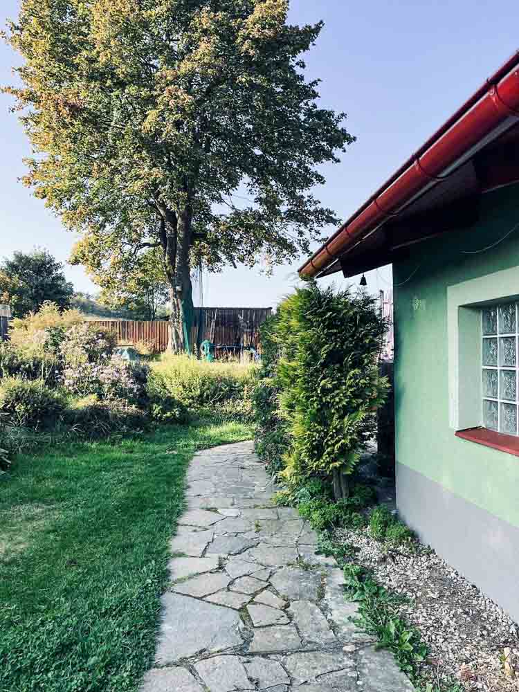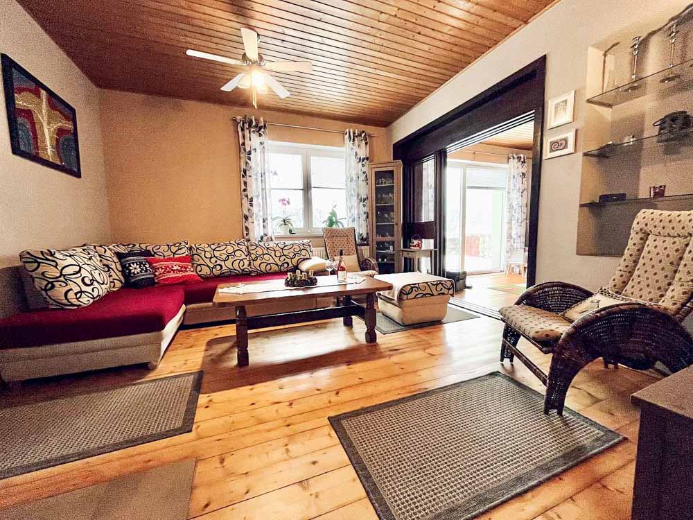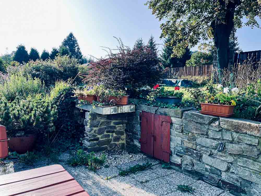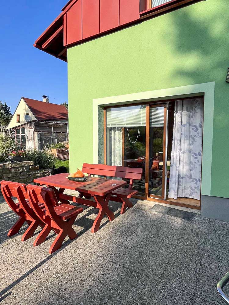 Z obývacího pokoje se vychází na prostornou terasu s posezením, která plynule přechází do zahrady s grilem, ohništěm a trampolínou. Oplocený pozemek poskytuje naprosté soukromí a bezpečí pro děti i čtyřnohé mazlíčky, kteří jsou zde vítáni.