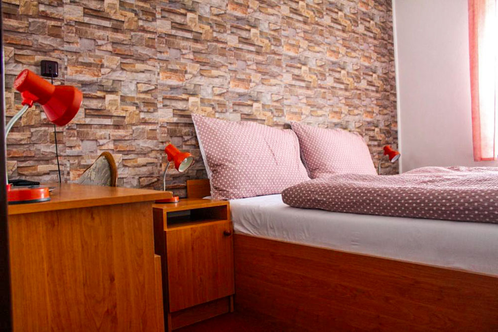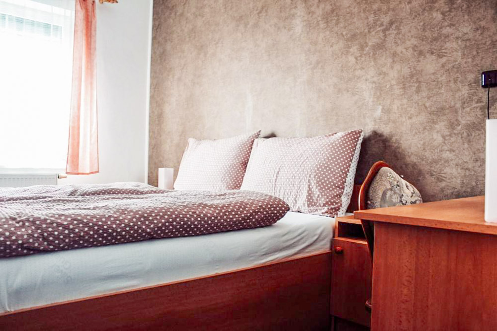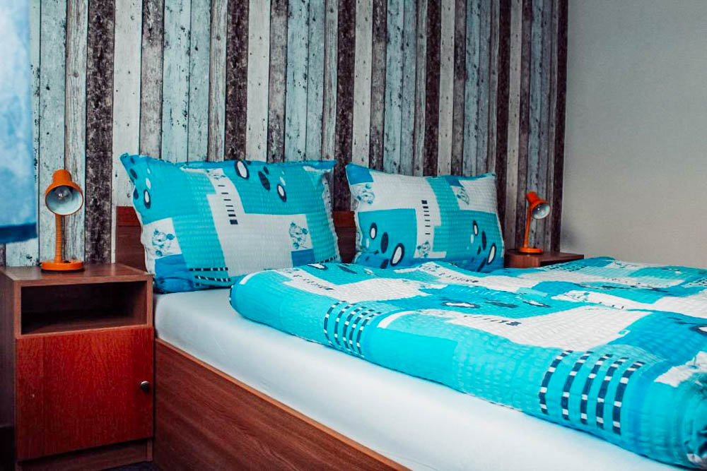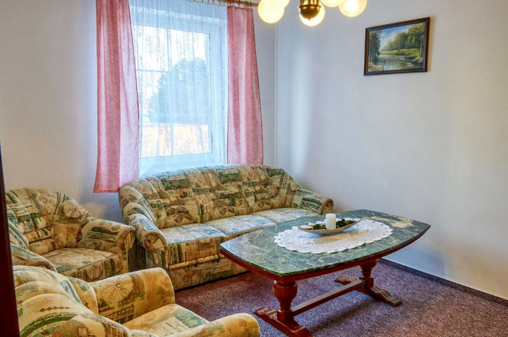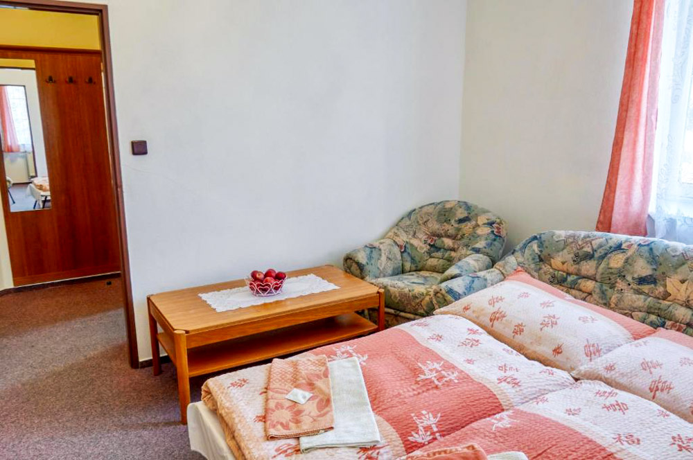 Rodinný pokoj je ideální pro 3–4 osoby a nabízí manželskou postel a rozkládací sofa. Výhodou je více prostoru a flexibilita pro rodiny s dětmi.